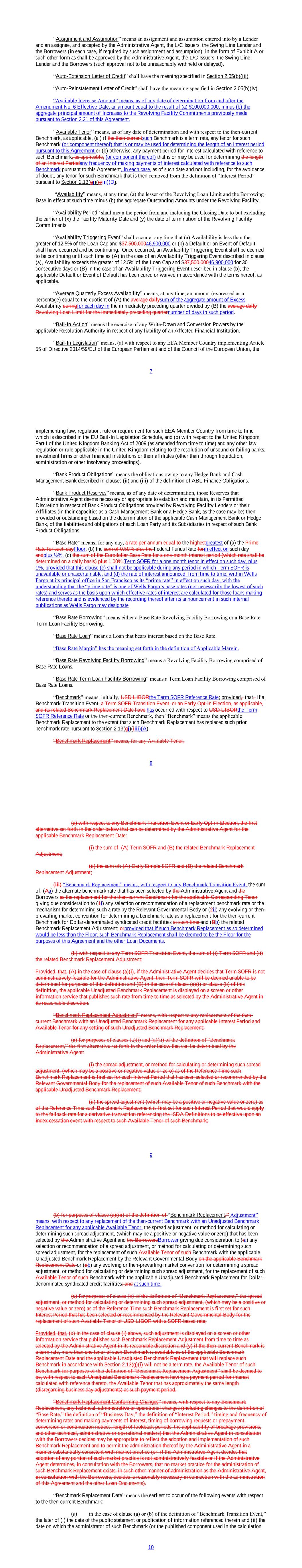 7 “Assignment and Assumption” means an assignment and assumption entered into by a Lender and an assignee, and accepted by the Administrative Agent, the L/C Issuers, the Swing Line Lender and the Borrowers (in each case, if required by such assignment and assumption), in the form of Exhibit A or such other form as shall be approved by the Administrative Agent, the L/C Issuers, the Swing Line Lender and the Borrowers (such approval not to be unreasonably withheld or delayed). “Auto-Extension Letter of Credit” shall have the meaning specified in Section 2.05(b)(iii). “Auto-Reinstatement Letter of Credit” shall have the meaning specified in Section 2.05(b)(iv). “Available Increase Amount” means, as of any date of determination from and after the Amendment No. 6 Effective Date, an amount equal to the result of (a) $100,000,000, minus (b) the aggregate principal amount of Increases to the Revolving Facility Commitments previously made pursuant to Section 2.21 of this Agreement. “Available Tenor” means, as of any date of determination and with respect to the then-current Benchmark, as applicable, (a ) if the then-currentsuch Benchmark is a term rate, any tenor for such Benchmark (or component thereof) that is or may be used for determining the length of an interest period pursuant to this Agreement or (b) otherwise, any payment period for interest calculated with reference to such Benchmark, as applicable, (or component thereof) that is or may be used for determining the length of an Interest Periodany frequency of making payments of interest calculated with reference to such Benchmark pursuant to this Agreement, in each case, as of such date and not including, for the avoidance of doubt, any tenor for such Benchmark that is then-removed from the definition of “Interest Period” pursuant to Section 2.13(gj)(iviii)(D). “Availability” means, at any time, (a) the lesser of the Revolving Loan Limit and the Borrowing Base in effect at such time minus (b) the aggregate Outstanding Amounts under the Revolving Facility. “Availability Period” shall mean the period from and including the Closing Date to but excluding the earlier of (x) the Facility Maturity Date and (y) the date of termination of the Revolving Facility Commitments. “Availability Triggering Event” shall occur at any time that (a) Availability is less than the greater of 12.5% of the Loan Cap and $37,500,00046,900,000 or (b) a Default or an Event of Default shall have occurred and be continuing. Once occurred, an Availability Triggering Event shall be deemed to be continuing until such time as (A) in the case of an Availability Triggering Event described in clause (a), Availability exceeds the greater of 12.5% of the Loan Cap and $37,500,00046,900,000 for 30 consecutive days or (B) in the case of an Availability Triggering Event described in clause (b), the applicable Default or Event of Default has been cured or waived in accordance with the terms hereof, as applicable. “Average Quarterly Excess Availability” means, at any time, an amount (expressed as a percentage) equal to the quotient of (A) the average dailysum of the aggregate amount of Excess Availability duringfor each day in the immediately preceding quarter divided by (B) the average daily Revolving Loan Limit for the immediately preceding quarternumber of days in such period. “Bail-In Action” means the exercise of any Write-Down and Conversion Powers by the applicable Resolution Authority in respect of any liability of an Affected Financial Institution. “Bail-In Legislation” means, (a) with respect to any EEA Member Country implementing Article 55 of Directive 2014/59/EU of the European Parliament and of the Council of the European Union, the 8 implementing law, regulation, rule or requirement for such EEA Member Country from time to time which is described in the EU Bail-In Legislation Schedule, and (b) with respect to the United Kingdom, Part I of the United Kingdom Banking Act of 2009 (as amended from time to time) and any other law, regulation or rule applicable in the United Kingdom relating to the resolution of unsound or failing banks, investment firms or other financial institutions or their affiliates (other than through liquidation, administration or other insolvency proceedings). “Bank Product Obligations” means the obligations owing to any Hedge Bank and Cash Management Bank described in clauses (ii) and (iii) of the definition of ABL Finance Obligations. “Bank Product Reserves” means, as of any date of determination, those Reserves that Administrative Agent deems necessary or appropriate to establish and maintain, in its Permitted Discretion in respect of Bank Product Obligations provided by Revolving Facility Lenders or their Affiliates (in their capacities as a Cash Management Bank or a Hedge Bank, as the case may be) then provided or outstanding based on the determination of the applicable Cash Management Bank or Hedge Bank, of the liabilities and obligations of each Loan Party and its Subsidiaries in respect of such Bank Product Obligations. “Base Rate” means, for any day, a rate per annum equal to the highestgreatest of (a) the Prime Rate for such dayFloor, (b) the sum of 0.50% plus the Federal Funds Rate forin effect on such day andplus ½%, (c) the sum of the Eurodollar Base Rate for a one-month interest period (which rate shall be determined on a daily basis) plus 1.00%.Term SOFR for a one month tenor in effect on such day, plus 1%, provided that this clause (c) shall not be applicable during any period in which Term SOFR is unavailable or unascertainable, and (d) the rate of interest announced, from time to time, within Wells Fargo at its principal office in San Francisco as its “prime rate” in effect on such day, with the understanding that the “prime rate” is one of Wells Fargo’s base rates (not necessarily the lowest of such rates) and serves as the basis upon which effective rates of 