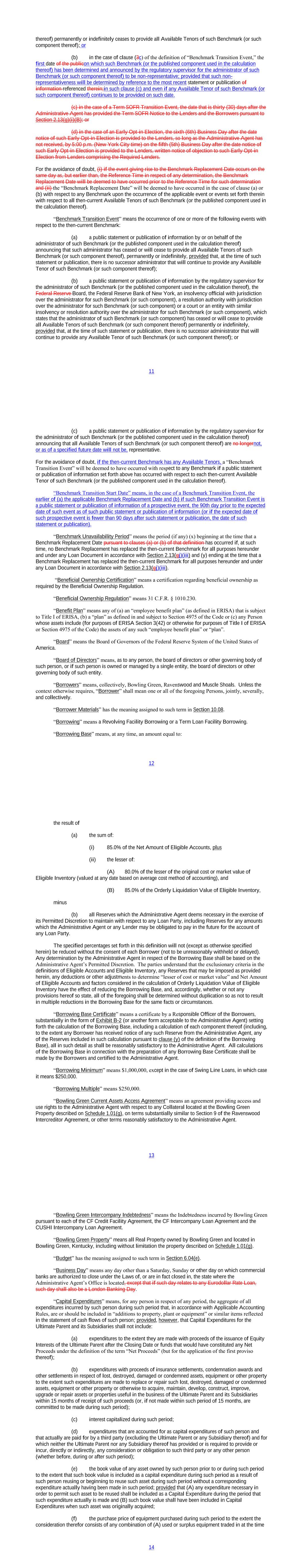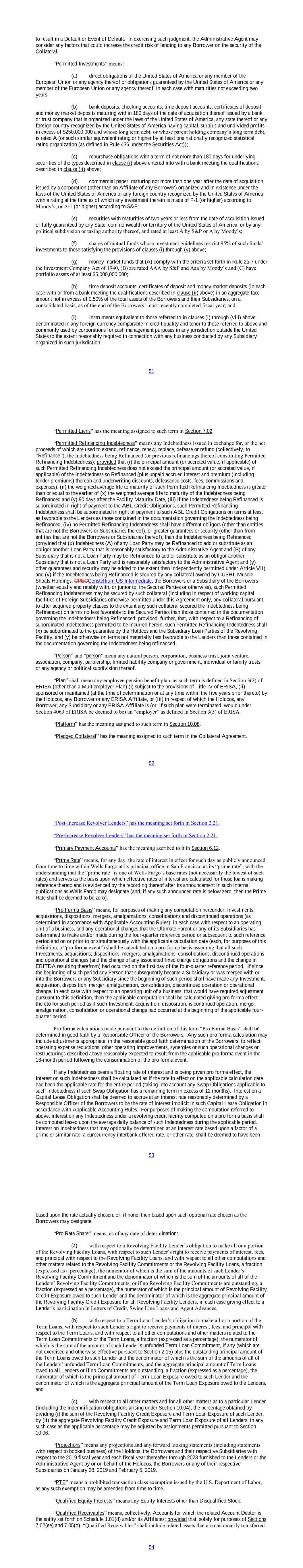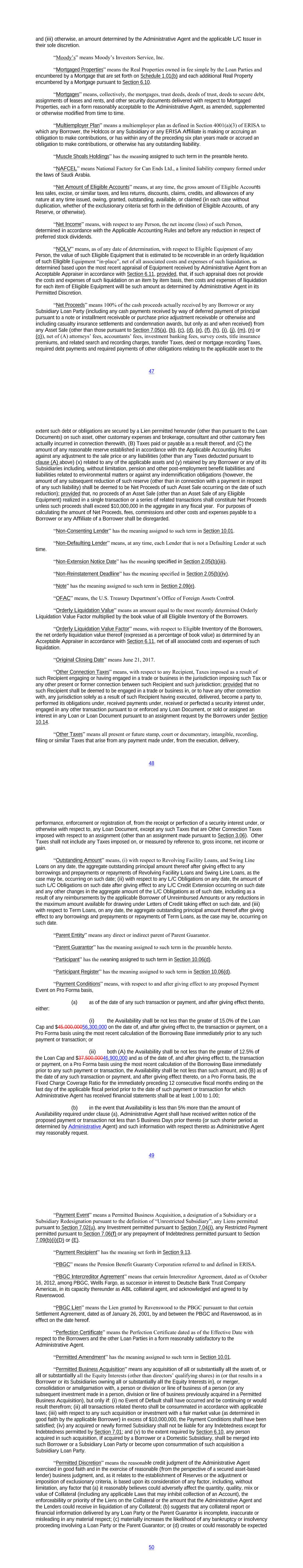 55 in or in respect of which security interests are customarily granted in connection with asset securitization transactions or factoring transactions involving accounts receivable. “Qualified Receivables Financing” means (A) the Receivables Financing pursuant to the Factoring Facilities (including any increase in the amount thereof); and (B) any Receivables Financing that meets the following conditions: (a) the Ultimate Parent or the applicable Subsidiary thereof shall have determined in good faith that such Receivables Financing (including financing terms, covenants, termination events and other provisions) is in the aggregate economically fair and reasonable to the Ultimate Parent or the applicable Subsidiary thereof in question; (b) all sales of accounts receivable and related assets are made at fair market value; (c) the financing terms, covenants, termination events and other provisions thereof shall be market terms (as determined in good faith by the Ultimate Parent or the applicable Subsidiary thereof) and may include Standard Undertakings; (d) if requested by the Administrative Agent, the lender or purchaser in connection with such Qualified Receivables Financing shall have entered into an intercreditor agreement with the Administrative Agent, in form and substance reasonably acceptable to the Administrative Agent, relating to payments received in respect of the Qualified Receivables; and (e) payments received in respect of Qualified Receivables that constitute Collateral shall be deposited in accounts and otherwise handled in a manner reasonably acceptable to the Administrative Agent. “Ravenswood Intercreditor Agreement” means that certain Intercreditor Agreement, dated as of the Original Closing Date, among Ravenswood, CUSHI, Wells Fargo, in its capacity thereunder as ABL agent, and the Secured Notes Collateral AgentDeutsche Bank Trust Company Americas. “Real Property” means, collectively, all right, title and interest (including any leasehold estate) in and to any and all parcels of or interests in real property owned in fee or leased by any Loan Party, together with, in each case, all easements, hereditaments and appurtenances relating thereto, all improvements and appurtenant fixtures incidental to the ownership or lease thereof. “Receivables Financing” means any transaction or series of transactions that may be entered into by the Ultimate Parent or its respective Subsidiaries pursuant to which Ultimate Parent or any such Subsidiary may sell, convey or otherwise transfer to any other Person, or may grant a security interest in, any accounts receivable (whether now existing or arising in the future) of such Subsidiary, and any assets related thereto including, without limitation, all collateral securing such accounts receivable, all contracts and all guarantees or other obligations in respect of such accounts receivable, proceeds of such accounts receivable and other assets, in each case, which are customarily transferred in or in respect of which security interests are customarily granted in connection with asset securitization transactions or factoring transactions involving accounts receivable. “Receivables Subsidiary” means the AB Receivables Subsidiary and any Specified Receivables Subsidiary. “Recipient” means the Administrative Agent, any Lender, any L/C Issuer or any other recipient of any payment to be made by or on account of any obligation of any Loan Party hereunder. 56 “Reference Time” with respect to any setting of the then-current Benchmark means (a) if such Benchmark is USD LIBOR, 11:00 a.m. (London time) on the day that is two (2) London Banking Days preceding the date of such setting, and (b) if such Benchmark is not USD LIBOR, the time determined by the Administrative Agent in its reasonable discretion. “Refinance” has the meaning assigned to such term in the definition of the term “Permitted Refinancing Indebtedness,” and “Refinanced” has a meaning correlative thereto. “Refinancing” means the refinancing of loans outstanding under the Existing Credit Agreements to occur on the Closing Date in accordance with the terms of this Agreement. “Register” has the meaning assigned to such term in Section 10.06(c). “Regulation U” means Regulation U of the Board as from time to time in effect and all official rulings and interpretations thereunder or thereof. “Regulation X” means Regulation X of the Board as from time to time in effect and all official rulings and interpretations thereunder or thereof. “Related Parties” means, with respect to any specified person, such person’s Affiliates and the respective directors, trustees, officers, representatives, employees, agents and advisors of such person and such person’s Affiliates. “Release” means any spilling, leaking, seepage, pumping, pouring, emitting, emptying, discharging, injecting, escaping, leaching, dumping, disposing, depositing, emanating or migrating in, into, onto or through the environment. “Released” has a meaning correlative to the foregoing. “Relevant Governmental Body” means the Federal Reserve Board or the Federal Reserve Bank of New York, or a committee officially endorsed or convened by the Federal Reserve Board or the Federal Reserve Bank of New York, or any successor thereto. “Remaining Present Value” means, as of any date with respect to any lease, the present value as of such date of the scheduled future lease payments with respect to such lease, determined with a discount rate equal to a market rate of interest for such lease reasonably determined at the time such lease was entered into. “Replacement Rate Conforming Changes” means, with respect to any proposed Replacement Rate, any conforming changes to the definition of Applicable Margin, Eurodollar Base Rate, Interest Period, timing and frequency of determining rates and making payments of interest and other administrative matters as may be appropriate, in 