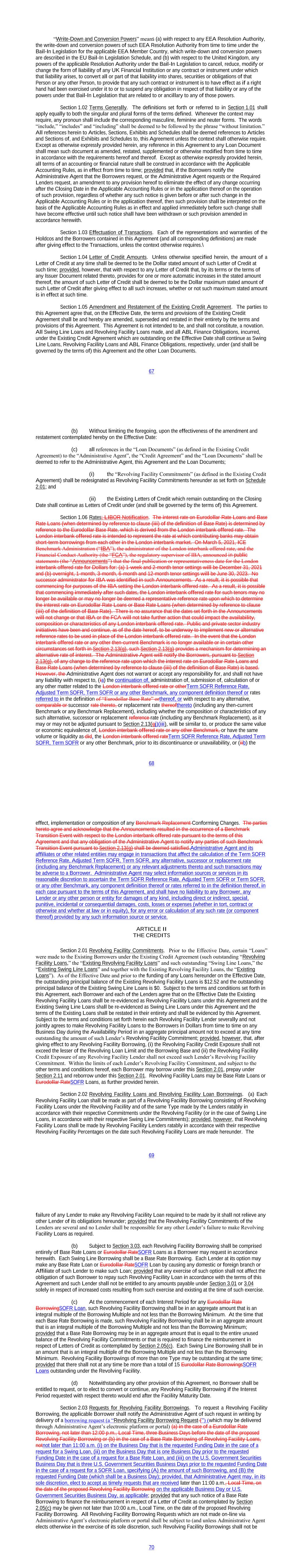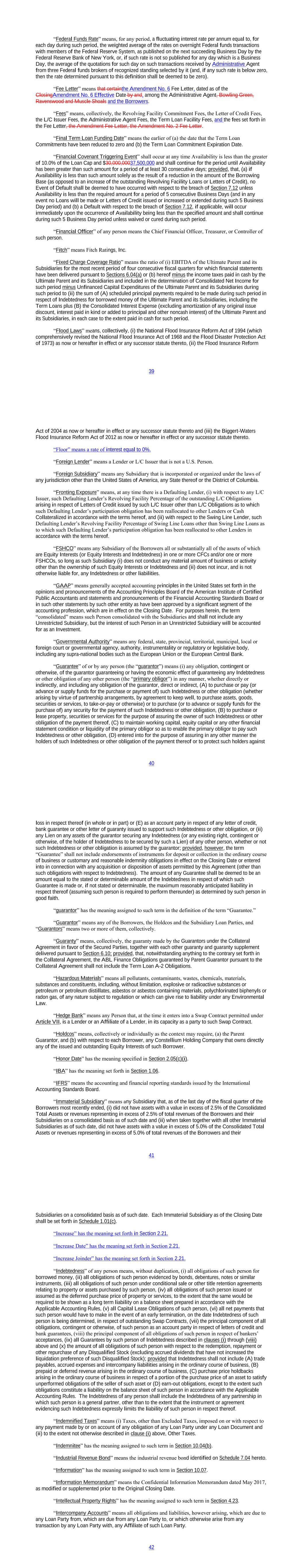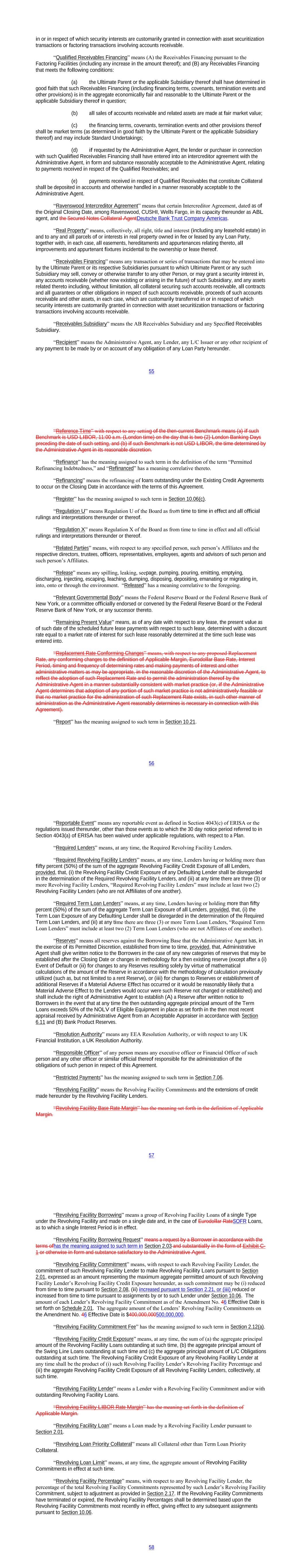 67 “Write-Down and Conversion Powers” means (a) with respect to any EEA Resolution Authority, the write-down and conversion powers of such EEA Resolution Authority from time to time under the Bail-In Legislation for the applicable EEA Member Country, which write-down and conversion powers are described in the EU Bail-In Legislation Schedule, and (b) with respect to the United Kingdom, any powers of the applicable Resolution Authority under the Bail-In Legislation to cancel, reduce, modify or change the form of liability of any UK Financial Institution or any contract or instrument under which that liability arises, to convert all or part of that liability into shares, securities or obligations of that Person or any other Person, to provide that any such contract or instrument is to have effect as if a right hand had been exercised under it to or to suspend any obligation in respect of that liability or any of the powers under that Bail-In Legislation that are related to or ancillary to any of those powers. Section 1.02 Terms Generally. The definitions set forth or referred to in Section 1.01 shall apply equally to both the singular and plural forms of the terms defined. Whenever the context may require, any pronoun shall include the corresponding masculine, feminine and neuter forms. The words “include,” “includes” and “including” shall be deemed to be followed by the phrase “without limitation.” All references herein to Articles, Sections, Exhibits and Schedules shall be deemed references to Articles and Sections of, and Exhibits and Schedules to, this Agreement unless the context shall otherwise require. Except as otherwise expressly provided herein, any reference in this Agreement to any Loan Document shall mean such document as amended, restated, supplemented or otherwise modified from time to time in accordance with the requirements hereof and thereof. Except as otherwise expressly provided herein, all terms of an accounting or financial nature shall be construed in accordance with the Applicable Accounting Rules, as in effect from time to time; provided that, if the Borrowers notify the Administrative Agent that the Borrowers request, or the Administrative Agent requests or the Required Lenders request, an amendment to any provision hereof to eliminate the effect of any change occurring after the Closing Date in the Applicable Accounting Rules or in the application thereof on the operation of such provision, regardless of whether any such notice is given before or after such change in the Applicable Accounting Rules or in the application thereof, then such provision shall be interpreted on the basis of the Applicable Accounting Rules as in effect and applied immediately before such change shall have become effective until such notice shall have been withdrawn or such provision amended in accordance herewith. Section 1.03 Effectuation of Transactions. Each of the representations and warranties of the Holdcos and the Borrowers contained in this Agreement (and all corresponding definitions) are made after giving effect to the Transactions, unless the context otherwise requires.\ Section 1.04 Letter of Credit Amounts. Unless otherwise specified herein, the amount of a Letter of Credit at any time shall be deemed to be the Dollar stated amount of such Letter of Credit at such time; provided, however, that with respect to any Letter of Credit that, by its terms or the terms of any Issuer Document related thereto, provides for one or more automatic increases in the stated amount thereof, the amount of such Letter of Credit shall be deemed to be the Dollar maximum stated amount of such Letter of Credit after giving effect to all such increases, whether or not such maximum stated amount is in effect at such time. Section 1.05 Amendment and Restatement of the Existing Credit Agreement. The parties to this Agreement agree that, on the Effective Date, the terms and provisions of the Existing Credit Agreement shall be and hereby are amended, superseded and restated in their entirety by the terms and provisions of this Agreement. This Agreement is not intended to be, and shall not constitute, a novation. All Swing Line Loans and Revolving Facility Loans made, and all ABL Finance Obligations, incurred, under the Existing Credit Agreement which are outstanding on the Effective Date shall continue as Swing Line Loans, Revolving Facility Loans and ABL Finance Obligations, respectively, under (and shall be governed by the terms of) this Agreement and the other Loan Documents. 68 (b) Without limiting the foregoing, upon the effectiveness of the amendment and restatement contemplated hereby on the Effective Date: (c) all references in the “Loan Documents” (as defined in the Existing Credit Agreement) to the “Administrative Agent”, the “Credit Agreement” and the “Loan Documents” shall be deemed to refer to the Administrative Agent, this Agreement and the Loan Documents; (i) the “Revolving Facility Commitments” (as defined in the Existing Credit Agreement) shall be redesignated as Revolving Facility Commitments hereunder as set forth on Schedule 2.01; and (ii) the Existing Letters of Credit which remain outstanding on the Closing Date shall continue as Letters of Credit under (and shall be governed by the terms of) this Agreement. Section 1.06 Rates; LIBOR Notification. The interest rate on Eurodollar Rate Loans and Base Rate Loans (when determined by reference to clause (iii) of the definition of Base Rate) is determined by reference to the Eurodollar Base Rate, which is derived from the London interbank offered rate. The London interbank offered rate is intended to represent the rate at which contributing banks may obtain short-term borrowings from each other in the London interbank market. On March 5, 2021, ICE Benchmark Administration (“IBA”), the administrator of the London interbank offered rate, and the Financial Conduct Authority (the “FCA”), the re