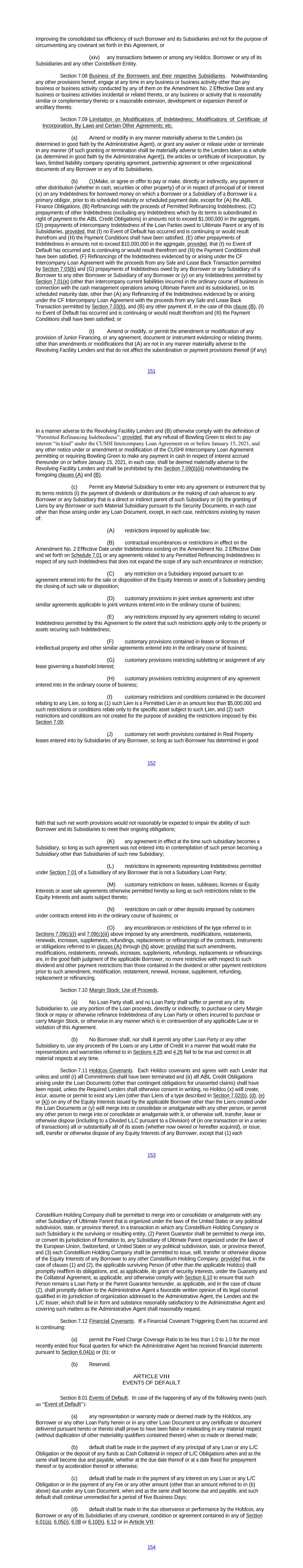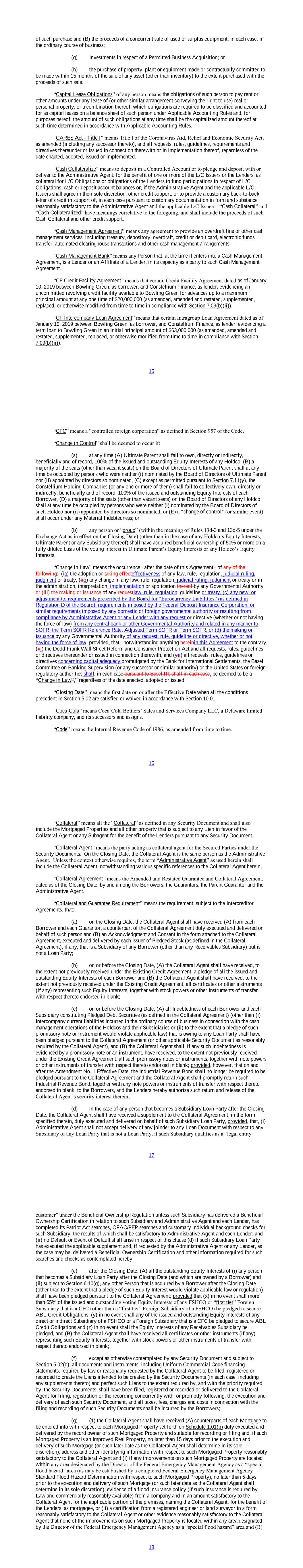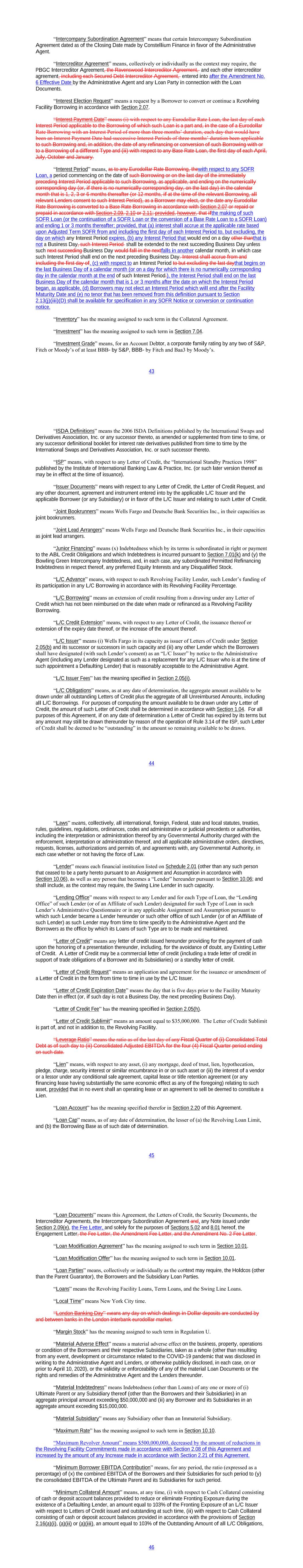 67 “Write-Down and Conversion Powers” means (a) with respect to any EEA Resolution Authority, the write-down and conversion powers of such EEA Resolution Authority from time to time under the Bail-In Legislation for the applicable EEA Member Country, which write-down and conversion powers are described in the EU Bail-In Legislation Schedule, and (b) with respect to the United Kingdom, any powers of the applicable Resolution Authority under the Bail-In Legislation to cancel, reduce, modify or change the form of liability of any UK Financial Institution or any contract or instrument under which that liability arises, to convert all or part of that liability into shares, securities or obligations of that Person or any other Person, to provide that any such contract or instrument is to have effect as if a right hand had been exercised under it to or to suspend any obligation in respect of that liability or any of the powers under that Bail-In Legislation that are related to or ancillary to any of those powers. Section 1.02 Terms Generally. The definitions set forth or referred to in Section 1.01 shall apply equally to both the singular and plural forms of the terms defined. Whenever the context may require, any pronoun shall include the corresponding masculine, feminine and neuter forms. The words “include,” “includes” and “including” shall be deemed to be followed by the phrase “without limitation.” All references herein to Articles, Sections, Exhibits and Schedules shall be deemed references to Articles and Sections of, and Exhibits and Schedules to, this Agreement unless the context shall otherwise require. Except as otherwise expressly provided herein, any reference in this Agreement to any Loan Document shall mean such document as amended, restated, supplemented or otherwise modified from time to time in accordance with the requirements hereof and thereof. Except as otherwise expressly provided herein, all terms of an accounting or financial nature shall be construed in accordance with the Applicable Accounting Rules, as in effect from time to time; provided that, if the Borrowers notify the Administrative Agent that the Borrowers request, or the Administrative Agent requests or the Required Lenders request, an amendment to any provision hereof to eliminate the effect of any change occurring after the Closing Date in the Applicable Accounting Rules or in the application thereof on the operation of such provision, regardless of whether any such notice is given before or after such change in the Applicable Accounting Rules or in the application thereof, then such provision shall be interpreted on the basis of the Applicable Accounting Rules as in effect and applied immediately before such change shall have become effective until such notice shall have been withdrawn or such provision amended in accordance herewith. Section 1.03 Effectuation of Transactions. Each of the representations and warranties of the Holdcos and the Borrowers contained in this Agreement (and all corresponding definitions) are made after giving effect to the Transactions, unless the context otherwise requires.\ Section 1.04 Letter of Credit Amounts. Unless otherwise specified herein, the amount of a Letter of Credit at any time shall be deemed to be the Dollar stated amount of such Letter of Credit at such time; provided, however, that with respect to any Letter of Credit that, by its terms or the terms of any Issuer Document related thereto, provides for one or more automatic increases in the stated amount thereof, the amount of such Letter of Credit shall be deemed to be the Dollar maximum stated amount of such Letter of Credit after giving effect to all such increases, whether or not such maximum stated amount is in effect at such time. Section 1.05 Amendment and Restatement of the Existing Credit Agreement. The parties to this Agreement agree that, on the Effective Date, the terms and provisions of the Existing Credit Agreement shall be and hereby are amended, superseded and restated in their entirety by the terms and provisions of this Agreement. This Agreement is not intended to be, and shall not constitute, a novation. All Swing Line Loans and Revolving Facility Loans made, and all ABL Finance Obligations, incurred, under the Existing Credit Agreement which are outstanding on the Effective Date shall continue as Swing Line Loans, Revolving Facility Loans and ABL Finance Obligations, respectively, under (and shall be governed by the terms of) this Agreement and the other Loan Documents. 68 (b) Without limiting the foregoing, upon the effectiveness of the amendment and restatement contemplated hereby on the Effective Date: (c) all references in the “Loan Documents” (as defined in the Existing Credit Agreement) to the “Administrative Agent”, the “Credit Agreement” and the “Loan Documents” shall be deemed to refer to the Administrative Agent, this Agreement and the Loan Documents; (i) the “Revolving Facility Commitments” (as defined in the Existing Credit Agreement) shall be redesignated as Revolving Facility Commitments hereunder as set forth on Schedule 2.01; and (ii) the Existing Letters of Credit which remain outstanding on the Closing Date shall continue as Letters of Credit under (and shall be governed by the terms of) this Agreement. Section 1.06 Rates; LIBOR Notification. The interest rate on Eurodollar Rate Loans and Base Rate Loans (when determined by reference to clause (iii) of the definition of Base Rate) is determined by reference to the Eurodollar Base Rate, which is derived from the London interbank offered rate. The London interbank offered rate is intended to represent the rate at which contributing banks may obtain short-term borrowings from each other in the London interbank market. On March 5, 2021, ICE Benchmark Administration (“IBA”), the administrator of the London interbank offered rate, and the Financial Conduct Authority (the “FCA”), the re