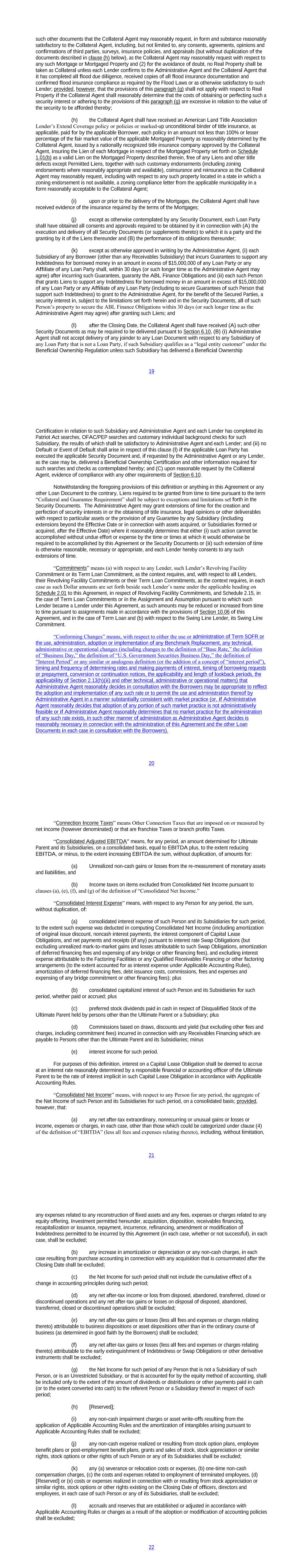 19 such other documents that the Collateral Agent may reasonably request, in form and substance reasonably satisfactory to the Collateral Agent, including, but not limited to, any consents, agreements, opinions and confirmations of third parties, surveys, insurance policies, and appraisals (but without duplication of the documents described in clause (h) below), as the Collateral Agent may reasonably request with respect to any such Mortgage or Mortgaged Property and (2) for the avoidance of doubt, no Real Property shall be taken as Collateral unless each Lender confirms to the Administrative Agent and the Collateral Agent that it has completed all flood due diligence, received copies of all flood insurance documentation and confirmed flood insurance compliance as required by the Flood Laws or as otherwise satisfactory to such Lender; provided, however, that the provisions of this paragraph (g) shall not apply with respect to Real Property if the Collateral Agent shall reasonably determine that the costs of obtaining or perfecting such a security interest or adhering to the provisions of this paragraph (g) are excessive in relation to the value of the security to be afforded thereby; (h) the Collateral Agent shall have received an American Land Title Association Lender’s Extend Coverage policy or policies or marked-up unconditional binder of title insurance, as applicable, paid for by the applicable Borrower, each policy in an amount not less than 100% or lesser percentage of the fair market value of the applicable Mortgaged Property as reasonably determined by the Collateral Agent, issued by a nationally recognized title insurance company approved by the Collateral Agent, insuring the Lien of each Mortgage in respect of the Mortgaged Property set forth on Schedule 1.01(b) as a valid Lien on the Mortgaged Property described therein, free of any Liens and other title defects except Permitted Liens, together with such customary endorsements (including zoning endorsements where reasonably appropriate and available), coinsurance and reinsurance as the Collateral Agent may reasonably request, including with respect to any such property located in a state in which a zoning endorsement is not available, a zoning compliance letter from the applicable municipality in a form reasonably acceptable to the Collateral Agent; (i) upon or prior to the delivery of the Mortgages, the Collateral Agent shall have received evidence of the insurance required by the terms of the Mortgages; (j) except as otherwise contemplated by any Security Document, each Loan Party shall have obtained all consents and approvals required to be obtained by it in connection with (A) the execution and delivery of all Security Documents (or supplements thereto) to which it is a party and the granting by it of the Liens thereunder and (B) the performance of its obligations thereunder; (k) except as otherwise approved in writing by the Administrative Agent, (i) each Subsidiary of any Borrower (other than any Receivables Subsidiary) that incurs Guarantees to support any Indebtedness for borrowed money in an amount in excess of $15,000,000 of any Loan Party or any Affiliate of any Loan Party shall, within 30 days (or such longer time as the Administrative Agent may agree) after incurring such Guarantees, guaranty the ABL Finance Obligations and (ii) each such Person that grants Liens to support any Indebtedness for borrowed money in an amount in excess of $15,000,000 of any Loan Party or any Affiliate of any Loan Party (including to secure Guarantees of such Person that support such Indebtedness) to grant to the Administrative Agent, for the benefit of the Secured Parties, a security interest in, subject to the limitations set forth herein and in the Security Documents, all of such Person’s property to secure the ABL Finance Obligations within 30 days (or such longer time as the Administrative Agent may agree) after granting such Liens; and (l) after the Closing Date, the Collateral Agent shall have received (A) such other Security Documents as may be required to be delivered pursuant to Section 6.10, (B) (i) Administrative Agent shall not accept delivery of any joinder to any Loan Document with respect to any Subsidiary of any Loan Party that is not a Loan Party, if such Subsidiary qualifies as a “legal entity customer” under the Beneficial Ownership Regulation unless such Subsidiary has delivered a Beneficial Ownership 20 Certification in relation to such Subsidiary and Administrative Agent and each Lender has completed its Patriot Act searches, OFAC/PEP searches and customary individual background checks for such Subsidiary, the results of which shall be satisfactory to Administrative Agent and each Lender; and (ii) no Default or Event of Default shall arise in respect of this clause (l) if the applicable Loan Party has executed the applicable Security Document and, if requested by the Administrative Agent or any Lender, as the case may be, delivered a Beneficial Ownership Certification and other information required for such searches and checks as contemplated hereby; and (C) upon reasonable request by the Collateral Agent, evidence of compliance with any other requirements of Section 6.10. Notwithstanding the foregoing provisions of this definition or anything in this Agreement or any other Loan Document to the contrary, Liens required to be granted from time to time pursuant to the term “Collateral and Guarantee Requirement” shall be subject to exceptions and limitations set forth in the Security Documents. The Administrative Agent may grant extensions of time for the creation and perfection of security interests in or the obtaining of title insurance, legal opinions or other deliverables with respect to particular assets or the provision of any Guarantee by any Subsidiary (including extensions beyond the Effective Date or in connection with assets acquired, or Subsidiaries formed or acquired, after the Effective Da