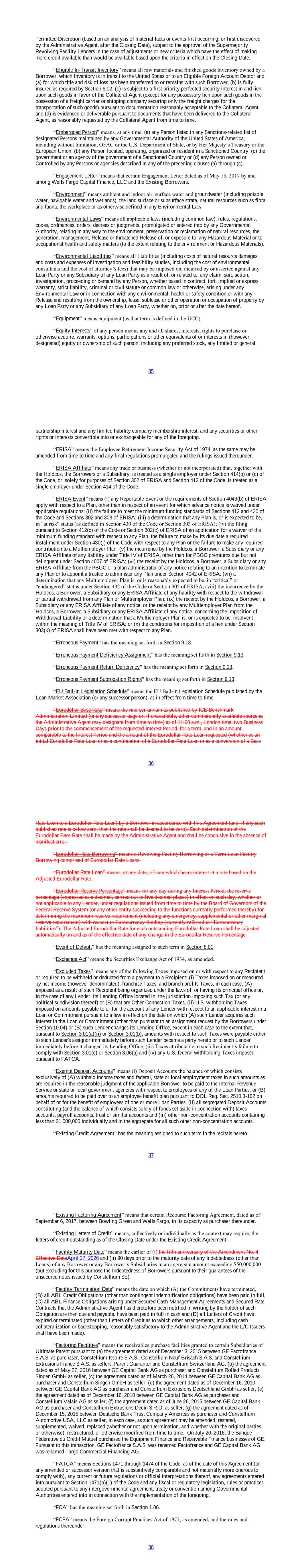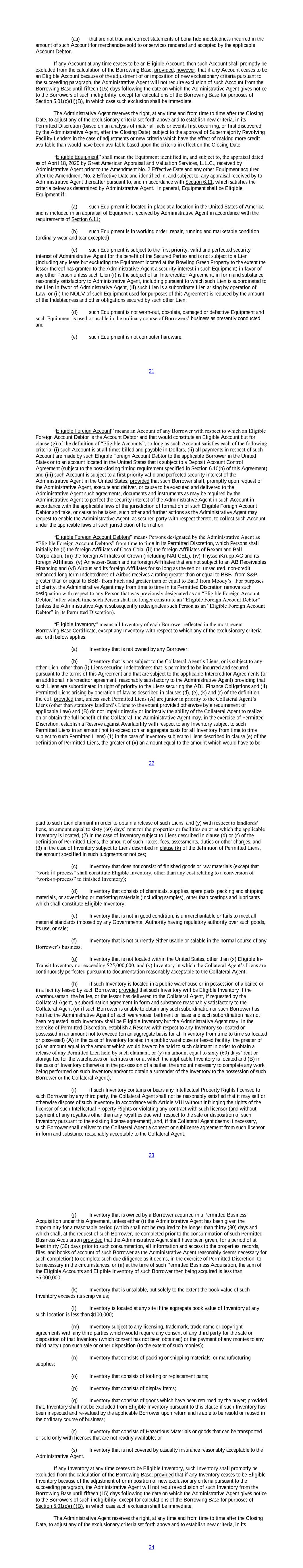 31 (aa) that are not true and correct statements of bona fide indebtedness incurred in the amount of such Account for merchandise sold to or services rendered and accepted by the applicable Account Debtor. If any Account at any time ceases to be an Eligible Account, then such Account shall promptly be excluded from the calculation of the Borrowing Base; provided, however, that if any Account ceases to be an Eligible Account because of the adjustment of or imposition of new exclusionary criteria pursuant to the succeeding paragraph, the Administrative Agent will not require exclusion of such Account from the Borrowing Base until fifteen (15) days following the date on which the Administrative Agent gives notice to the Borrowers of such ineligibility, except for calculations of the Borrowing Base for purposes of Section 5.01(c)(ii)(B), in which case such exclusion shall be immediate. The Administrative Agent reserves the right, at any time and from time to time after the Closing Date, to adjust any of the exclusionary criteria set forth above and to establish new criteria, in its Permitted Discretion (based on an analysis of material facts or events first occurring, or first discovered by the Administrative Agent, after the Closing Date), subject to the approval of Supermajority Revolving Facility Lenders in the case of adjustments or new criteria which have the effect of making more credit available than would have been available based upon the criteria in effect on the Closing Date. “Eligible Equipment” shall mean the Equipment identified in, and subject to, the appraisal dated as of April 18, 2020 by Great American Appraisal and Valuation Services, L.L.C., received by Administrative Agent prior to the Amendment No. 2 Effective Date and any other Equipment acquired after the Amendment No. 2 Effective Date and identified in, and subject to, any appraisal received by to Administrative Agent thereafter pursuant to, and in accordance with Section 6.11, which satisfies the criteria below as determined by Administrative Agent. In general, Equipment shall be Eligible Equipment if: (a) such Equipment is located in-place at a location in the United States of America and is included in an appraisal of Equipment received by Administrative Agent in accordance with the requirements of Section 6.11; (b) such Equipment is in working order, repair, running and marketable condition (ordinary wear and tear excepted); (c) such Equipment is subject to the first priority, valid and perfected security interest of Administrative Agent for the benefit of the Secured Parties and is not subject to a Lien (including any lease but excluding the Equipment located at the Bowling Green Property to the extent the lessor thereof has granted to the Administrative Agent a security interest in such Equipment) in favor of any other Person unless such Lien (i) is the subject of an Intercreditor Agreement, in form and substance reasonably satisfactory to Administrative Agent, including pursuant to which such Lien is subordinated to the Lien in favor of Administrative Agent, (ii) such Lien is a subordinate Lien arising by operation of Law, or (ii) the NOLV of such Equipment used for purposes of this Agreement is reduced by the amount of the Indebtedness and other obligations secured by such other Lien; (d) such Equipment is not worn-out, obsolete, damaged or defective Equipment and such Equipment is used or usable in the ordinary course of Borrowers’ business as presently conducted; and (e) such Equipment is not computer hardware. 32 “Eligible Foreign Account” means an Account of any Borrower with respect to which an Eligible Foreign Account Debtor is the Account Debtor and that would constitute an Eligible Account but for clause (g) of the definition of “Eligible Accounts”, so long as such Account satisfies each of the following criteria: (i) such Account is at all times billed and payable in Dollars, (ii) all payments in respect of such Account are made by such Eligible Foreign Account Debtor to the applicable Borrower in the United States or to an account located in the United States that is subject to a Deposit Account Control Agreement (subject to the post-closing timing requirement specified in Section 6.10(h) of this Agreement) and (iii) such Account is subject to a first priority valid and perfected security interest of the Administrative Agent in the United States; provided that such Borrower shall, promptly upon request of the Administrative Agent, execute and deliver, or cause to be executed and delivered to the Administrative Agent such agreements, documents and instruments as may be required by the Administrative Agent to perfect the security interest of the Administrative Agent in such Account in accordance with the applicable laws of the jurisdiction of formation of such Eligible Foreign Account Debtor and take, or cause to be taken, such other and further actions as the Administrative Agent may request to enable the Administrative Agent, as secured party with respect thereto, to collect such Account under the applicable laws of such jurisdiction of formation. “Eligible Foreign Account Debtors” means Persons designated by the Administrative Agent as “Eligible Foreign Account Debtors” from time to time in its Permitted Discretion, which Persons shall initially be (i) the foreign Affiliates of Coca-Cola, (ii) the foreign Affiliates of Rexam and Ball Corporation, (iii) the foreign Affiliates of Crown (including NAFCEL), (iv) ThyssenKrupp AG and its foreign Affiliates, (v) Anheuser-Busch and its foreign Affiliates that are not subject to an AB Receivables Financing and (vi) Airbus and its foreign Affiliates for so long as the senior, unsecured, non-credit enhanced long term Indebtedness of Airbus receives a rating greater than or equal to BBB- from S&P, greater than or equal to BBB- from Fitch and greater than or equal to Baa3 from Moody’s. For purposes of clarity, the Administrative Agent ma
