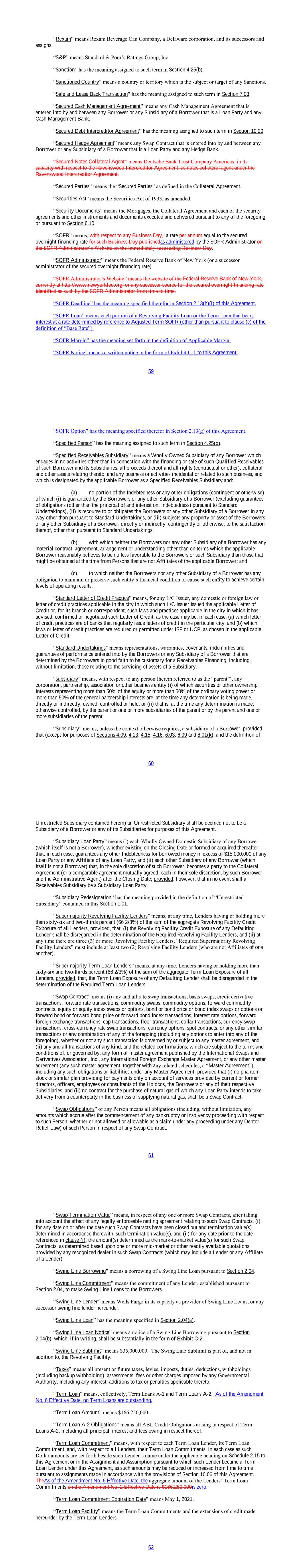 59 “Rexam” means Rexam Beverage Can Company, a Delaware corporation, and its successors and assigns. “S&P” means Standard & Poor’s Ratings Group, Inc. “Sanction” has the meaning assigned to such term in Section 4.25(b). “Sanctioned Country” means a country or territory which is the subject or target of any Sanctions. “Sale and Lease Back Transaction” has the meaning assigned to such term in Section 7.03. “Secured Cash Management Agreement” means any Cash Management Agreement that is entered into by and between any Borrower or any Subsidiary of a Borrower that is a Loan Party and any Cash Management Bank. “Secured Debt Intercreditor Agreement” has the meaning assigned to such term in Section 10.20. “Secured Hedge Agreement” means any Swap Contract that is entered into by and between any Borrower or any Subsidiary of a Borrower that is a Loan Party and any Hedge Bank. “Secured Notes Collateral Agent” means Deutsche Bank Trust Company Americas, in its capacity with respect to the Ravenswood Intercreditor Agreement, as notes collateral agent under the Ravenswood Intercreditor Agreement. “Secured Parties” means the “Secured Parties” as defined in the Collateral Agreement. “Securities Act” means the Securities Act of 1933, as amended. “Security Documents” means the Mortgages, the Collateral Agreement and each of the security agreements and other instruments and documents executed and delivered pursuant to any of the foregoing or pursuant to Section 6.10. “SOFR” means, with respect to any Business Day, a rate per annum equal to the secured overnight financing rate for such Business Day publishedas administered by the SOFR Administrator on the SOFR Administrator’s Website on the immediately succeeding Business Day. “SOFR Administrator” means the Federal Reserve Bank of New York (or a successor administrator of the secured overnight financing rate). “SOFR Administrator’s Website” means the website of the Federal Reserve Bank of New York, currently at http://www.newyorkfed.org, or any successor source for the secured overnight financing rate identified as such by the SOFR Administrator from time to time. “SOFR Deadline” has the meaning specified therefor in Section 2.13(h)(i) of this Agreement. “SOFR Loan” means each portion of a Revolving Facility Loan or the Term Loan that bears interest at a rate determined by reference to Adjusted Term SOFR (other than pursuant to clause (c) of the definition of “Base Rate”). “SOFR Margin” has the meaning set forth in the definition of Applicable Margin. “SOFR Notice” means a written notice in the form of Exhibit C-1 to this Agreement. 60 “SOFR Option” has the meaning specified therefor in Section 2.13(g) of this Agreement. “Specified Person” has the meaning assigned to such term in Section 4.25(b). “Specified Receivables Subsidiary” means a Wholly Owned Subsidiary of any Borrower which engages in no activities other than in connection with the financing or sale of such Qualified Receivables of such Borrower and its Subsidiaries, all proceeds thereof and all rights (contractual or other), collateral and other assets relating thereto, and any business or activities incidental or related to such business, and which is designated by the applicable Borrower as a Specified Receivables Subsidiary and: (a) no portion of the Indebtedness or any other obligations (contingent or otherwise) of which (i) is guaranteed by the Borrowers or any other Subsidiary of a Borrower (excluding guarantees of obligations (other than the principal of and interest on, Indebtedness) pursuant to Standard Undertakings), (ii) is recourse to or obligates the Borrowers or any other Subsidiary of a Borrower in any way other than pursuant to Standard Undertakings, or (iii) subjects any property or asset of the Borrowers or any other Subsidiary of a Borrower, directly or indirectly, contingently or otherwise, to the satisfaction thereof, other than pursuant to Standard Undertakings; (b) with which neither the Borrowers nor any other Subsidiary of a Borrower has any material contract, agreement, arrangement or understanding other than on terms which the applicable Borrower reasonably believes to be no less favorable to the Borrowers or such Subsidiary than those that might be obtained at the time from Persons that are not Affiliates of the applicable Borrower; and (c) to which neither the Borrowers nor any other Subsidiary of a Borrower has any obligation to maintain or preserve such entity’s financial condition or cause such entity to achieve certain levels of operating results. “Standard Letter of Credit Practice” means, for any L/C Issuer, any domestic or foreign law or letter of credit practices applicable in the city in which such L/C Issuer issued the applicable Letter of Credit or, for its branch or correspondent, such laws and practices applicable in the city in which it has advised, confirmed or negotiated such Letter of Credit, as the case may be, in each case, (a) which letter of credit practices are of banks that regularly issue letters of credit in the particular city, and (b) which laws or letter of credit practices are required or permitted under ISP or UCP, as chosen in the applicable Letter of Credit. “Standard Undertakings” means representations, warranties, covenants, indemnities and guarantees of performance entered into by the Borrowers or any Subsidiary of a Borrower that are determined by the Borrowers in good faith to be customary for a Receivables Financing, including, without limitation, those relating to the servicing of assets of a Subsidiary. “subsidiary” means, with respect to any person (herein referred to as the “parent”), any corporation, partnership, association or other business entity (i) of which securities or other ownership interests representing more than 50% of the equity or more than 50% of the ordinary voting power or more than 50% of t