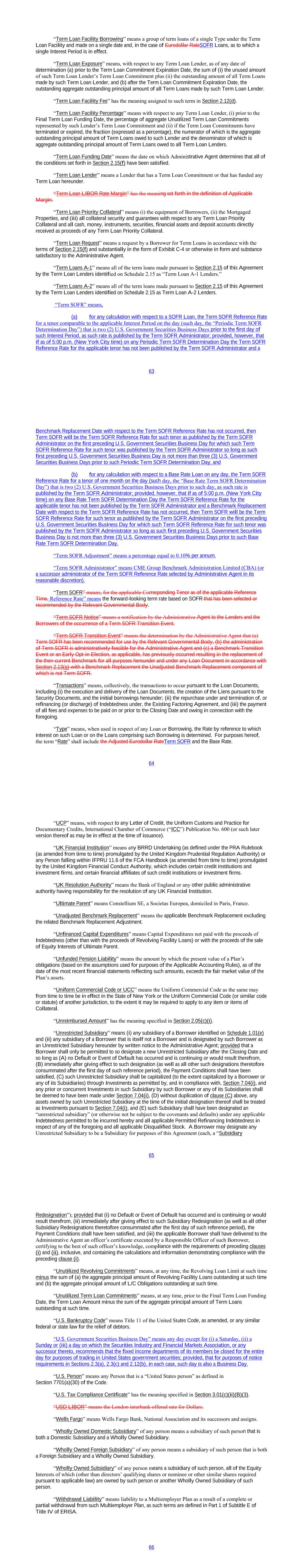 63 “Term Loan Facility Borrowing” means a group of term loans of a single Type under the Term Loan Facility and made on a single date and, in the case of Eurodollar RateSOFR Loans, as to which a single Interest Period is in effect. “Term Loan Exposure” means, with respect to any Term Loan Lender, as of any date of determination (a) prior to the Term Loan Commitment Expiration Date, the sum of (i) the unused amount of such Term Loan Lender’s Term Loan Commitment plus (ii) the outstanding amount of all Term Loans made by such Term Loan Lender, and (b) after the Term Loan Commitment Expiration Date, the outstanding aggregate outstanding principal amount of all Term Loans made by such Term Loan Lender. “Term Loan Facility Fee” has the meaning assigned to such term in Section 2.12(d). “Term Loan Facility Percentage” means with respect to any Term Loan Lender, (i) prior to the Final Term Loan Funding Date, the percentage of aggregate Unutilized Term Loan Commitments represented by such Lender’s Term Loan Commitment and (ii) if the Term Loan Commitments have terminated or expired, the fraction (expressed as a percentage), the numerator of which is the aggregate outstanding principal amount of Term Loans owed to such Lender and the denominator of which is aggregate outstanding principal amount of Term Loans owed to all Term Loan Lenders. “Term Loan Funding Date” means the date on which Administrative Agent determines that all of the conditions set forth in Section 2.15(f) have been satisfied. “Term Loan Lender” means a Lender that has a Term Loan Commitment or that has funded any Term Loan hereunder. “Term Loan LIBOR Rate Margin” has the meaning set forth in the definition of Applicable Margin. “Term Loan Priority Collateral” means (i) the equipment of Borrowers, (ii) the Mortgaged Properties, and (iii) all collateral security and guarantees with respect to any Term Loan Priority Collateral and all cash, money, instruments, securities, financial assets and deposit accounts directly received as proceeds of any Term Loan Priority Collateral. “Term Loan Request” means a request by a Borrower for Term Loans in accordance with the terms of Section 2.15(f) and substantially in the form of Exhibit C-4 or otherwise in form and substance satisfactory to the Administrative Agent. “Term Loans A-1” means all of the term loans made pursuant to Section 2.15 of this Agreement by the Term Loan Lenders identified on Schedule 2.15 as “Term Loan A-1 Lenders.” “Term Loans A-2” means all of the term loans made pursuant to Section 2.15 of this Agreement by the Term Loan Lenders identified on Schedule 2.15 as Term Loan A-2 Lenders. “Term SOFR” means, (a) for any calculation with respect to a SOFR Loan, the Term SOFR Reference Rate for a tenor comparable to the applicable Interest Period on the day (such day, the “Periodic Term SOFR Determination Day”) that is two (2) U.S. Government Securities Business Days prior to the first day of such Interest Period, as such rate is published by the Term SOFR Administrator; provided, however, that if as of 5:00 p.m. (New York City time) on any Periodic Term SOFR Determination Day the Term SOFR Reference Rate for the applicable tenor has not been published by the Term SOFR Administrator and a 64 Benchmark Replacement Date with respect to the Term SOFR Reference Rate has not occurred, then Term SOFR will be the Term SOFR Reference Rate for such tenor as published by the Term SOFR Administrator on the first preceding U.S. Government Securities Business Day for which such Term SOFR Reference Rate for such tenor was published by the Term SOFR Administrator so long as such first preceding U.S. Government Securities Business Day is not more than three (3) U.S. Government Securities Business Days prior to such Periodic Term SOFR Determination Day, and (b) for any calculation with respect to a Base Rate Loan on any day, the Term SOFR Reference Rate for a tenor of one month on the day (such day, the “Base Rate Term SOFR Determination Day”) that is two (2) U.S. Government Securities Business Days prior to such day, as such rate is published by the Term SOFR Administrator; provided, however, that if as of 5:00 p.m. (New York City time) on any Base Rate Term SOFR Determination Day the Term SOFR Reference Rate for the applicable tenor has not been published by the Term SOFR Administrator and a Benchmark Replacement Date with respect to the Term SOFR Reference Rate has not occurred, then Term SOFR will be the Term SOFR Reference Rate for such tenor as published by the Term SOFR Administrator on the first preceding U.S. Government Securities Business Day for which such Term SOFR Reference Rate for such tenor was published by the Term SOFR Administrator so long as such first preceding U.S. Government Securities Business Day is not more than three (3) U.S. Government Securities Business Days prior to such Base Rate Term SOFR Determination Day. “Term SOFR Adjustment” means a percentage equal to 0.10% per annum. “Term SOFR Administrator” means CME Group Benchmark Administration Limited (CBA) (or a successor administrator of the Term SOFR Reference Rate selected by Administrative Agent in its reasonable discretion). “Term SOFR” means, for the applicable Corresponding Tenor as of the applicable Reference Time, Reference Rate” means the forward-looking term rate based on SOFR that has been selected or recommended by the Relevant Governmental Body. “Term SOFR Notice” means a notification by the Administrative Agent to the Lenders and the Borrowers of the occurrence of a Term SOFR Transition Event. “Term SOFR Transition Event” means the determination by the Administrative Agent that (a) Term SOFR has been recommended for use by the Relevant Governmental Body, (b) the administration of Term SOFR is administratively feasible for the Administrative Agent and (c) a Benchmark Transition Event or an Early Opt-in Election, as a