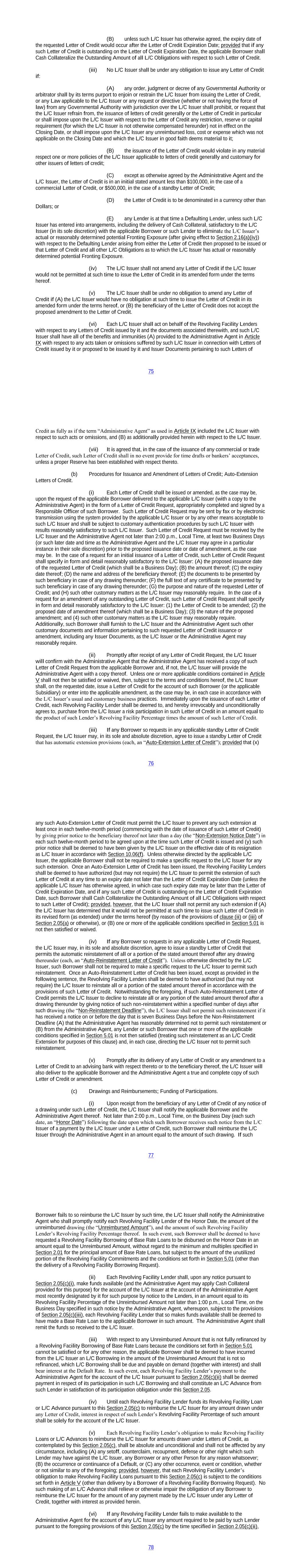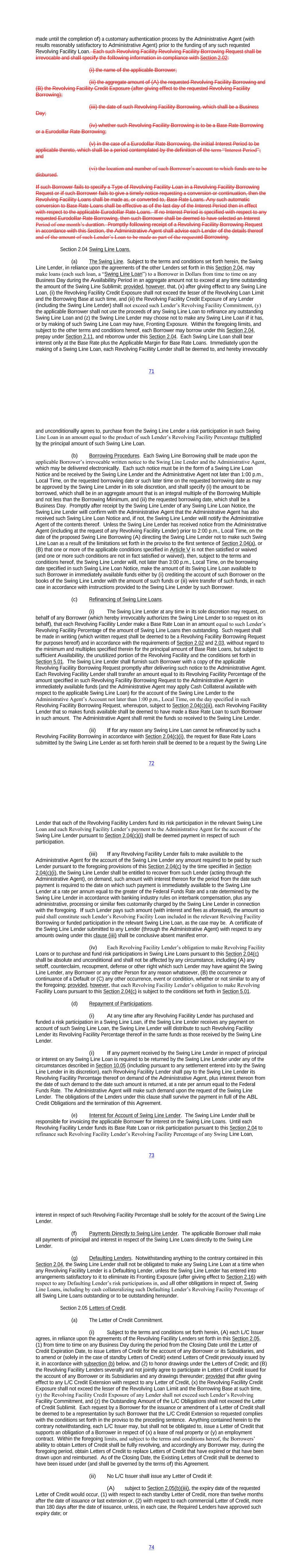 71 made until the completion of) a customary authentication process by the Administrative Agent (with results reasonably satisfactory to Administrative Agent) prior to the funding of any such requested Revolving Facility Loan. Each such Revolving Facility Revolving Facility Borrowing Request shall be irrevocable and shall specify the following information in compliance with Section 2.02: (i) the name of the applicable Borrower; (ii) the aggregate amount of (A) the requested Revolving Facility Borrowing and (B) the Revolving Facility Credit Exposure (after giving effect to the requested Revolving Facility Borrowing); (iii) the date of such Revolving Facility Borrowing, which shall be a Business Day; (iv) whether such Revolving Facility Borrowing is to be a Base Rate Borrowing or a Eurodollar Rate Borrowing; (v) in the case of a Eurodollar Rate Borrowing, the initial Interest Period to be applicable thereto, which shall be a period contemplated by the definition of the term “Interest Period”; and (vi) the location and number of such Borrower’s account to which funds are to be disbursed. If such Borrower fails to specify a Type of Revolving Facility Loan in a Revolving Facility Borrowing Request or if such Borrower fails to give a timely notice requesting a conversion or continuation, then the Revolving Facility Loans shall be made as, or converted to, Base Rate Loans. Any such automatic conversion to Base Rate Loans shall be effective as of the last day of the Interest Period then in effect with respect to the applicable Eurodollar Rate Loans. If no Interest Period is specified with respect to any requested Eurodollar Rate Borrowing, then such Borrower shall be deemed to have selected an Interest Period of one month’s duration. Promptly following receipt of a Revolving Facility Borrowing Request in accordance with this Section, the Administrative Agent shall advise each Lender of the details thereof and of the amount of such Lender’s Loan to be made as part of the requested Borrowing. Section 2.04 Swing Line Loans. (a) The Swing Line. Subject to the terms and conditions set forth herein, the Swing Line Lender, in reliance upon the agreements of the other Lenders set forth in this Section 2.04, may make loans (each such loan, a “Swing Line Loan”) to a Borrower in Dollars from time to time on any Business Day during the Availability Period in an aggregate amount not to exceed at any time outstanding the amount of the Swing Line Sublimit; provided, however, that, (x) after giving effect to any Swing Line Loan, (i) the Revolving Facility Credit Exposure shall not exceed the lesser of the Revolving Loan Limit and the Borrowing Base at such time, and (ii) the Revolving Facility Credit Exposure of any Lender (including the Swing Line Lender) shall not exceed such Lender’s Revolving Facility Commitment, (y) the applicable Borrower shall not use the proceeds of any Swing Line Loan to refinance any outstanding Swing Line Loan and (z) the Swing Line Lender may choose not to make any Swing Line Loan if it has, or by making of such Swing Line Loan may have, Fronting Exposure. Within the foregoing limits, and subject to the other terms and conditions hereof, each Borrower may borrow under this Section 2.04, prepay under Section 2.11, and reborrow under this Section 2.04. Each Swing Line Loan shall bear interest only at the Base Rate plus the Applicable Margin for Base Rate Loans. Immediately upon the making of a Swing Line Loan, each Revolving Facility Lender shall be deemed to, and hereby irrevocably 72 and unconditionally agrees to, purchase from the Swing Line Lender a risk participation in such Swing Line Loan in an amount equal to the product of such Lender’s Revolving Facility Percentage multiplied by the principal amount of such Swing Line Loan. (b) Borrowing Procedures. Each Swing Line Borrowing shall be made upon the applicable Borrower’s irrevocable written notice to the Swing Line Lender and the Administrative Agent, which may be delivered electronically. Each such notice must be in the form of a Swing Line Loan Notice and be received by the Swing Line Lender and the Administrative Agent not later than 1:00 p.m., Local Time, on the requested borrowing date or such later time on the requested borrowing date as may be approved by the Swing Line Lender in its sole discretion, and shall specify (i) the amount to be borrowed, which shall be in an aggregate amount that is an integral multiple of the Borrowing Multiple and not less than the Borrowing Minimum, and (ii) the requested borrowing date, which shall be a Business Day. Promptly after receipt by the Swing Line Lender of any Swing Line Loan Notice, the Swing Line Lender will confirm with the Administrative Agent that the Administrative Agent has also received such Swing Line Loan Notice and, if not, the Swing Line Lender will notify the Administrative Agent of the contents thereof. Unless the Swing Line Lender has received notice from the Administrative Agent (including at the request of any Revolving Facility Lender) prior to 2:00 p.m., Local Time, on the date of the proposed Swing Line Borrowing (A) directing the Swing Line Lender not to make such Swing Line Loan as a result of the limitations set forth in the proviso to the first sentence of Section 2.04(a), or (B) that one or more of the applicable conditions specified in Article V is not then satisfied or waived (and one or more such conditions are not in fact satisfied or waived), then, subject to the terms and conditions hereof, the Swing Line Lender will, not later than 3:00 p.m., Local Time, on the borrowing date specified in such Swing Line Loan Notice, make the amount of its Swing Line Loan available to such Borrower in immediately available funds either by (i) crediting the account of such Borrower on the books of the Swing Line Lender with the amount of such funds or (ii) wire transfer of such funds, in each case in accordance with instructions provided to the