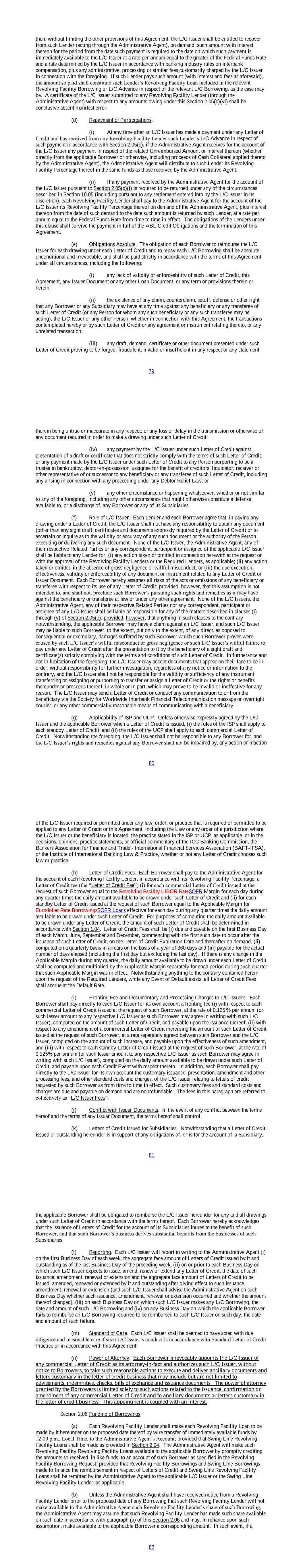 79 then, without limiting the other provisions of this Agreement, the L/C Issuer shall be entitled to recover from such Lender (acting through the Administrative Agent), on demand, such amount with interest thereon for the period from the date such payment is required to the date on which such payment is immediately available to the L/C Issuer at a rate per annum equal to the greater of the Federal Funds Rate and a rate determined by the L/C Issuer in accordance with banking industry rules on interbank compensation, plus any administrative, processing or similar fees customarily charged by the L/C Issuer in connection with the foregoing. If such Lender pays such amount (with interest and fees as aforesaid), the amount so paid shall constitute such Lender’s Revolving Facility Loan included in the relevant Revolving Facility Borrowing or L/C Advance in respect of the relevant L/C Borrowing, as the case may be. A certificate of the L/C Issuer submitted to any Revolving Facility Lender (through the Administrative Agent) with respect to any amounts owing under this Section 2.05(c)(vi) shall be conclusive absent manifest error. (d) Repayment of Participations. (i) At any time after an L/C Issuer has made a payment under any Letter of Credit and has received from any Revolving Facility Lender such Lender’s L/C Advance in respect of such payment in accordance with Section 2.05(c), if the Administrative Agent receives for the account of the L/C Issuer any payment in respect of the related Unreimbursed Amount or interest thereon (whether directly from the applicable Borrower or otherwise, including proceeds of Cash Collateral applied thereto by the Administrative Agent), the Administrative Agent will distribute to such Lender its Revolving Facility Percentage thereof in the same funds as those received by the Administrative Agent. (ii) If any payment received by the Administrative Agent for the account of the L/C Issuer pursuant to Section 2.05(c)(i) is required to be returned under any of the circumstances described in Section 10.05 (including pursuant to any settlement entered into by the L/C Issuer in its discretion), each Revolving Facility Lender shall pay to the Administrative Agent for the account of the L/C Issuer its Revolving Facility Percentage thereof on demand of the Administrative Agent, plus interest thereon from the date of such demand to the date such amount is returned by such Lender, at a rate per annum equal to the Federal Funds Rate from time to time in effect. The obligations of the Lenders under this clause shall survive the payment in full of the ABL Credit Obligations and the termination of this Agreement. (e) Obligations Absolute. The obligation of each Borrower to reimburse the L/C Issuer for each drawing under each Letter of Credit and to repay each L/C Borrowing shall be absolute, unconditional and irrevocable, and shall be paid strictly in accordance with the terms of this Agreement under all circumstances, including the following: (i) any lack of validity or enforceability of such Letter of Credit, this Agreement, any Issuer Document or any other Loan Document, or any term or provisions therein or herein; (ii) the existence of any claim, counterclaim, setoff, defense or other right that any Borrower or any Subsidiary may have at any time against any beneficiary or any transferee of such Letter of Credit (or any Person for whom any such beneficiary or any such transferee may be acting), the L/C Issuer or any other Person, whether in connection with this Agreement, the transactions contemplated hereby or by such Letter of Credit or any agreement or instrument relating thereto, or any unrelated transaction; (iii) any draft, demand, certificate or other document presented under such Letter of Credit proving to be forged, fraudulent, invalid or insufficient in any respect or any statement 80 therein being untrue or inaccurate in any respect; or any loss or delay in the transmission or otherwise of any document required in order to make a drawing under such Letter of Credit; (iv) any payment by the L/C Issuer under such Letter of Credit against presentation of a draft or certificate that does not strictly comply with the terms of such Letter of Credit; or any payment made by the L/C Issuer under such Letter of Credit to any Person purporting to be a trustee in bankruptcy, debtor-in-possession, assignee for the benefit of creditors, liquidator, receiver or other representative of or successor to any beneficiary or any transferee of such Letter of Credit, including any arising in connection with any proceeding under any Debtor Relief Law; or (v) any other circumstance or happening whatsoever, whether or not similar to any of the foregoing, including any other circumstance that might otherwise constitute a defense available to, or a discharge of, any Borrower or any of its Subsidiaries. (f) Role of L/C Issuer. Each Lender and each Borrower agree that, in paying any drawing under a Letter of Credit, the L/C Issuer shall not have any responsibility to obtain any document (other than any sight draft, certificates and documents expressly required by the Letter of Credit) or to ascertain or inquire as to the validity or accuracy of any such document or the authority of the Person executing or delivering any such document. None of the L/C Issuer, the Administrative Agent, any of their respective Related Parties or any correspondent, participant or assignee of the applicable L/C Issuer shall be liable to any Lender for: (i) any action taken or omitted in connection herewith at the request or with the approval of the Revolving Facility Lenders or the Required Lenders, as applicable; (ii) any action taken or omitted in the absence of gross negligence or willful misconduct; or (iii) the due execution, effectiveness, validity or enforceability of any document or instrument related to any Letter of Credit or Issuer Document. Each Borrower hereby assumes all risks of the acts or omiss