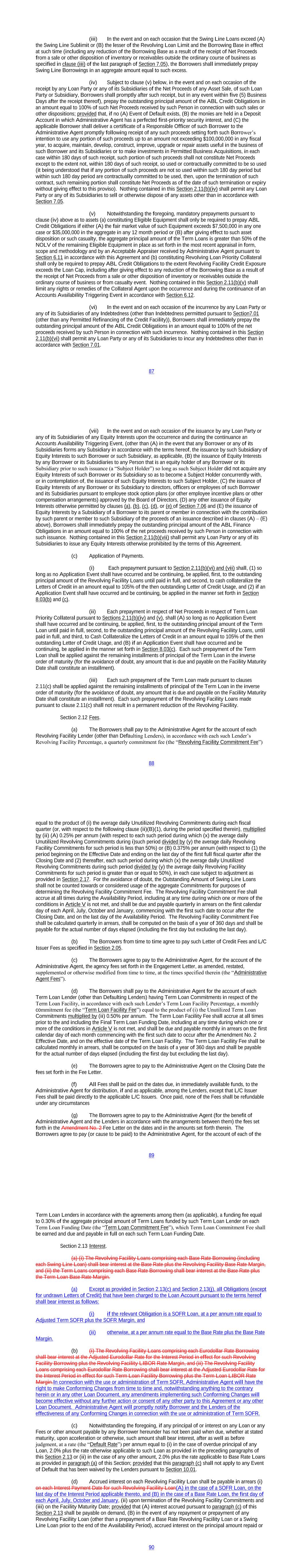 87 (iii) In the event and on each occasion that the Swing Line Loans exceed (A) the Swing Line Sublimit or (B) the lesser of the Revolving Loan Limit and the Borrowing Base in effect at such time (including any reduction of the Borrowing Base as a result of the receipt of Net Proceeds from a sale or other disposition of inventory or receivables outside the ordinary course of business as specified in clause (iii) of the last paragraph of Section 7.05), the Borrowers shall immediately prepay Swing Line Borrowings in an aggregate amount equal to such excess. (iv) Subject to clause (v) below, in the event and on each occasion of the receipt by any Loan Party or any of its Subsidiaries of the Net Proceeds of any Asset Sale, of such Loan Party or Subsidiary, Borrowers shall promptly after such receipt, but in any event within five (5) Business Days after the receipt thereof), prepay the outstanding principal amount of the ABL Credit Obligations in an amount equal to 100% of such Net Proceeds received by such Person in connection with such sales or other dispositions; provided that, if no (A) Event of Default exists, (B) the monies are held in a Deposit Account in which Administrative Agent has a perfected first-priority security interest, and (C) the applicable Borrower shall deliver a certificate of a Responsible Officer of such Borrower to the Administrative Agent promptly following receipt of any such proceeds setting forth such Borrower’s intention to use any portion of such proceeds up to an amount not exceeding $100,000,000 in any fiscal year, to acquire, maintain, develop, construct, improve, upgrade or repair assets useful in the business of such Borrower and its Subsidiaries or to make investments in Permitted Business Acquisitions, in each case within 180 days of such receipt, such portion of such proceeds shall not constitute Net Proceeds except to the extent not, within 180 days of such receipt, so used or contractually committed to be so used (it being understood that if any portion of such proceeds are not so used within such 180 day period but within such 180 day period are contractually committed to be used, then, upon the termination of such contract, such remaining portion shall constitute Net Proceeds as of the date of such termination or expiry without giving effect to this proviso). Nothing contained in this Section 2.11(b)(iv) shall permit any Loan Party or any of its Subsidiaries to sell or otherwise dispose of any assets other than in accordance with Section 7.05. (v) Notwithstanding the foregoing, mandatory prepayments pursuant to clause (iv) above as to assets (a) constituting Eligible Equipment shall only be required to prepay ABL Credit Obligations if either (A) the fair market value of such Equipment exceeds $7,500,000 in any one case or $35,000,000 in the aggregate in any 12 month period or (B) after giving effect to such asset disposition or such casualty, the aggregate principal amount of the Term Loans is greater than 50% of the NOLV of the remaining Eligible Equipment in place as set forth in the most recent appraisal in form, scope and methodology and by an Acceptable Appraiser received by Administrative Agent pursuant to Section 6.11 in accordance with this Agreement and (b) constituting Revolving Loan Priority Collateral shall only be required to prepay ABL Credit Obligations to the extent Revolving Facility Credit Exposure exceeds the Loan Cap, including after giving effect to any reduction of the Borrowing Base as a result of the receipt of Net Proceeds from a sale or other disposition of inventory or receivables outside the ordinary course of business or from casualty event. Nothing contained in this Section 2.11(b)(v) shall limit any rights or remedies of the Collateral Agent upon the occurrence and during the continuance of an Accounts Availability Triggering Event in accordance with Section 6.12. (vi) In the event and on each occasion of the incurrence by any Loan Party or any of its Subsidiaries of any Indebtedness (other than Indebtedness permitted pursuant to Section7.01 (other than any Permitted Refinancing of the Credit Facility)), Borrowers shall immediately prepay the outstanding principal amount of the ABL Credit Obligations in an amount equal to 100% of the net proceeds received by such Person in connection with such incurrence. Nothing contained in this Section 2.11(b)(vi) shall permit any Loan Party or any of its Subsidiaries to incur any Indebtedness other than in accordance with Section 7.01. 88 (vii) In the event and on each occasion of the issuance by any Loan Party or any of its Subsidiaries of any Equity Interests upon the occurrence and during the continuance an Accounts Availability Triggering Event, (other than (A) in the event that any Borrower or any of its Subsidiaries forms any Subsidiary in accordance with the terms hereof, the issuance by such Subsidiary of Equity Interests to such Borrower or such Subsidiary, as applicable, (B) the issuance of Equity Interests by any Borrower or its Subsidiaries to any Person that is an equity holder of any Borrower or its Subsidiary prior to such issuance (a “Subject Holder”) so long as such Subject Holder did not acquire any Equity Interests of such Borrower or its Subsidiary so as to become a Subject Holder concurrently with, or in contemplation of, the issuance of such Equity Interests to such Subject Holder, (C) the issuance of Equity Interests of any Borrower or its Subsidiary to directors, officers or employees of such Borrower and its Subsidiaries pursuant to employee stock option plans (or other employee incentive plans or other compensation arrangements) approved by the Board of Directors, (D) any other issuance of Equity Interests otherwise permitted by clauses (a), (b), (c), (d), or (e) of Section 7.06 and (E) the issuance of Equity Interests by a Subsidiary of a Borrower to its parent or member in connection with the contribution by such parent or member to such Subsidiary