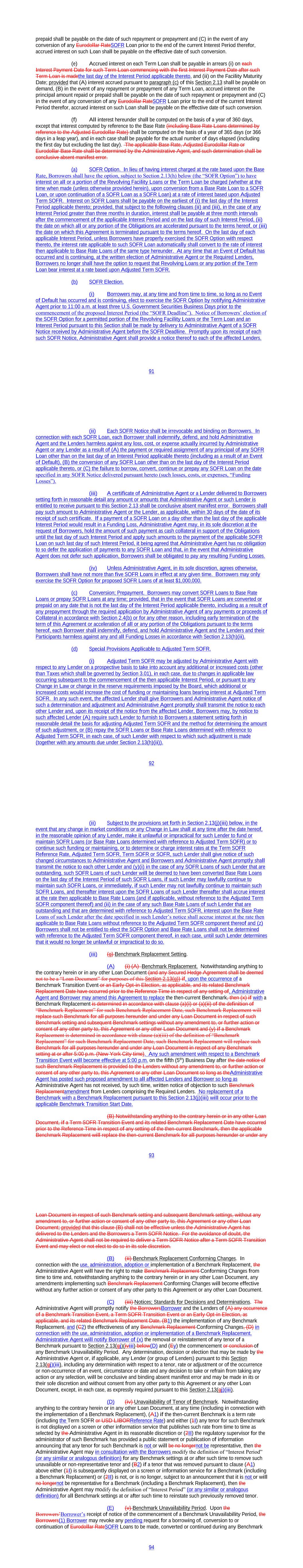 83 Revolving Facility Lender has not in fact made its share of the applicable Borrowing available to the Administrative Agent, then the applicable Revolving Facility Lender and such Borrower severally and not jointly agree to pay to the Administrative Agent forthwith on demand (without duplication) such corresponding amount with interest thereon, for each day from and including the date such amount is made available to such Borrower to but excluding the date of payment to the Administrative Agent, at (i) in the case of such Revolving Facility Lender, the greater of (A) the Federal Funds Rate and (B) a rate determined by the Administrative Agent in accordance with banking industry rules on interbank compensation or (ii) in the case of such Borrower, the interest rate applicable to Base Rate Revolving Facility Loans at such time. If such Revolving Facility Lender pays such amount to the Administrative Agent, then such amount shall constitute such Revolving Facility Lender’s Revolving Facility Loan included in such Borrowing. In the event such Borrower pays such amount to the Administrative Agent, then such amount shall reduce the principal amount of such Borrowing (but exclusive of any accrued and unpaid interest thereon). Section 2.07 Interest Elections. (a) Each Borrowing initially shall be of the Type specified in the applicable Revolving Facility Borrowing Request and, in the case of a Eurodollar Rate BorrowingSOFR Loan, shall have an initial Interest Period as specified in such Revolving Facility Borrowing Request or, if no Interest Period is specified in such Revolving Facility Borrowing Request, an initial Interest Period of one month’s duration. Thereafter, the applicable Borrower may elect to convert such Borrowing to a different Type or to continue such Borrowing and, in the case of a Eurodollar Rate BorrowingSOFR Loan, may elect Interest Periods therefor, all as provided in this Section. The applicable Borrower may elect different options with respect to different portions of the affected Borrowing, in which case each such portion shall be allocated ratably among the Lenders holding the Revolving Facility Loans comprising such Borrowing, and the Revolving Facility Loans comprising each such portion shall be considered a separate Borrowing. This Section shall not apply to Swing Line Borrowings which may not be converted or continued. (b) To make an election pursuant to this Section, the applicable Borrower shall notify the Administrative Agent of such election in writing (which may be delivered electronically) by the time that a Revolving Facility Borrowing Request would be required under Section 2.03 if such Borrower were requesting a Borrowing of the Type resulting from such election to be made on the effective date of such election. Each such Interest Election Request shall be irrevocable. (c) Each Interest Election Request shall be irrevocable and shall specify the following information in compliance with Section 2.02: (i) the name of the applicable Borrower and the Borrowing to which such Interest Election Request applies and, if different options are being elected with respect to different portions thereof, the portions thereof to be allocated to each resulting Borrowing (in which case the information to be specified pursuant to clauses (iii) and (iv) below shall be specified for each resulting Borrowing); (ii) the effective date of the election made pursuant to such Interest Election Request, which shall be a Business Day; (iii) whether the resulting Borrowing is to be a Base Rate Borrowing or a Eurodollar Rate BorrowingSOFR Loan; and 84 (iv) if the resulting Borrowing is a Eurodollar Rate BorrowingSOFR Loan, the Interest Period to be applicable thereto after giving effect to such election, which shall be a period contemplated by the definition of the term “Interest Period.” (v) If any such Interest Election Request requests a Eurodollar Rate BorrowingSOFR Loan but does not specify an Interest Period, then the applicable Borrower shall be deemed to have selected an Interest Period of one month’s duration. (d) Promptly following receipt of an Interest Election Request, the Administrative Agent shall advise each Lender to which such Interest Election Request relates of the details thereof and of such Lender’s portion of each resulting Borrowing. (e) If the applicable Borrower fails to deliver a timely Interest Election Request with respect to a Eurodollar Rate BorrowingSOFR Loan prior to the end of the Interest Period applicable thereto, then, unless such Borrowing is repaid as provided herein, at the end of such Interest Period such Borrowing shall be converted to a Base Rate Borrowing. Notwithstanding any contrary provision hereof, if an Event of Default has occurred and is continuing and the Administrative Agent, at the written request (including a request through electronic means) of the Required Lenders, so notifies the Borrowers, then, so long as an Event of Default is continuing (i) no outstanding Borrowing may be converted to or continued as a Eurodollar Rate BorrowingSOFR Loan and (ii) unless repaid, each Eurodollar Rate BorrowingSOFR Loan shall be converted to a Base Rate Borrowing at the end of the Interest Period applicable thereto. Section 2.08 Termination and Reduction of Revolving Facility Commitments. (a) Unless previously terminated, the Revolving Facility Commitments shall terminate on the Facility Maturity Date. (b) The Borrowers may at any time terminate or from time to time permanently reduce the Revolving Facility Commitments; provided that (i) each reduction of the Revolving Facility Commitments shall be in an amount that is an integral multiple of $5,000,000 and not less than $10,000,000 (or, if less, the remaining amount of the Revolving Facility Commitments), (ii) the Borrowers shall not terminate or reduce the Revolving Facility Commitments if, after giving effect to any concurrent prepayment of the Revolving Facility Loans in accordanc