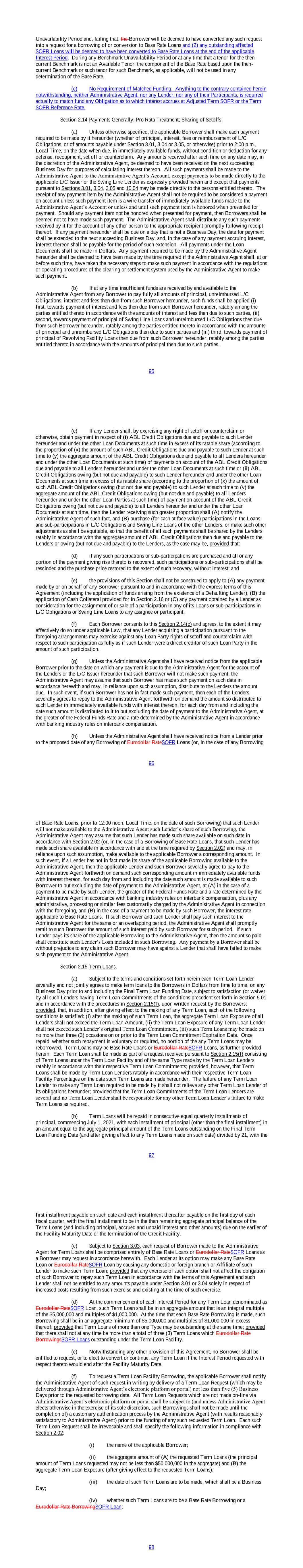 95 Unavailability Period and, failing that, the Borrower will be deemed to have converted any such request into a request for a borrowing of or conversion to Base Rate Loans and (2) any outstanding affected SOFR Loans will be deemed to have been converted to Base Rate Loans at the end of the applicable Interest Period. During any Benchmark Unavailability Period or at any time that a tenor for the then- current Benchmark is not an Available Tenor, the component of the Base Rate based upon the then- current Benchmark or such tenor for such Benchmark, as applicable, will not be used in any determination of the Base Rate. (e) No Requirement of Matched Funding. Anything to the contrary contained herein notwithstanding, neither Administrative Agent, nor any Lender, nor any of their Participants, is required actually to match fund any Obligation as to which interest accrues at Adjusted Term SOFR or the Term SOFR Reference Rate. Section 2.14 Payments Generally; Pro Rata Treatment; Sharing of Setoffs. (a) Unless otherwise specified, the applicable Borrower shall make each payment required to be made by it hereunder (whether of principal, interest, fees or reimbursement of L/C Obligations, or of amounts payable under Section 3.01, 3.04 or 3.05, or otherwise) prior to 2:00 p.m., Local Time, on the date when due, in immediately available funds, without condition or deduction for any defense, recoupment, set off or counterclaim. Any amounts received after such time on any date may, in the discretion of the Administrative Agent, be deemed to have been received on the next succeeding Business Day for purposes of calculating interest thereon. All such payments shall be made to the Administrative Agent to the Administrative Agent’s Account, except payments to be made directly to the applicable L/C Issuer or the Swing Line Lender as expressly provided herein and except that payments pursuant to Sections 3.01, 3.04, 3.05 and 10.04 may be made directly to the persons entitled thereto. The receipt of any payment item by the Administrative Agent shall not be required to be considered a payment on account unless such payment item is a wire transfer of immediately available funds made to the Administrative Agent’s Account or unless and until such payment item is honored when presented for payment. Should any payment item not be honored when presented for payment, then Borrowers shall be deemed not to have made such payment. The Administrative Agent shall distribute any such payments received by it for the account of any other person to the appropriate recipient promptly following receipt thereof. If any payment hereunder shall be due on a day that is not a Business Day, the date for payment shall be extended to the next succeeding Business Day, and, in the case of any payment accruing interest, interest thereon shall be payable for the period of such extension. All payments under the Loan Documents shall be made in Dollars. Any payment required to be made by the Administrative Agent hereunder shall be deemed to have been made by the time required if the Administrative Agent shall, at or before such time, have taken the necessary steps to make such payment in accordance with the regulations or operating procedures of the clearing or settlement system used by the Administrative Agent to make such payment. (b) If at any time insufficient funds are received by and available to the Administrative Agent from any Borrower to pay fully all amounts of principal, unreimbursed L/C Obligations, interest and fees then due from such Borrower hereunder, such funds shall be applied (i) first, towards payment of interest and fees then due from such Borrower hereunder, ratably among the parties entitled thereto in accordance with the amounts of interest and fees then due to such parties, (ii) second, towards payment of principal of Swing Line Loans and unreimbursed L/C Obligations then due from such Borrower hereunder, ratably among the parties entitled thereto in accordance with the amounts of principal and unreimbursed L/C Obligations then due to such parties and (iii) third, towards payment of principal of Revolving Facility Loans then due from such Borrower hereunder, ratably among the parties entitled thereto in accordance with the amounts of principal then due to such parties. 96 (c) If any Lender shall, by exercising any right of setoff or counterclaim or otherwise, obtain payment in respect of (i) ABL Credit Obligations due and payable to such Lender hereunder and under the other Loan Documents at such time in excess of its ratable share (according to the proportion of (x) the amount of such ABL Credit Obligations due and payable to such Lender at such time to (y) the aggregate amount of the ABL Credit Obligations due and payable to all Lenders hereunder and under the other Loan Documents at such time) of payments on account of the ABL Credit Obligations due and payable to all Lenders hereunder and under the other Loan Documents at such time or (ii) ABL Credit Obligations owing (but not due and payable) to such Lender hereunder and under the other Loan Documents at such time in excess of its ratable share (according to the proportion of (x) the amount of such ABL Credit Obligations owing (but not due and payable) to such Lender at such time to (y) the aggregate amount of the ABL Credit Obligations owing (but not due and payable) to all Lenders hereunder and under the other Loan Parties at such time) of payment on account of the ABL Credit Obligations owing (but not due and payable) to all Lenders hereunder and under the other Loan Documents at such time, then the Lender receiving such greater proportion shall (A) notify the Administrative Agent of such fact, and (B) purchase (for cash at face value) participations in the Loans and sub-participations in L/C Obligations and Swing Line Loans of the other Lenders, or make such other adjustments as shall be equitable, so that the benefit of all such payments shall be shar