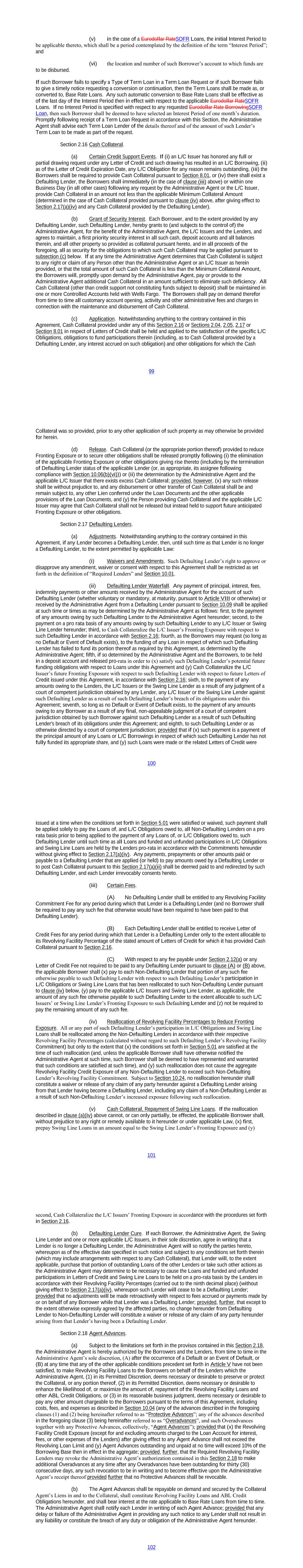 99 (v) in the case of a Eurodollar RateSOFR Loans, the initial Interest Period to be applicable thereto, which shall be a period contemplated by the definition of the term “Interest Period”; and (vi) the location and number of such Borrower’s account to which funds are to be disbursed. If such Borrower fails to specify a Type of Term Loan in a Term Loan Request or if such Borrower fails to give a timely notice requesting a conversion or continuation, then the Term Loans shall be made as, or converted to, Base Rate Loans. Any such automatic conversion to Base Rate Loans shall be effective as of the last day of the Interest Period then in effect with respect to the applicable Eurodollar RateSOFR Loans. If no Interest Period is specified with respect to any requested Eurodollar Rate BorrowingSOFR Loan, then such Borrower shall be deemed to have selected an Interest Period of one month’s duration. Promptly following receipt of a Term Loan Request in accordance with this Section, the Administrative Agent shall advise each Term Loan Lender of the details thereof and of the amount of such Lender’s Term Loan to be made as part of the request. Section 2.16 Cash Collateral. (a) Certain Credit Support Events. If (i) an L/C Issuer has honored any full or partial drawing request under any Letter of Credit and such drawing has resulted in an L/C Borrowing, (ii) as of the Letter of Credit Expiration Date, any L/C Obligation for any reason remains outstanding, (iii) the Borrowers shall be required to provide Cash Collateral pursuant to Section 8.01, or (iv) there shall exist a Defaulting Lender, the Borrowers shall immediately (in the case of clause (iii) above) or within one Business Day (in all other cases) following any request by the Administrative Agent or the L/C Issuer, provide Cash Collateral in an amount not less than the applicable Minimum Collateral Amount (determined in the case of Cash Collateral provided pursuant to clause (iv) above, after giving effect to Section 2.17(a)(iv) and any Cash Collateral provided by the Defaulting Lender). (b) Grant of Security Interest. Each Borrower, and to the extent provided by any Defaulting Lender, such Defaulting Lender, hereby grants to (and subjects to the control of) the Administrative Agent, for the benefit of the Administrative Agent, the L/C Issuers and the Lenders, and agrees to maintain, a first priority security interest in all such cash, deposit accounts and all balances therein, and all other property so provided as collateral pursuant hereto, and in all proceeds of the foregoing, all as security for the obligations to which such Cash Collateral may be applied pursuant to subsection (c) below. If at any time the Administrative Agent determines that Cash Collateral is subject to any right or claim of any Person other than the Administrative Agent or an L/C Issuer as herein provided, or that the total amount of such Cash Collateral is less than the Minimum Collateral Amount, the Borrowers will, promptly upon demand by the Administrative Agent, pay or provide to the Administrative Agent additional Cash Collateral in an amount sufficient to eliminate such deficiency. All Cash Collateral (other than credit support not constituting funds subject to deposit) shall be maintained in one or more Controlled Accounts held with Wells Fargo. The Borrowers shall pay on demand therefor from time to time all customary account opening, activity and other administrative fees and charges in connection with the maintenance and disbursement of Cash Collateral. (c) Application. Notwithstanding anything to the contrary contained in this Agreement, Cash Collateral provided under any of this Section 2.16 or Sections 2.04, 2.05, 2.17 or Section 8.01 in respect of Letters of Credit shall be held and applied to the satisfaction of the specific L/C Obligations, obligations to fund participations therein (including, as to Cash Collateral provided by a Defaulting Lender, any interest accrued on such obligation) and other obligations for which the Cash 100 Collateral was so provided, prior to any other application of such property as may otherwise be provided for herein. (d) Release. Cash Collateral (or the appropriate portion thereof) provided to reduce Fronting Exposure or to secure other obligations shall be released promptly following (i) the elimination of the applicable Fronting Exposure or other obligations giving rise thereto (including by the termination of Defaulting Lender status of the applicable Lender (or, as appropriate, its assignee following compliance with Section 10.06(b)(vi))) or (ii) the determination by the Administrative Agent and the applicable L/C Issuer that there exists excess Cash Collateral; provided, however, (x) any such release shall be without prejudice to, and any disbursement or other transfer of Cash Collateral shall be and remain subject to, any other Lien conferred under the Loan Documents and the other applicable provisions of the Loan Documents, and (y) the Person providing Cash Collateral and the applicable L/C Issuer may agree that Cash Collateral shall not be released but instead held to support future anticipated Fronting Exposure or other obligations. Section 2.17 Defaulting Lenders. (a) Adjustments. Notwithstanding anything to the contrary contained in this Agreement, if any Lender becomes a Defaulting Lender, then, until such time as that Lender is no longer a Defaulting Lender, to the extent permitted by applicable Law: (i) Waivers and Amendments. Such Defaulting Lender’s right to approve or disapprove any amendment, waiver or consent with respect to this Agreement shall be restricted as set forth in the definition of “Required Lenders” and Section 10.01. (ii) Defaulting Lender Waterfall. Any payment of principal, interest, fees, indemnity payments or other amounts received by the Administrative Agent for the account of such Defaulting Lender (whether voluntary or mandatory, at maturity, pursuant to Article VIII