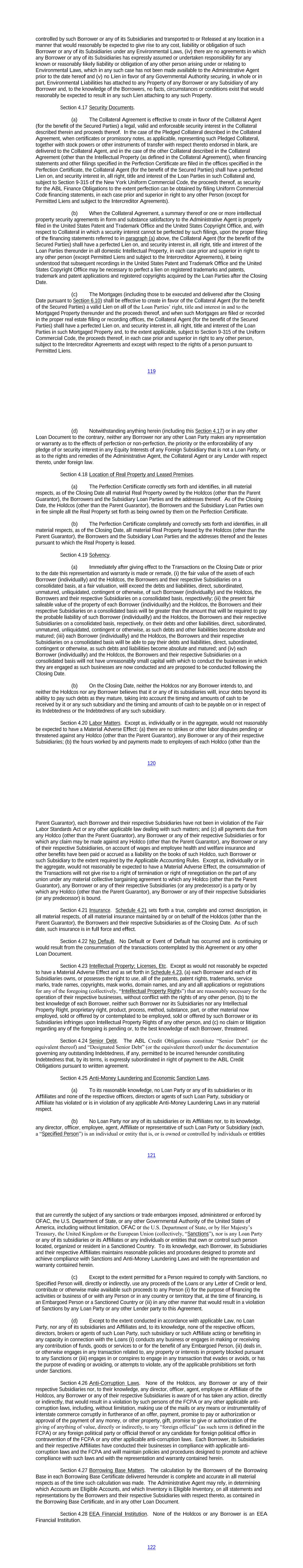 119 controlled by such Borrower or any of its Subsidiaries and transported to or Released at any location in a manner that would reasonably be expected to give rise to any cost, liability or obligation of such Borrower or any of its Subsidiaries under any Environmental Laws, (iv) there are no agreements in which any Borrower or any of its Subsidiaries has expressly assumed or undertaken responsibility for any known or reasonably likely liability or obligation of any other person arising under or relating to Environmental Laws, which in any such case has not been made available to the Administrative Agent prior to the date hereof and (v) no Lien in favor of any Governmental Authority securing, in whole or in part, Environmental Liabilities has attached to any Property of any Borrower or any Subsidiary of any Borrower and, to the knowledge of the Borrowers, no facts, circumstances or conditions exist that would reasonably be expected to result in any such Lien attaching to any such Property. Section 4.17 Security Documents. (a) The Collateral Agreement is effective to create in favor of the Collateral Agent (for the benefit of the Secured Parties) a legal, valid and enforceable security interest in the Collateral described therein and proceeds thereof. In the case of the Pledged Collateral described in the Collateral Agreement, when certificates or promissory notes, as applicable, representing such Pledged Collateral, together with stock powers or other instruments of transfer with respect thereto endorsed in blank, are delivered to the Collateral Agent, and in the case of the other Collateral described in the Collateral Agreement (other than the Intellectual Property (as defined in the Collateral Agreement)), when financing statements and other filings specified in the Perfection Certificate are filed in the offices specified in the Perfection Certificate, the Collateral Agent (for the benefit of the Secured Parties) shall have a perfected Lien on, and security interest in, all right, title and interest of the Loan Parties in such Collateral and, subject to Section 9-315 of the New York Uniform Commercial Code, the proceeds thereof, as security for the ABL Finance Obligations to the extent perfection can be obtained by filing Uniform Commercial Code financing statements, in each case prior and superior in right to any other Person (except for Permitted Liens and subject to the Intercreditor Agreements). (b) When the Collateral Agreement, a summary thereof or one or more intellectual property security agreements in form and substance satisfactory to the Administrative Agent is properly filed in the United States Patent and Trademark Office and the United States Copyright Office, and, with respect to Collateral in which a security interest cannot be perfected by such filings, upon the proper filing of the financing statements referred to in paragraph (a) above, the Collateral Agent (for the benefit of the Secured Parties) shall have a perfected Lien on, and security interest in, all right, title and interest of the Loan Parties thereunder in all domestic Intellectual Property, in each case prior and superior in right to any other person (except Permitted Liens and subject to the Intercreditor Agreements), it being understood that subsequent recordings in the United States Patent and Trademark Office and the United States Copyright Office may be necessary to perfect a lien on registered trademarks and patents, trademark and patent applications and registered copyrights acquired by the Loan Parties after the Closing Date. (c) The Mortgages (including those to be executed and delivered after the Closing Date pursuant to Section 6.10) shall be effective to create in favor of the Collateral Agent (for the benefit of the Secured Parties) a valid Lien on all of the Loan Parties’ right, title and interest in and to the Mortgaged Property thereunder and the proceeds thereof, and when such Mortgages are filed or recorded in the proper real estate filing or recording offices, the Collateral Agent (for the benefit of the Secured Parties) shall have a perfected Lien on, and security interest in, all right, title and interest of the Loan Parties in such Mortgaged Property and, to the extent applicable, subject to Section 9-315 of the Uniform Commercial Code, the proceeds thereof, in each case prior and superior in right to any other person, subject to the Intercreditor Agreements and except with respect to the rights of a person pursuant to Permitted Liens. 120 (d) Notwithstanding anything herein (including this Section 4.17) or in any other Loan Document to the contrary, neither any Borrower nor any other Loan Party makes any representation or warranty as to the effects of perfection or non-perfection, the priority or the enforceability of any pledge of or security interest in any Equity Interests of any Foreign Subsidiary that is not a Loan Party, or as to the rights and remedies of the Administrative Agent, the Collateral Agent or any Lender with respect thereto, under foreign law. Section 4.18 Location of Real Property and Leased Premises. (a) The Perfection Certificate correctly sets forth and identifies, in all material respects, as of the Closing Date all material Real Property owned by the Holdcos (other than the Parent Guarantor), the Borrowers and the Subsidiary Loan Parties and the addresses thereof. As of the Closing Date, the Holdcos (other than the Parent Guarantor), the Borrowers and the Subsidiary Loan Parties own in fee simple all the Real Property set forth as being owned by them on the Perfection Certificate. (b) The Perfection Certificate completely and correctly sets forth and identifies, in all material respects, as of the Closing Date, all material Real Property leased by the Holdcos (other than the Parent Guarantor), the Borrowers and the Subsidiary Loan Parties and the addresses thereof and the leases pursuant to which the Real Property is leased. Section 4.19 Solvency. (a) Imm
