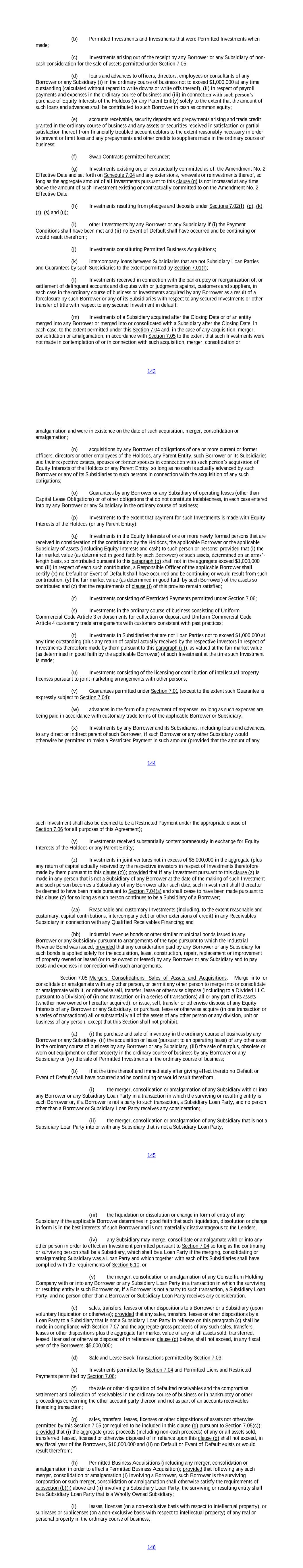 143 (b) Permitted Investments and Investments that were Permitted Investments when made; (c) Investments arising out of the receipt by any Borrower or any Subsidiary of non- cash consideration for the sale of assets permitted under Section 7.05; (d) loans and advances to officers, directors, employees or consultants of any Borrower or any Subsidiary (i) in the ordinary course of business not to exceed $1,000,000 at any time outstanding (calculated without regard to write downs or write offs thereof), (ii) in respect of payroll payments and expenses in the ordinary course of business and (iii) in connection with such person’s purchase of Equity Interests of the Holdcos (or any Parent Entity) solely to the extent that the amount of such loans and advances shall be contributed to such Borrower in cash as common equity; (e) accounts receivable, security deposits and prepayments arising and trade credit granted in the ordinary course of business and any assets or securities received in satisfaction or partial satisfaction thereof from financially troubled account debtors to the extent reasonably necessary in order to prevent or limit loss and any prepayments and other credits to suppliers made in the ordinary course of business; (f) Swap Contracts permitted hereunder; (g) Investments existing on, or contractually committed as of, the Amendment No. 2 Effective Date and set forth on Schedule 7.04 and any extensions, renewals or reinvestments thereof, so long as the aggregate amount of all Investments pursuant to this clause (g) is not increased at any time above the amount of such Investment existing or contractually committed to on the Amendment No. 2 Effective Date; (h) Investments resulting from pledges and deposits under Sections 7.02(f), (g), (k), (r), (s) and (u); (i) other Investments by any Borrower or any Subsidiary if (i) the Payment Conditions shall have been met and (ii) no Event of Default shall have occurred and be continuing or would result therefrom; (j) Investments constituting Permitted Business Acquisitions; (k) intercompany loans between Subsidiaries that are not Subsidiary Loan Parties and Guarantees by such Subsidiaries to the extent permitted by Section 7.01(l); (l) Investments received in connection with the bankruptcy or reorganization of, or settlement of delinquent accounts and disputes with or judgments against, customers and suppliers, in each case in the ordinary course of business or Investments acquired by any Borrower as a result of a foreclosure by such Borrower or any of its Subsidiaries with respect to any secured Investments or other transfer of title with respect to any secured Investment in default; (m) Investments of a Subsidiary acquired after the Closing Date or of an entity merged into any Borrower or merged into or consolidated with a Subsidiary after the Closing Date, in each case, to the extent permitted under this Section 7.04 and, in the case of any acquisition, merger, consolidation or amalgamation, in accordance with Section 7.05 to the extent that such Investments were not made in contemplation of or in connection with such acquisition, merger, consolidation or 144 amalgamation and were in existence on the date of such acquisition, merger, consolidation or amalgamation; (n) acquisitions by any Borrower of obligations of one or more current or former officers, directors or other employees of the Holdcos, any Parent Entity, such Borrower or its Subsidiaries and their respective estates, spouses or former spouses in connection with such person’s acquisition of Equity Interests of the Holdcos or any Parent Entity, so long as no cash is actually advanced by such Borrower or any of its Subsidiaries to such persons in connection with the acquisition of any such obligations; (o) Guarantees by any Borrower or any Subsidiary of operating leases (other than Capital Lease Obligations) or of other obligations that do not constitute Indebtedness, in each case entered into by any Borrower or any Subsidiary in the ordinary course of business; (p) Investments to the extent that payment for such Investments is made with Equity Interests of the Holdcos (or any Parent Entity); (q) Investments in the Equity Interests of one or more newly formed persons that are received in consideration of the contribution by the Holdcos, the applicable Borrower or the applicable Subsidiary of assets (including Equity Interests and cash) to such person or persons; provided that (i) the fair market value (as determined in good faith by such Borrower) of such assets, determined on an arms’- length basis, so contributed pursuant to this paragraph (q) shall not in the aggregate exceed $1,000,000 and (ii) in respect of each such contribution, a Responsible Officer of the applicable Borrower shall certify (x) no Default or Event of Default shall have occurred and be continuing or would result from such contribution, (y) the fair market value (as determined in good faith by such Borrower) of the assets so contributed and (z) that the requirements of clause (i) of this proviso remain satisfied; (r) Investments consisting of Restricted Payments permitted under Section 7.06; (s) Investments in the ordinary course of business consisting of Uniform Commercial Code Article 3 endorsements for collection or deposit and Uniform Commercial Code Article 4 customary trade arrangements with customers consistent with past practices; (t) Investments in Subsidiaries that are not Loan Parties not to exceed $1,000,000 at any time outstanding (plus any return of capital actually received by the respective investors in respect of Investments theretofore made by them pursuant to this paragraph (u)), as valued at the fair market value (as determined in good faith by the applicable Borrower) of such Investment at the time such Investment is made; (u) Investments consisting of the licensing or contribution of intellectual property licenses pursuant to joint marketing arrangements with other persons; (v) Gu