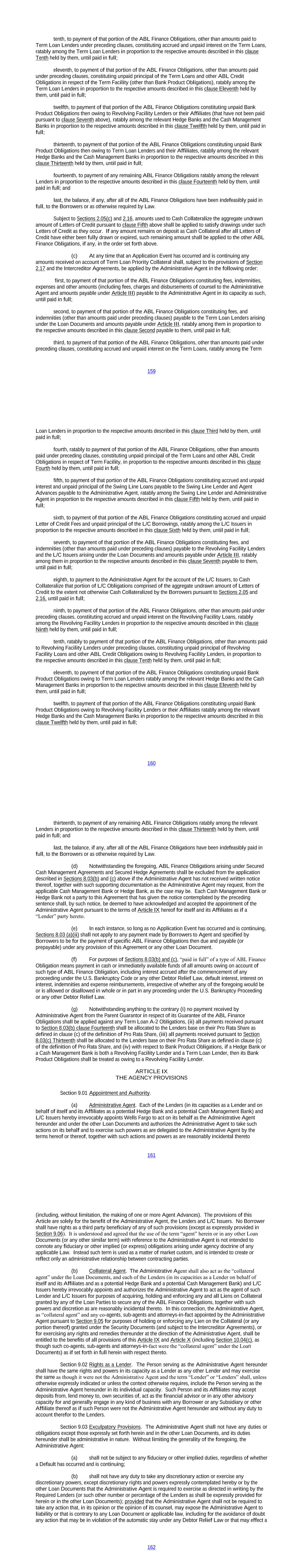 159 tenth, to payment of that portion of the ABL Finance Obligations, other than amounts paid to Term Loan Lenders under preceding clauses, constituting accrued and unpaid interest on the Term Loans, ratably among the Term Loan Lenders in proportion to the respective amounts described in this clause Tenth held by them, until paid in full; eleventh, to payment of that portion of the ABL Finance Obligations, other than amounts paid under preceding clauses, constituting unpaid principal of the Term Loans and other ABL Credit Obligations in respect of the Term Facility (other than Bank Product Obligations), ratably among the Term Loan Lenders in proportion to the respective amounts described in this clause Eleventh held by them, until paid in full; twelfth, to payment of that portion of the ABL Finance Obligations constituting unpaid Bank Product Obligations then owing to Revolving Facility Lenders or their Affiliates (that have not been paid pursuant to clause Seventh above), ratably among the relevant Hedge Banks and the Cash Management Banks in proportion to the respective amounts described in this clause Twelfth held by them, until paid in full; thirteenth, to payment of that portion of the ABL Finance Obligations constituting unpaid Bank Product Obligations then owing to Term Loan Lenders and their Affiliates, ratably among the relevant Hedge Banks and the Cash Management Banks in proportion to the respective amounts described in this clause Thirteenth held by them, until paid in full; fourteenth, to payment of any remaining ABL Finance Obligations ratably among the relevant Lenders in proportion to the respective amounts described in this clause Fourteenth held by them, until paid in full; and last, the balance, if any, after all of the ABL Finance Obligations have been indefeasibly paid in full, to the Borrowers or as otherwise required by Law. Subject to Sections 2.05(c) and 2.16, amounts used to Cash Collateralize the aggregate undrawn amount of Letters of Credit pursuant to clause Fifth above shall be applied to satisfy drawings under such Letters of Credit as they occur. If any amount remains on deposit as Cash Collateral after all Letters of Credit have either been fully drawn or expired, such remaining amount shall be applied to the other ABL Finance Obligations, if any, in the order set forth above. (c) At any time that an Application Event has occurred and is continuing any amounts received on account of Term Loan Priority Collateral shall, subject to the provisions of Section 2.17 and the Intercreditor Agreements, be applied by the Administrative Agent in the following order: first, to payment of that portion of the ABL Finance Obligations constituting fees, indemnities, expenses and other amounts (including fees, charges and disbursements of counsel to the Administrative Agent and amounts payable under Article III) payable to the Administrative Agent in its capacity as such, until paid in full; second, to payment of that portion of the ABL Finance Obligations constituting fees, and indemnities (other than amounts paid under preceding clauses) payable to the Term Loan Lenders arising under the Loan Documents and amounts payable under Article III, ratably among them in proportion to the respective amounts described in this clause Second payable to them, until paid in full; third, to payment of that portion of the ABL Finance Obligations, other than amounts paid under preceding clauses, constituting accrued and unpaid interest on the Term Loans, ratably among the Term 160 Loan Lenders in proportion to the respective amounts described in this clause Third held by them, until paid in full; fourth, ratably to payment of that portion of the ABL Finance Obligations, other than amounts paid under preceding clauses, constituting unpaid principal of the Term Loans and other ABL Credit Obligations in respect of Term Facility, in proportion to the respective amounts described in this clause Fourth held by them, until paid in full; fifth, to payment of that portion of the ABL Finance Obligations constituting accrued and unpaid interest and unpaid principal of the Swing Line Loans payable to the Swing Line Lender and Agent Advances payable to the Administrative Agent, ratably among the Swing Line Lender and Administrative Agent in proportion to the respective amounts described in this clause Fifth held by them, until paid in full; sixth, to payment of that portion of the ABL Finance Obligations constituting accrued and unpaid Letter of Credit Fees and unpaid principal of the L/C Borrowings, ratably among the L/C Issuers in proportion to the respective amounts described in this clause Sixth held by them, until paid in full; seventh, to payment of that portion of the ABL Finance Obligations constituting fees, and indemnities (other than amounts paid under preceding clauses) payable to the Revolving Facility Lenders and the L/C Issuers arising under the Loan Documents and amounts payable under Article III, ratably among them in proportion to the respective amounts described in this clause Seventh payable to them, until paid in full; eighth, to payment to the Administrative Agent for the account of the L/C Issuers, to Cash Collateralize that portion of L/C Obligations comprised of the aggregate undrawn amount of Letters of Credit to the extent not otherwise Cash Collateralized by the Borrowers pursuant to Sections 2.05 and 2.16, until paid in full; ninth, to payment of that portion of the ABL Finance Obligations, other than amounts paid under preceding clauses, constituting accrued and unpaid interest on the Revolving Facility Loans, ratably among the Revolving Facility Lenders in proportion to the respective amounts described in this clause Ninth held by them, until paid in full; tenth, ratably to payment of that portion of the ABL Finance Obligations, other than amounts paid to Revolving Facility Lenders under preceding clauses, constituting unpaid principal of Revolving Facility Loans and o