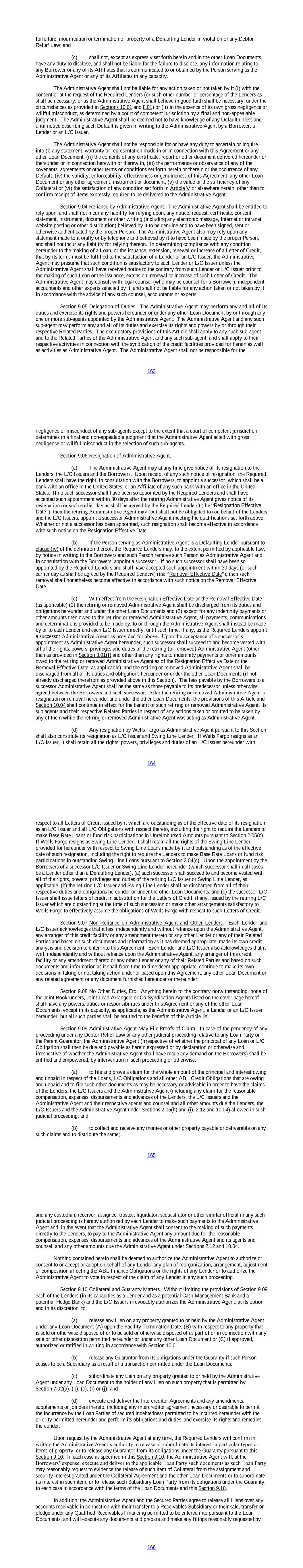 163 forfeiture, modification or termination of property of a Defaulting Lender in violation of any Debtor Relief Law; and (c) shall not, except as expressly set forth herein and in the other Loan Documents, have any duty to disclose, and shall not be liable for the failure to disclose, any information relating to any Borrower or any of its Affiliates that is communicated to or obtained by the Person serving as the Administrative Agent or any of its Affiliates in any capacity. The Administrative Agent shall not be liable for any action taken or not taken by it (i) with the consent or at the request of the Required Lenders (or such other number or percentage of the Lenders as shall be necessary, or as the Administrative Agent shall believe in good faith shall be necessary, under the circumstances as provided in Sections 10.01 and 8.01) or (ii) in the absence of its own gross negligence or willful misconduct, as determined by a court of competent jurisdiction by a final and non-appealable judgment. The Administrative Agent shall be deemed not to have knowledge of any Default unless and until notice describing such Default is given in writing to the Administrative Agent by a Borrower, a Lender or an L/C Issuer. The Administrative Agent shall not be responsible for or have any duty to ascertain or inquire into (i) any statement, warranty or representation made in or in connection with this Agreement or any other Loan Document, (ii) the contents of any certificate, report or other document delivered hereunder or thereunder or in connection herewith or therewith, (iii) the performance or observance of any of the covenants, agreements or other terms or conditions set forth herein or therein or the occurrence of any Default, (iv) the validity, enforceability, effectiveness or genuineness of this Agreement, any other Loan Document or any other agreement, instrument or document, (v) the value or the sufficiency of any Collateral or (vi) the satisfaction of any condition set forth in Article V or elsewhere herein, other than to confirm receipt of items expressly required to be delivered to the Administrative Agent. Section 9.04 Reliance by Administrative Agent. The Administrative Agent shall be entitled to rely upon, and shall not incur any liability for relying upon, any notice, request, certificate, consent, statement, instrument, document or other writing (including any electronic message, Internet or intranet website posting or other distribution) believed by it to be genuine and to have been signed, sent or otherwise authenticated by the proper Person. The Administrative Agent also may rely upon any statement made to it orally or by telephone and believed by it to have been made by the proper Person, and shall not incur any liability for relying thereon. In determining compliance with any condition hereunder to the making of a Loan, or the issuance, extension, renewal or increase of a Letter of Credit, that by its terms must be fulfilled to the satisfaction of a Lender or an L/C Issuer, the Administrative Agent may presume that such condition is satisfactory to such Lender or L/C Issuer unless the Administrative Agent shall have received notice to the contrary from such Lender or L/C Issuer prior to the making of such Loan or the issuance, extension, renewal or increase of such Letter of Credit. The Administrative Agent may consult with legal counsel (who may be counsel for a Borrower), independent accountants and other experts selected by it, and shall not be liable for any action taken or not taken by it in accordance with the advice of any such counsel, accountants or experts. Section 9.05 Delegation of Duties. The Administrative Agent may perform any and all of its duties and exercise its rights and powers hereunder or under any other Loan Document by or through any one or more sub-agents appointed by the Administrative Agent. The Administrative Agent and any such sub-agent may perform any and all of its duties and exercise its rights and powers by or through their respective Related Parties. The exculpatory provisions of this Article shall apply to any such sub-agent and to the Related Parties of the Administrative Agent and any such sub-agent, and shall apply to their respective activities in connection with the syndication of the credit facilities provided for herein as well as activities as Administrative Agent. The Administrative Agent shall not be responsible for the 164 negligence or misconduct of any sub-agents except to the extent that a court of competent jurisdiction determines in a final and non-appealable judgment that the Administrative Agent acted with gross negligence or willful misconduct in the selection of such sub-agents. Section 9.06 Resignation of Administrative Agent. (a) The Administrative Agent may at any time give notice of its resignation to the Lenders, the L/C Issuers and the Borrowers. Upon receipt of any such notice of resignation, the Required Lenders shall have the right, in consultation with the Borrowers, to appoint a successor, which shall be a bank with an office in the United States, or an Affiliate of any such bank with an office in the United States. If no such successor shall have been so appointed by the Required Lenders and shall have accepted such appointment within 30 days after the retiring Administrative Agent gives notice of its resignation (or such earlier day as shall be agreed by the Required Lenders) (the “Resignation Effective Date”), then the retiring Administrative Agent may (but shall not be obligated to) on behalf of the Lenders and the L/C Issuers, appoint a successor Administrative Agent meeting the qualifications set forth above. Whether or not a successor has been appointed, such resignation shall become effective in accordance with such notice on the Resignation Effective Date. (b) If the Person serving as Administrative Agent is a Defaulting Lender pursuant to clause (iv) of the definition thereof, the Required Lenders may, 