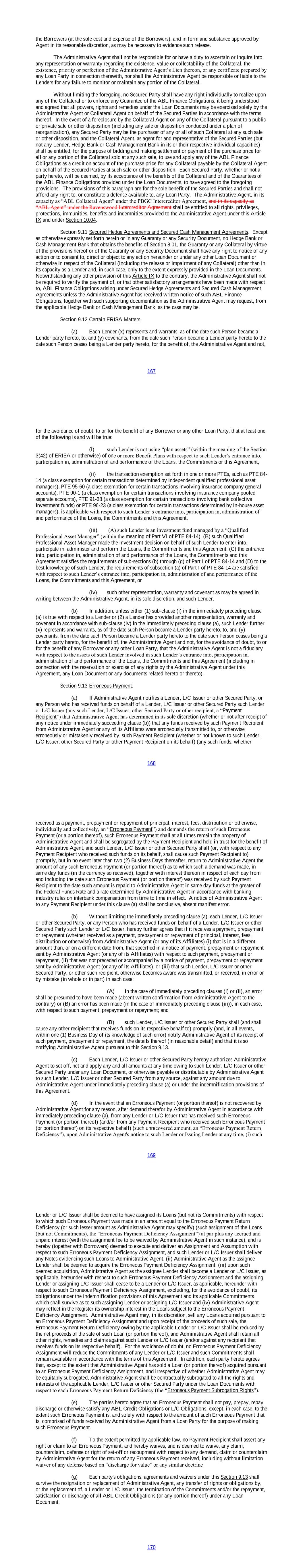 167 the Borrowers (at the sole cost and expense of the Borrowers), and in form and substance approved by Agent in its reasonable discretion, as may be necessary to evidence such release. The Administrative Agent shall not be responsible for or have a duty to ascertain or inquire into any representation or warranty regarding the existence, value or collectability of the Collateral, the existence, priority or perfection of the Administrative Agent’s Lien thereon, or any certificate prepared by any Loan Party in connection therewith, nor shall the Administrative Agent be responsible or liable to the Lenders for any failure to monitor or maintain any portion of the Collateral. Without limiting the foregoing, no Secured Party shall have any right individually to realize upon any of the Collateral or to enforce any Guarantee of the ABL Finance Obligations, it being understood and agreed that all powers, rights and remedies under the Loan Documents may be exercised solely by the Administrative Agent or Collateral Agent on behalf of the Secured Parties in accordance with the terms thereof. In the event of a foreclosure by the Collateral Agent on any of the Collateral pursuant to a public or private sale or other disposition (including any sale or disposition conducted under a plan of reorganization), any Secured Party may be the purchaser of any or all of such Collateral at any such sale or other disposition, and the Collateral Agent, as agent for and representative of the Secured Parties (but not any Lender, Hedge Bank or Cash Management Bank in its or their respective individual capacities) shall be entitled, for the purpose of bidding and making settlement or payment of the purchase price for all or any portion of the Collateral sold at any such sale, to use and apply any of the ABL Finance Obligations as a credit on account of the purchase price for any Collateral payable by the Collateral Agent on behalf of the Secured Parties at such sale or other disposition. Each Secured Party, whether or not a party hereto, will be deemed, by its acceptance of the benefits of the Collateral and of the Guarantees of the ABL Finance Obligations provided under the Loan Documents, to have agreed to the foregoing provisions. The provisions of this paragraph are for the sole benefit of the Secured Parties and shall not afford any right to, or constitute a defense available to, any Loan Party. The Administrative Agent, in its capacity as “ABL Collateral Agent” under the PBGC Intercreditor Agreement, and in its capacity as “ABL Agent” under the Ravenswood Intercreditor Agreement shall be entitled to all rights, privileges, protections, immunities, benefits and indemnities provided to the Administrative Agent under this Article IX and under Section 10.04. Section 9.11 Secured Hedge Agreements and Secured Cash Management Agreements. Except as otherwise expressly set forth herein or in any Guaranty or any Security Document, no Hedge Bank or Cash Management Bank that obtains the benefits of Section 8.01, the Guaranty or any Collateral by virtue of the provisions hereof or of the Guaranty or any Security Document shall have any right to notice of any action or to consent to, direct or object to any action hereunder or under any other Loan Document or otherwise in respect of the Collateral (including the release or impairment of any Collateral) other than in its capacity as a Lender and, in such case, only to the extent expressly provided in the Loan Documents. Notwithstanding any other provision of this Article IX to the contrary, the Administrative Agent shall not be required to verify the payment of, or that other satisfactory arrangements have been made with respect to, ABL Finance Obligations arising under Secured Hedge Agreements and Secured Cash Management Agreements unless the Administrative Agent has received written notice of such ABL Finance Obligations, together with such supporting documentation as the Administrative Agent may request, from the applicable Hedge Bank or Cash Management Bank, as the case may be. Section 9.12 Certain ERISA Matters. (a) Each Lender (x) represents and warrants, as of the date such Person became a Lender party hereto, to, and (y) covenants, from the date such Person became a Lender party hereto to the date such Person ceases being a Lender party hereto, for the benefit of, the Administrative Agent and not, 168 for the avoidance of doubt, to or for the benefit of any Borrower or any other Loan Party, that at least one of the following is and will be true: (i) such Lender is not using “plan assets” (within the meaning of the Section 3(42) of ERISA or otherwise) of one or more Benefit Plans with respect to such Lender’s entrance into, participation in, administration of and performance of the Loans, the Commitments or this Agreement, (ii) the transaction exemption set forth in one or more PTEs, such as PTE 84- 14 (a class exemption for certain transactions determined by independent qualified professional asset managers), PTE 95-60 (a class exemption for certain transactions involving insurance company general accounts), PTE 90-1 (a class exemption for certain transactions involving insurance company pooled separate accounts), PTE 91-38 (a class exemption for certain transactions involving bank collective investment funds) or PTE 96-23 (a class exemption for certain transactions determined by in-house asset managers), is applicable with respect to such Lender’s entrance into, participation in, administration of and performance of the Loans, the Commitments and this Agreement, (iii) (A) such Lender is an investment fund managed by a “Qualified Professional Asset Manager” (within the meaning of Part VI of PTE 84-14), (B) such Qualified Professional Asset Manager made the investment decision on behalf of such Lender to enter into, participate in, administer and perform the Loans, the Commitments and this Agreement, (C) the entrance into, participation in, admini