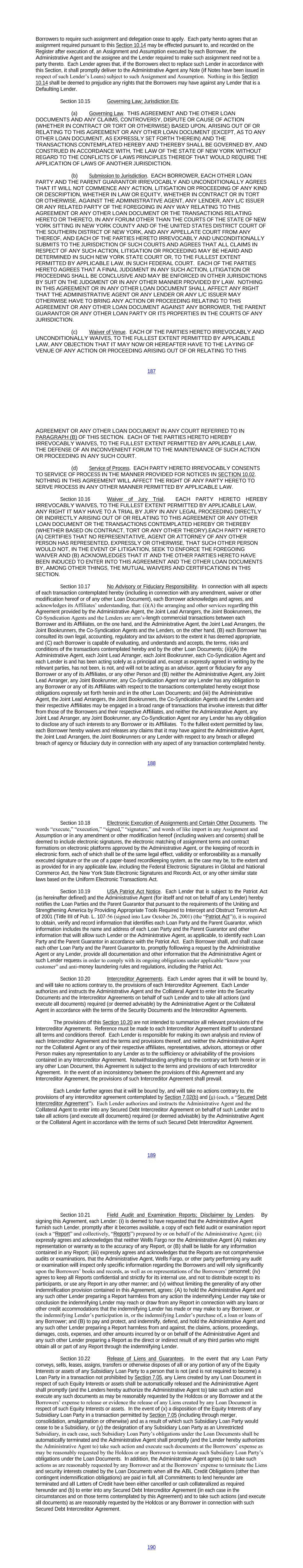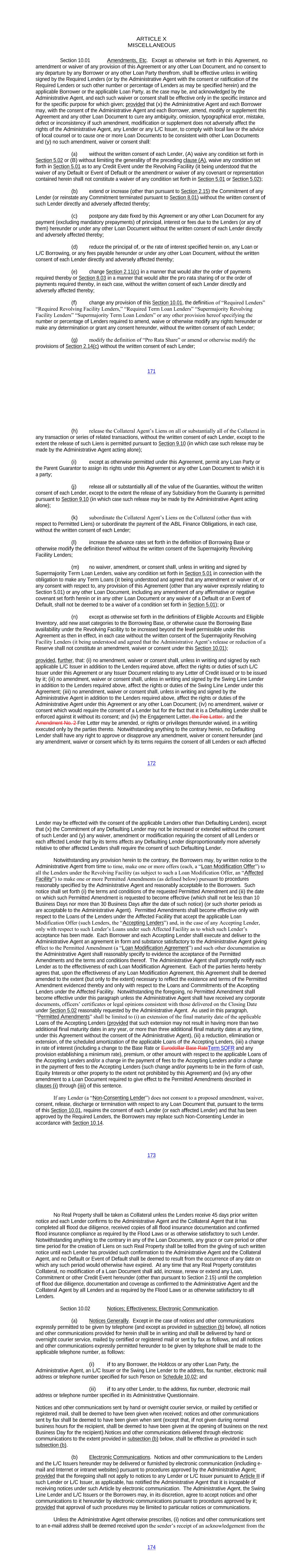 171 ARTICLE X MISCELLANEOUS Section 10.01 Amendments, Etc. Except as otherwise set forth in this Agreement, no amendment or waiver of any provision of this Agreement or any other Loan Document, and no consent to any departure by any Borrower or any other Loan Party therefrom, shall be effective unless in writing signed by the Required Lenders (or by the Administrative Agent with the consent or ratification of the Required Lenders or such other number or percentage of Lenders as may be specified herein) and the applicable Borrower or the applicable Loan Party, as the case may be, and acknowledged by the Administrative Agent, and each such waiver or consent shall be effective only in the specific instance and for the specific purpose for which given; provided that (x) the Administrative Agent and each Borrower may, with the consent of the Administrative Agent and each Borrower, amend, modify or supplement this Agreement and any other Loan Document to cure any ambiguity, omission, typographical error, mistake, defect or inconsistency if such amendment, modification or supplement does not adversely affect the rights of the Administrative Agent, any Lender or any L/C Issuer, to comply with local law or the advice of local counsel or to cause one or more Loan Documents to be consistent with other Loan Documents and (y) no such amendment, waiver or consent shall: (a) without the written consent of each Lender, (A) waive any condition set forth in Section 5.02 or (B) without limiting the generality of the preceding clause (A), waive any condition set forth in Section 5.01 as to any Credit Event under the Revolving Facility (it being understood that the waiver of any Default or Event of Default or the amendment or waiver of any covenant or representation contained herein shall not constitute a waiver of any condition set forth in Section 5.01 or Section 5.02); (b) extend or increase (other than pursuant to Section 2.15) the Commitment of any Lender (or reinstate any Commitment terminated pursuant to Section 8.01) without the written consent of such Lender directly and adversely affected thereby; (c) postpone any date fixed by this Agreement or any other Loan Document for any payment (excluding mandatory prepayments) of principal, interest or fees due to the Lenders (or any of them) hereunder or under any other Loan Document without the written consent of each Lender directly and adversely affected thereby; (d) reduce the principal of, or the rate of interest specified herein on, any Loan or L/C Borrowing, or any fees payable hereunder or under any other Loan Document, without the written consent of each Lender directly and adversely affected thereby; (e) change Section 2.11(c) in a manner that would alter the order of payments required thereby or Section 8.03 in a manner that would alter the pro rata sharing of or the order of payments required thereby, in each case, without the written consent of each Lender directly and adversely affected thereby; (f) change any provision of this Section 10.01, the definition of “Required Lenders” “Required Revolving Facility Lenders,” “Required Term Loan Lenders” “Supermajority Revolving Facility Lenders” “Supermajority Term Loan Lenders” or any other provision hereof specifying the number or percentage of Lenders required to amend, waive or otherwise modify any rights hereunder or make any determination or grant any consent hereunder, without the written consent of each Lender; (g) modify the definition of “Pro Rata Share” or amend or otherwise modify the provisions of Section 2.14(c) without the written consent of each Lender; 172 (h) release the Collateral Agent’s Liens on all or substantially all of the Collateral in any transaction or series of related transactions, without the written consent of each Lender, except to the extent the release of such Liens is permitted pursuant to Section 9.10 (in which case such release may be made by the Administrative Agent acting alone); (i) except as otherwise permitted under this Agreement, permit any Loan Party or the Parent Guarantor to assign its rights under this Agreement or any other Loan Document to which it is a party; (j) release all or substantially all of the value of the Guaranties, without the written consent of each Lender, except to the extent the release of any Subsidiary from the Guaranty is permitted pursuant to Section 9.10 (in which case such release may be made by the Administrative Agent acting alone); (k) subordinate the Collateral Agent’s Liens on the Collateral (other than with respect to Permitted Liens) or subordinate the payment of the ABL Finance Obligations, in each case, without the written consent of each Lender; (l) increase the advance rates set forth in the definition of Borrowing Base or otherwise modify the definition thereof without the written consent of the Supermajority Revolving Facility Lenders; (m) no waiver, amendment, or consent shall, unless in writing and signed by Supermajority Term Loan Lenders, waive any condition set forth in Section 5.01 in connection with the obligation to make any Term Loans (it being understood and agreed that any amendment or waiver of, or any consent with respect to, any provision of this Agreement (other than any waiver expressly relating to Section 5.01) or any other Loan Document, including any amendment of any affirmative or negative covenant set forth herein or in any other Loan Document or any waiver of a Default or an Event of Default, shall not be deemed to be a waiver of a condition set forth in Section 5.01); or (n) except as otherwise set forth in the definitions of Eligible Accounts and Eligible Inventory, add new asset categories to the Borrowing Base, or otherwise cause the Borrowing Base availability under the Revolving Facility to be increased beyond the level permissible under this Agreement as then in effect, in each case without the written consent of the Supermajority Revolving Facility Lenders (