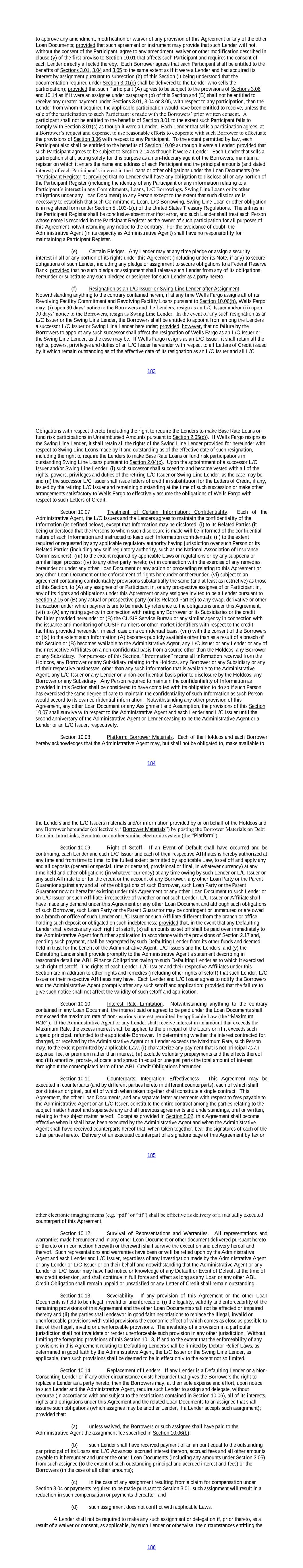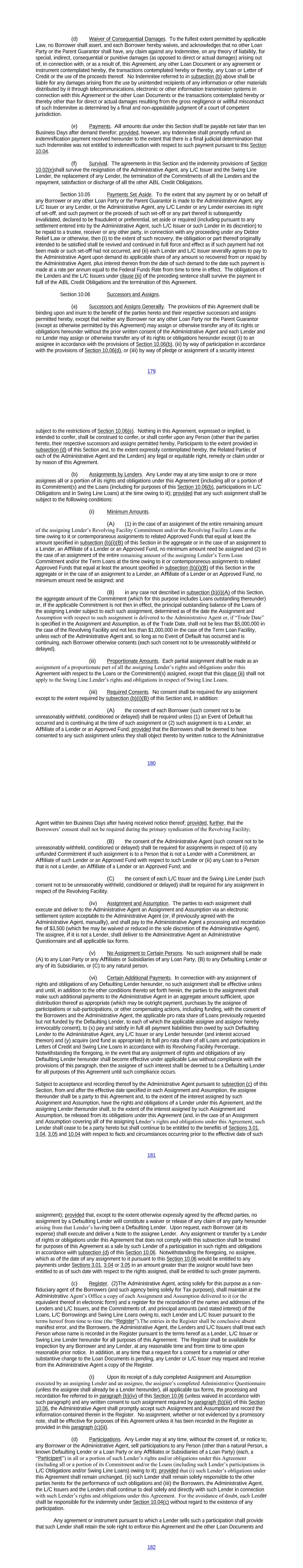 179 (d) Waiver of Consequential Damages. To the fullest extent permitted by applicable Law, no Borrower shall assert, and each Borrower hereby waives, and acknowledges that no other Loan Party or the Parent Guarantor shall have, any claim against any Indemnitee, on any theory of liability, for special, indirect, consequential or punitive damages (as opposed to direct or actual damages) arising out of, in connection with, or as a result of, this Agreement, any other Loan Document or any agreement or instrument contemplated hereby, the transactions contemplated hereby or thereby, any Loan or Letter of Credit or the use of the proceeds thereof. No Indemnitee referred to in subsection (b) above shall be liable for any damages arising from the use by unintended recipients of any information or other materials distributed by it through telecommunications, electronic or other information transmission systems in connection with this Agreement or the other Loan Documents or the transactions contemplated hereby or thereby other than for direct or actual damages resulting from the gross negligence or willful misconduct of such Indemnitee as determined by a final and non-appealable judgment of a court of competent jurisdiction. (e) Payments. All amounts due under this Section shall be payable not later than ten Business Days after demand therefor; provided, however, any Indemnitee shall promptly refund an indemnification payment received hereunder to the extent that there is a final judicial determination that such Indemnitee was not entitled to indemnification with respect to such payment pursuant to this Section 10.04. (f) Survival. The agreements in this Section and the indemnity provisions of Section 10.02(e)shall survive the resignation of the Administrative Agent, any L/C Issuer and the Swing Line Lender, the replacement of any Lender, the termination of the Commitments of all the Lenders and the repayment, satisfaction or discharge of all the other ABL Credit Obligations. Section 10.05 Payments Set Aside. To the extent that any payment by or on behalf of any Borrower or any other Loan Party or the Parent Guarantor is made to the Administrative Agent, any L/C Issuer or any Lender, or the Administrative Agent, any L/C Lender or any Lender exercises its right of set-off, and such payment or the proceeds of such set-off or any part thereof is subsequently invalidated, declared to be fraudulent or preferential, set aside or required (including pursuant to any settlement entered into by the Administrative Agent, such L/C Issuer or such Lender in its discretion) to be repaid to a trustee, receiver or any other party, in connection with any proceeding under any Debtor Relief Law or otherwise, then (i) to the extent of such recovery, the obligation or part thereof originally intended to be satisfied shall be revived and continued in full force and effect as if such payment had not been made or such set-off had not occurred, and (ii) each Lender and L/C Issuer severally agrees to pay to the Administrative Agent upon demand its applicable share of any amount so recovered from or repaid by the Administrative Agent, plus interest thereon from the date of such demand to the date such payment is made at a rate per annum equal to the Federal Funds Rate from time to time in effect. The obligations of the Lenders and the L/C Issuers under clause (ii) of the preceding sentence shall survive the payment in full of the ABL Credit Obligations and the termination of this Agreement. Section 10.06 Successors and Assigns. (a) Successors and Assigns Generally. The provisions of this Agreement shall be binding upon and inure to the benefit of the parties hereto and their respective successors and assigns permitted hereby, except that neither any Borrower nor any other Loan Party nor the Parent Guarantor (except as otherwise permitted by this Agreement) may assign or otherwise transfer any of its rights or obligations hereunder without the prior written consent of the Administrative Agent and each Lender and no Lender may assign or otherwise transfer any of its rights or obligations hereunder except (i) to an assignee in accordance with the provisions of Section 10.06(b), (ii) by way of participation in accordance with the provisions of Section 10.06(d), or (iii) by way of pledge or assignment of a security interest 180 subject to the restrictions of Section 10.06(e). Nothing in this Agreement, expressed or implied, is intended to confer, shall be construed to confer, or shall confer upon any Person (other than the parties hereto, their respective successors and assigns permitted hereby, Participants to the extent provided in subsection (d) of this Section and, to the extent expressly contemplated hereby, the Related Parties of each of the Administrative Agent and the Lenders) any legal or equitable right, remedy or claim under or by reason of this Agreement. (b) Assignments by Lenders. Any Lender may at any time assign to one or more assignees all or a portion of its rights and obligations under this Agreement (including all or a portion of its Commitment(s) and the Loans (including for purposes of this Section 10.06(b), participations in L/C Obligations and in Swing Line Loans) at the time owing to it); provided that any such assignment shall be subject to the following conditions: (i) Minimum Amounts. (A) (1) in the case of an assignment of the entire remaining amount of the assigning Lender’s Revolving Facility Commitment and/or the Revolving Facility Loans at the time owing to it or contemporaneous assignments to related Approved Funds that equal at least the amount specified in subsection (b)(i)(B) of this Section in the aggregate or in the case of an assignment to a Lender, an Affiliate of a Lender or an Approved Fund, no minimum amount need be assigned and (2) in the case of an assignment of the entire remaining amount of the assigning Lender’s Term Loan Commitment and/or the Term Loans at the time owing to i