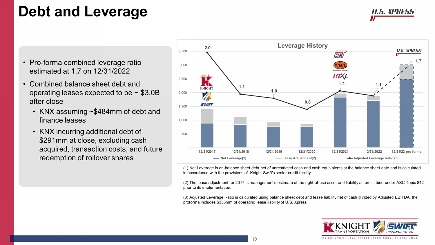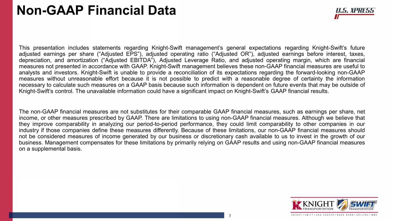 2 This communication contains “forward - looking statements,” within the meaning of Section 27 A of the Securities Act of 1933 , Section 21 E of the Securities Exchange Act of 1934 and the Private Securities Litigation Reform Act of 1995 that provides a safe harbor for forward - looking statements, including statements relating to the completion of the transaction, all statements that do not relate solely to historical or current facts, and expectations, intentions or strategies regarding the future . These forward - looking statements are generally denoted by the use of words such as “anticipate,” “believe,” “expect,” “intend,” “aim,” “target,” “plan,” “continue,” “estimate,” “project,” “may,” “will,” “should,” “could,” “would,” “predict,” “potential,” “ongoing,” “goal,” “can,” “seek,” “designed,” “likely,” “foresee,” “forecast,” “project,” “hope,” “strategy,” “objective,” “mission,” “continue,” “outlook,” “potential,” “feel,” and similar expressions . However, the absence of these words or similar expressions does not mean that a statement is not forward - looking . Statements in this announcement that are forward looking may include, but are not limited to, statements regarding the benefits of the proposed transaction with U . S . Xpress (“USX”) and the associated integration plans, expected synergies and revenue opportunities, expected branding, anticipated future operating performance and results of Knight - Swift (“KNX”), including statements regarding anticipated earnings, margins, and cash flows, anticipated future liquidity, anticipated availability of future resources, financial or otherwise, anticipated growth opportunities, anticipated fleet size, the availability of the merger consideration, the expected management and governance of U . S . Xpress following the transaction and the expected timing of the closing of the proposed transaction and other transactions contemplated by the proposed transaction . By their nature, all forward - looking statements are not guarantees of future performance or results and are subject to risks and uncertainties that are difficult to predict and/or quantify . Such risks and uncertainties include, but are not limited to : the occurrence of any event, change or other circumstance that could give rise to the right of Knight - Swift or U . S . Xpress or both of them to terminate the proposed transaction, including circumstances requiring U . S . Xpress to pay Knight - Swift a termination fee pursuant to the merger agreement ; the failure to obtain applicable regulatory or U . S . Xpress stockholder approval in a timely manner or otherwise ; the risk that the transaction may not close in the anticipated timeframe or at all due to one or more of the other closing conditions to the transaction not being satisfied or waived ; the risk that there may be unexpected costs, charges or expenses resulting from the proposed transaction ; risks related to the ability of Knight - Swift and U . S . Xpress to successfully integrate the businesses and achieve the expected synergies and operating efficiencies within the expected timeframes or at all and the possibility that such integration may be more difficult, time consuming or costly than expected ; risks that the proposed transaction disrupts Knight - Swift’s or U . S . Xpress’ current plans and operations ; the risk that certain restrictions during the pendency of the proposed transaction may impact Knight - Swift’s or U . S . Xpress’ ability to pursue certain business opportunities or strategic transactions ; risks related to disruption of each company’s management’s time and attention from ongoing business operations due to the proposed transaction ; continued and sufficient availability of capital and financing ; the risk that any announcements relating to the proposed transaction could have adverse effects on the market price of Knight - Swift’s and/or U . S . Xpress’ common stock or operating results ; the risk that the proposed transaction and its announcement could have an adverse effect on the ability of Knight - Swift and U . S . Xpress to retain and hire key personnel, to retain customers and to maintain relationships with each of their respective business partners, suppliers and customers and on their respective operating results and businesses generally ; the risk of litigation that could be instituted against the parties to the Merger Agreement or their respective directors, affiliated persons or officers and/or regulatory actions related to the proposed transaction, including the effects of any outcomes related thereto ; risks related to changes in accounting standards or tax rates, laws or regulations ; risks related to unpredictable and severe or catastrophic events, including but not limited to acts of terrorism, war or hostilities (including effects of the conflict in Ukraine), cyber - attacks, or the impact of the COVID - 19 pandemic or any other pandemic, epidemic or outbreak of an infectious disease in the United States or worldwide on Knight - Swift’s or U . S . Xpress’ business, financial condition and results of operations, as well as the response thereto by each company ; and other business effects, including the effects of industry, market, economic (including the effect of inflation), political or regulatory conditions . Also, Knight - Swift’s and U . S . Xpress’ actual results may differ materially from those contemplated by the forward - looking statements for a number of additional reasons as described in Knight - Swift’s and U . S . Xpress’ respective SEC filings, including those set forth in the Risk Factors section and under any “Forward - Looking Statements” or similar heading in Knight - Swift’s or U . S . Xpress’ respective most recently filed Annual Report on Form 10 - K for the year ended