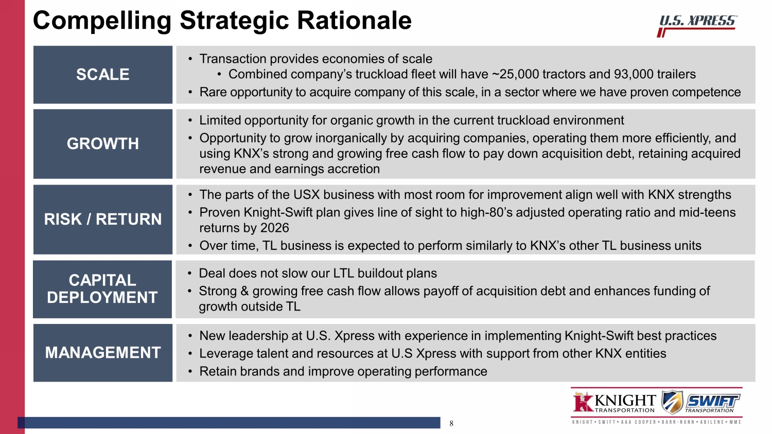 7 • U.S. Xpress will continue as a separate brand with separate operations similar to prior KNX acquisitions • At closing, the Fullers along with Eric Peterson, CFO, will transition out of their executive officer roles while remaining available to ensure a smooth transition • At closing, Tim H arrington and Josh Smith, both leaders at Swift through the Knight - Swift merger, will assume the roles at U.S. Xpress of President and CFO, respectively • Existing KNX Board of Directors to remain unchanged • USX to maintain presence in Chattanooga, TN GOVERNANCE • Expected to close late second quarter / early third quarter of 2023 TIMING Deal Summary - Continued