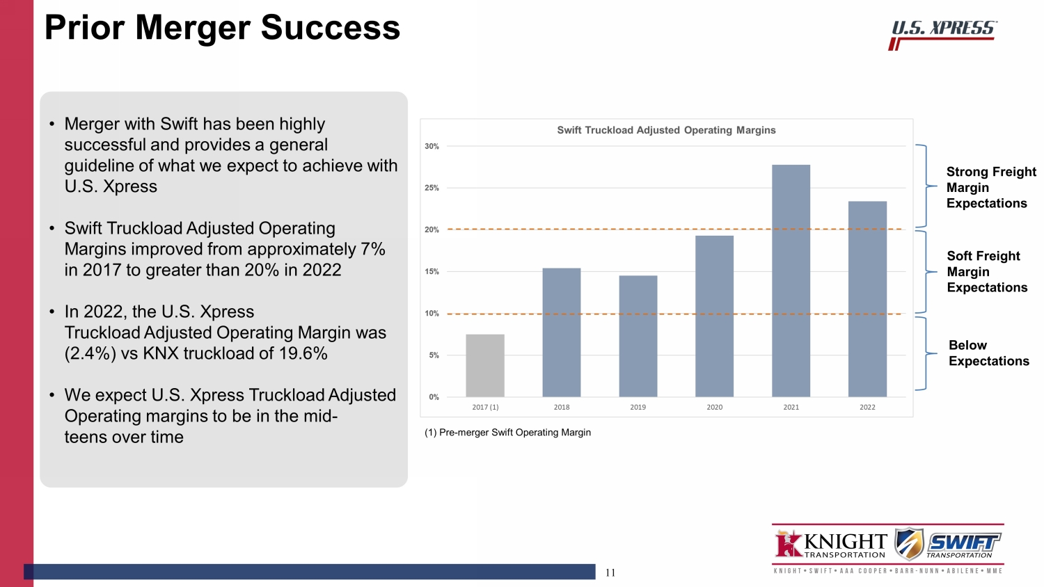 10 (1) Net Leverage is on - balance sheet debt net of unrestricted cash and cash equivalents at the balance sheet date and is calcula ted in accordance with the provisions of Knight - Swift's senior credit facility. (2) The lease adjustment for 2017 is management's estimate of the right - of - use asset and liability as prescribed under ASC Topic 842 prior to its implementation. (3) Adjusted Leverage Ratio is calculated using balance sheet debt and lease liability net of cash divided by Adjusted EBITDA , t he proforma includes $336mm of operating lease liability of U.S. Xpress • Pro - forma combined leverage ratio estimated at 1.7 on 12/31/2022 • Combined balance sheet debt and operating leases expected to be ~ $3.0B after close • KNX assuming ~$484mm of debt and finance leases • KNX incurring additional debt of $291mm at close, excluding cash acquired, transaction costs, and future redemption of rollover shares Debt and Leverage