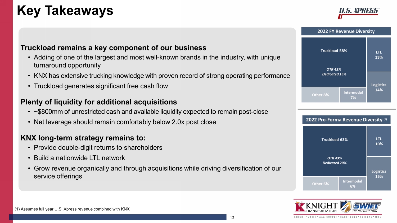 11 • Merger with Swift has been highly successful and provides a general guideline of what we expect to achieve with U.S. Xpress • Swift Truckload Adjusted Operating Margins improved from approximately 7% in 2017 to greater than 20% in 2022 • In 2022, the U.S. Xpress Truckload Adjusted Operating Margin was (2.4%) vs KNX truckload of 19.6% • We expect U.S. Xpress Truckload Adjusted Operating margins to be in the mid - teens over time Strong Freight Margin Expectations Soft Freight Margin Expectations Below Expectations (1) Pre - merger Swift Operating Margin Prior Merger Success