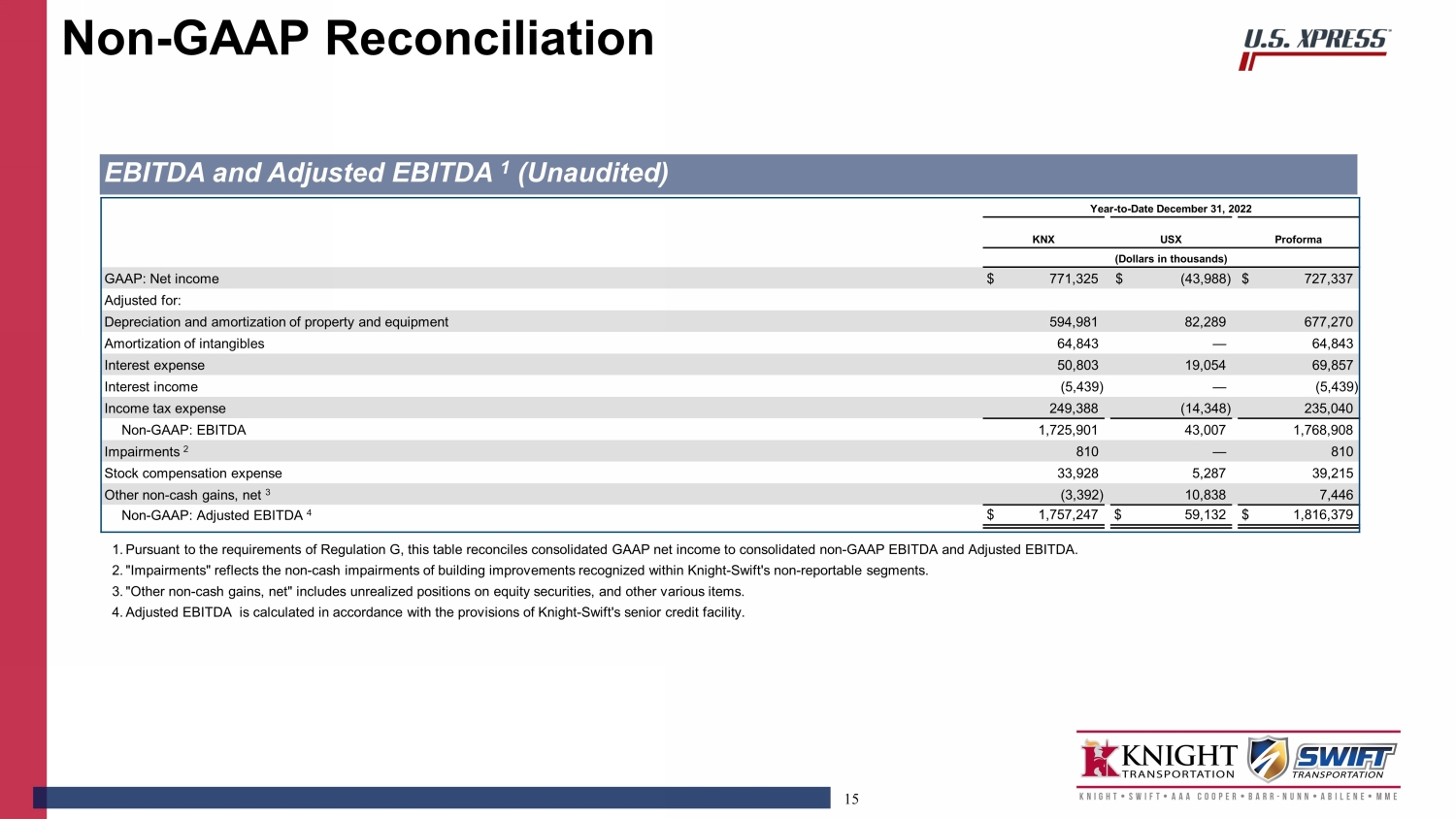 14 As of December 31, 2022 KNX USX Pro forma Adjustments 2 Proforma (Dollars in thousands) Term loans $ 1,000,000 $ — $ — $ 1,000,000 Revolving line of credit 43,000 96,200 291,000 430,200 Accounts receivable securitization 419,000 — — 419,000 Revenue equipment installment notes — 346,352 — 346,352 Mortgage notes payable — 23,108 — 23,108 Other secured debt and finance leases 442,051 18,238 — 460,289 Total face value of debt 1,904,051 483,898 291,000 2,678,949 Unrestricted cash and cash equivalents (196,770) (2,275) — (199,045) Non - GAAP: Net Leverage 1,707,281 481,623 291,000 2,479,904 Operating Leases 186,953 335,583 — 522,536 Non - GAAP: Adjusted Net Leverage $ 1,894,234 $ 817,206 $ 291,000 $ 3,002,440 Non - GAAP: Adjusted EBITDA - Year - to - Date December 31, 2022 $ 1,757,247 $ 59,132 $ — $ 1,816,379 Non - GAAP: Leverage Ratio 3 0.97 8.14 1.37 Non - GAAP: Adjusted Leverage Ratio 4 1.08 13.82 1.65 Net Leverage and Leverage Ratio 1 (Unaudited) 1. Pursuant to the requirements of Regulation G, these tables reconcile consolidated GAAP net income attributable to Knight - Swift and net income attributable to U . S . Express to non - GAAP consolidated EBITDA, Adjusted EBITDA, Net Leverage, and Leverage Ratio . 2. "Pro forma adjustments" represents additional debt Knight - Swift expects to incur upon closing of the transaction . 3. "Leverage Ratio" is calculated in accordance with the provisions of Knight - Swift's senior credit facility . 4. "Adjusted Leverage Ratio" is the Leverage Ratio adjusted to add the operating lease liability to net leverage which is then divided by Adjusted EBITDA to calculate the Adjusted Leverage Ratio . Non - GAAP Reconciliation