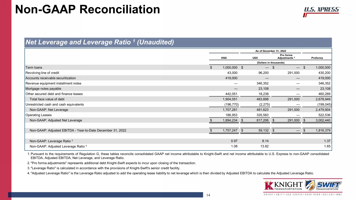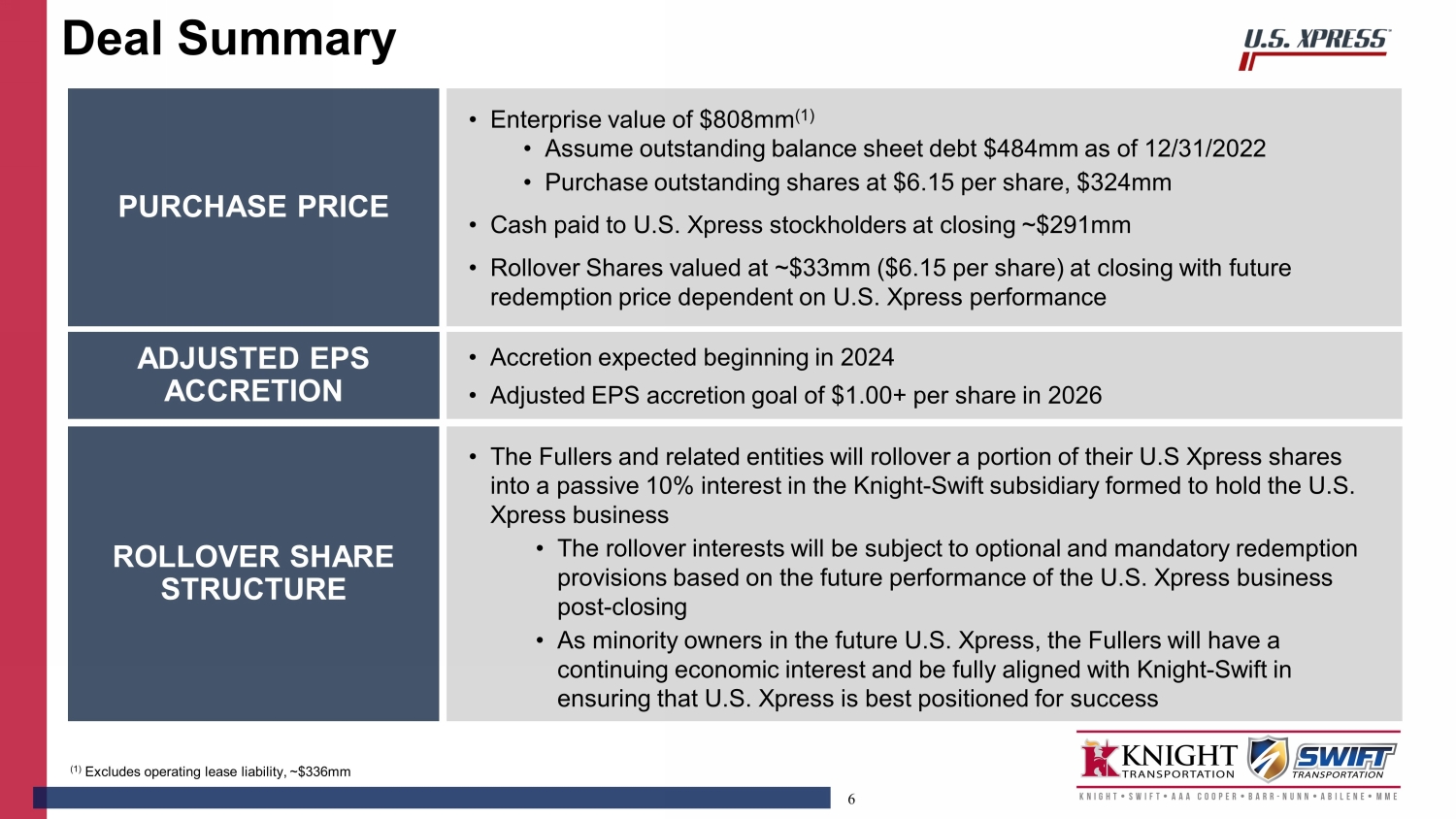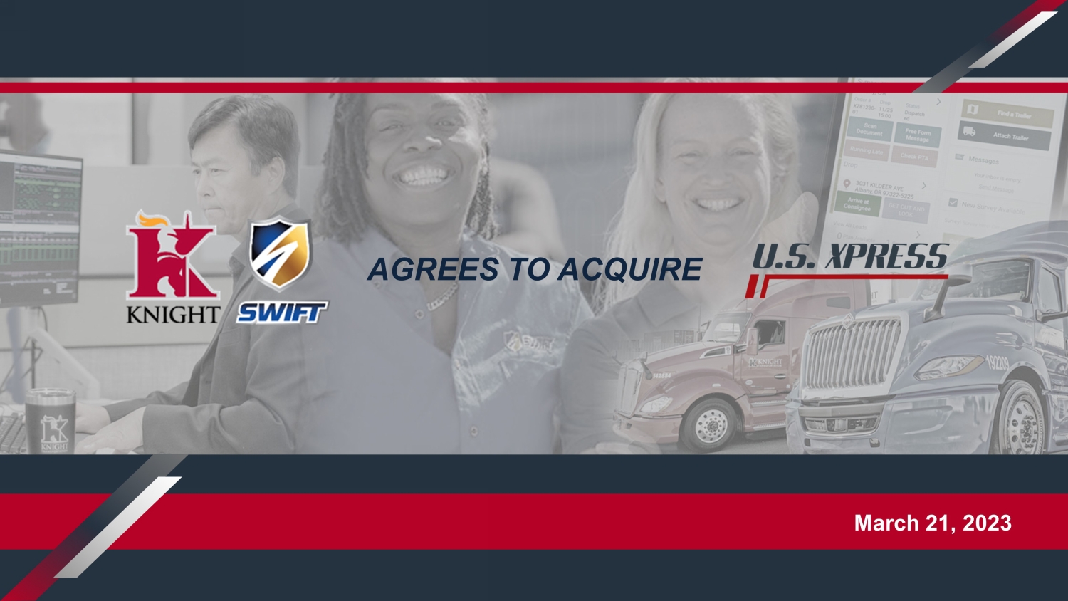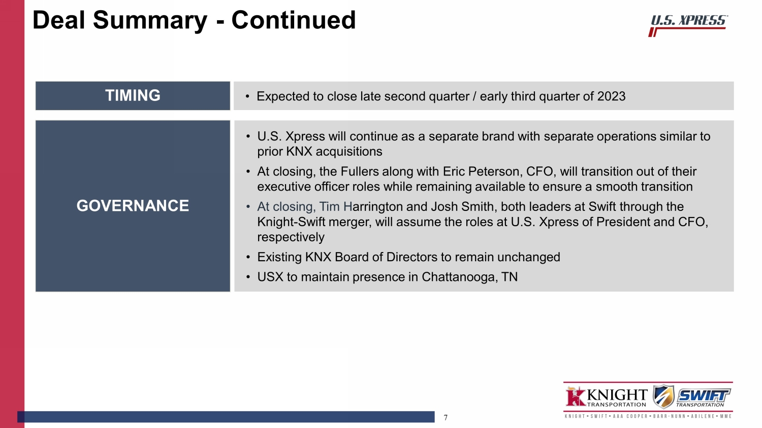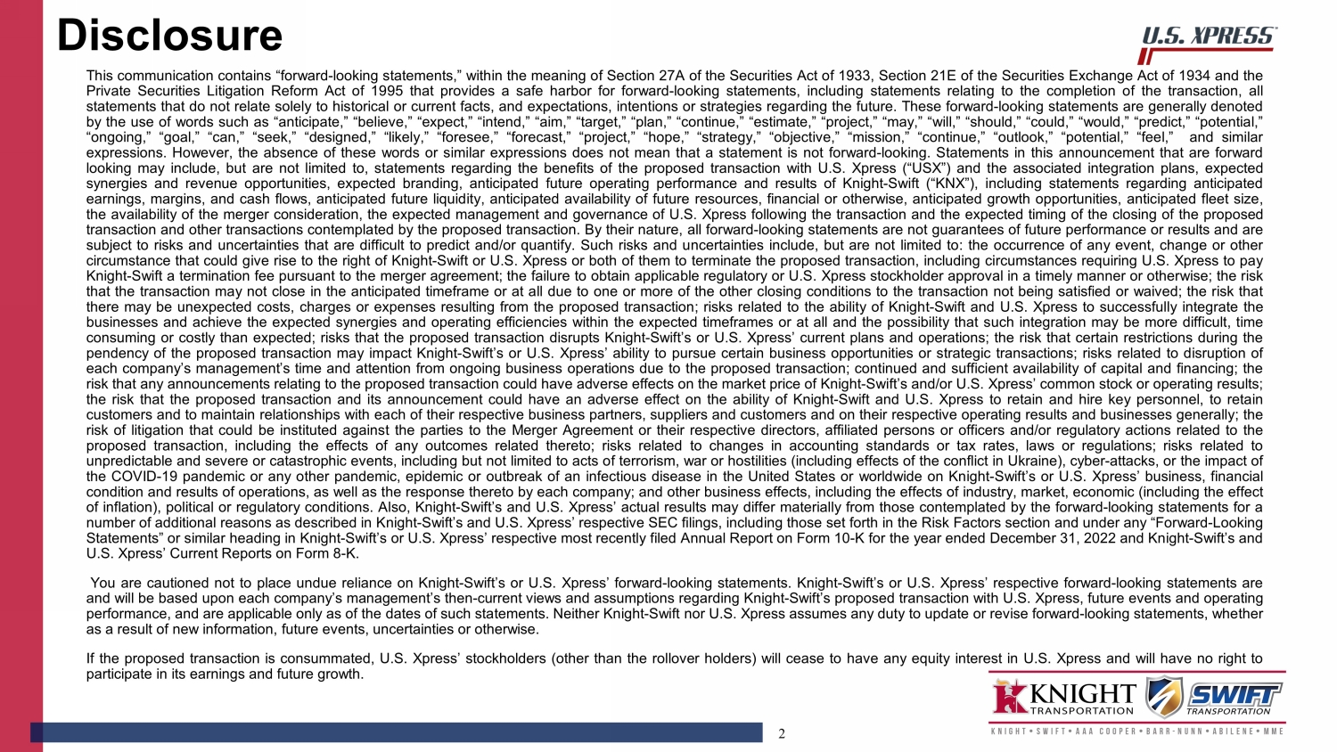 This communication contains “forward-looking statements” as that term is defined under the Private Securities Litigation Reform Act of 1995 and other securities laws, regarding Knight-Swift Transportation Holdings Inc. and U.S. Xpress Enterprises, Inc., including, but not limited to, statements about the strategic rationale and benefits of the proposed transaction between Knight-Swift Transportation Holdings Inc. and U.S. Xpress Enterprises, Inc., including future financial and operating results, Knight-Swift Transportation Holdings Inc.’s or U.S. Xpress Enterprises, Inc.’s plans, objectives, expectations and intentions and the expected timing of completion of the proposed transaction. You can generally identify forward-looking statements by the use of forward-looking terminology such as “anticipate,” “believe,” “continue,” “could,” “estimate,” “expect,” “explore,” “evaluate,” “forecast,” “intend,” “may,” “might,” “plan,” “potential,” “predict,” “project,” “seek,” “should,” “targeted,” “will,” or “would,” or the negative thereof or other variations thereon or comparable terminology. These forward-looking statements are based on each of the companies’ current plans, objectives, estimates, expectations and intentions and inherently involve significant risks and uncertainties, many of which are beyond Knight-Swift Transportation Holdings Inc.’s or U.S. Xpress Enterprises, Inc.’s control. Although we believe the expectations reflected in any forward-looking statements are based on reasonable assumptions, we can give no assurance that our expectations will be attained, and therefore actual results and the timing of events could differ materially from those anticipated in such forward-looking statements as a result of these risks and uncertainties, which include, without limitation, risks and uncertainties associated with: Knight-Swift Transportation Holdings Inc.’s and U.S. Xpress Enterprises, Inc.’s ability to complete the potential transaction on the proposed terms or on the anticipated timeline, or at all, including risks and uncertainties related to securing the necessary regulatory and U.S. Xpress Enterprises, Inc. stockholders’ approvals and the satisfaction of other closing conditions to consummate the proposed transaction; the occurrence of any event, change or other circumstance that could give rise to the termination of the definitive merger agreement relating to the proposed transaction; failure to realize the expected benefits of the proposed transaction; significant transaction costs and/or unknown or inestimable liabilities; the risk that U.S. Xpress Enterprises, Inc.’s business will not be integrated successfully, or that such integration may be more difficult, time-consuming or costly than expected; Knight-Swift Transportation Holdings Inc.’s financial ability to consummate the proposed transaction, and the continued availability of capital and financing for Knight-Swift Transportation Holdings Inc. following the proposed transaction; risks related to future opportunities and plans for the combined company, including the uncertainty of expected future regulatory filings, financial performance, supply chain conditions, gross domestic product changes and results of the combined company following completion of the proposed transaction; disruption from the proposed transaction, making it more difficult to conduct business as usual or maintain relationships with customers, employees, drivers or suppliers, including as it relates to U.S. Xpress Enterprises, Inc.’s ability to successfully renew existing customer contracts on favorable terms or at all and obtain new customers; the ability of U.S. Xpress Enterprises, Inc. to retain and hire key personnel; the diversion of management’s attention from ongoing business operations; the business, economic and political conditions in the markets in which U.S. Xpress Enterprises, Inc. operates; the impact of new or changes in current laws, regulations or other industry standards; effects relating to the announcement of the proposed transaction or any further announcements or the consummation of the potential transaction on the market price of U.S. Xpress Enterprises, Inc.’s common stock; the risk of potential stockholder litigation associated with the potential transaction, including resulting expense or delay; risks that the price of U.S. Xpress Enterprises, Inc.’s common stock may decline significantly if the Merger is not completed; the possibility that U.S. Xpress Enterprises, Inc. could, following risks that the price of U.S. Xpress Enterprises, Inc.’s common stock may decline significantly if the Merger is not completed; the possibility that U.S. Xpress Enterprises, Inc. could, following the proposed transaction, engage in operational or other changes that could result in meaningful appreciation in its value; the possibility that U.S. Xpress Enterprises, Inc. could, at a later date, engage in unspecified transactions, including restructuring efforts, special dividends or the sale of some or all of U.S. Xpress Enterprises, Inc.’s assets to one or more as yet unknown purchasers, which could conceivably produce a higher aggregate value than that available to U.S. Xpress Enterprises, Inc.'s stockholders in the proposed transaction; regulatory initiatives and changes in tax laws; the impact of the COVID-19 pandemic on the operations and financial results of U.S. Xpress Enterprises, Inc. or the combined company; general economic conditions; and other risks and uncertainties affecting Knight-Swift Transportation Holdings Inc. and U.S. Xpress Enterprises, Inc., including those described from time to time under the caption “Risk Factors” and elsewhere in Knight-Swift Transportation Holdings Inc.’s and U.S. Xpress Enterprises, Inc.’s SEC filings and reports, including Knight-Swift Transportation Holdings Inc.’s Annual 