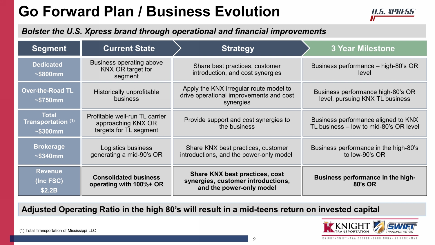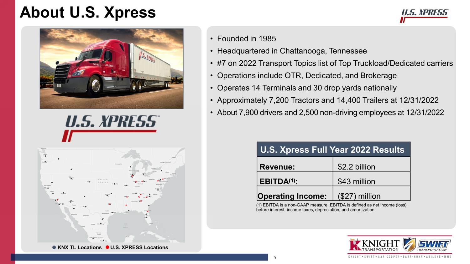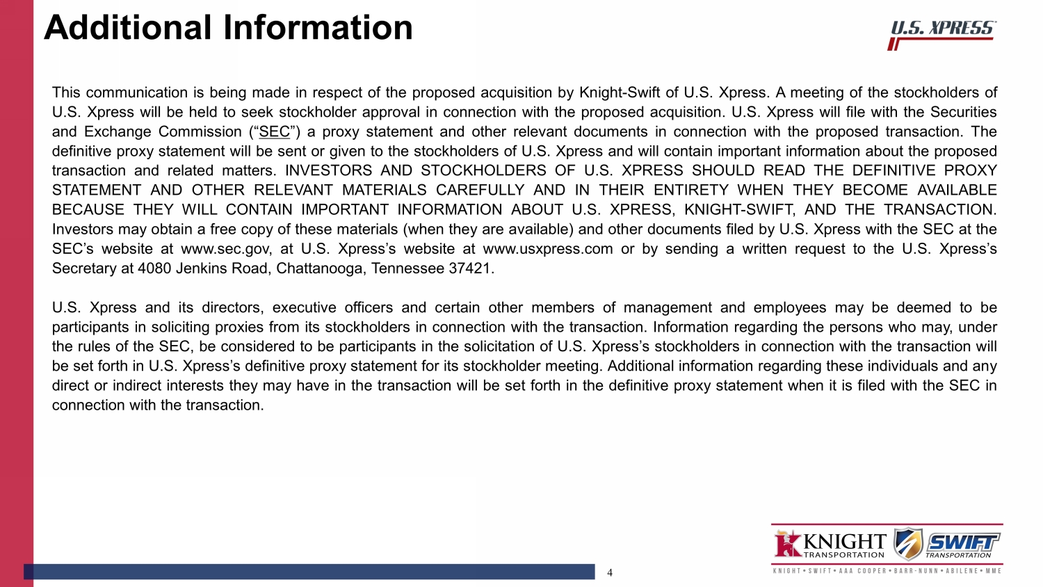 This communication is being made in connection with the proposed transaction between U.S. Xpress Enterprises, Inc. and Knight-Swift Transportation Holdings Inc. In connection with the proposed transaction, U.S. Xpress Enterprises, Inc. intends to file a proxy statement with the SEC. U.S. Xpress Enterprises, Inc. may also file other relevant documents with the SEC regarding the proposed transaction. The information in the preliminary proxy statement will not be complete and may be changed. The definitive proxy statement will be delivered to stockholders of U.S. Xpress Enterprises, Inc. This communication is not a substitute for any proxy statement or any other document that may be filed with the SEC in connection with the proposed transaction.