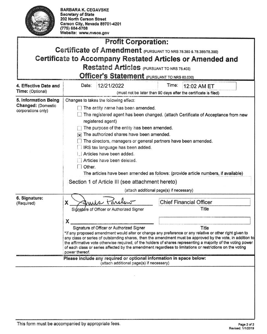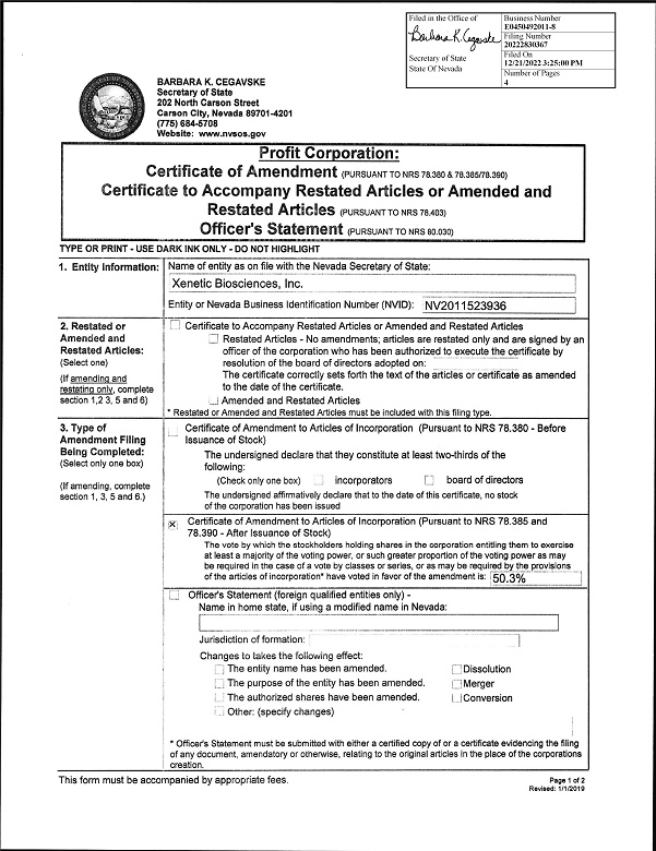 BARBARA K. CEGAVSKE Secretary of State 206 North Carson Street Carson City, Nevada 89701 - 4299 (775) 684 - 5708 Website: www.nvsos.gov Certificate of Change filed Pursuant to NRS 78.209 For Nevada Profit Corporations 1. Name of corporation: Xenetic Biosciences, Inc. Entity or Nevada Business Identification Number (NVID): NV2011 l 523936 2. The current number of authorized shares and the par value, if any, of each class or series, if any, of shares before the change: 50,000,000 common shares, par value $0.001 10,000,000 preferred shares, par value $0.00 I 3. The number of authorized shares and the par value, if any, of each class or series, if any, of shares after the change: 100,000,000 common shares, par value $0.001 10,000,000 preferred shares, par value $0.001 4. The number of shares of each affected class or series, if any, to be issued after the change in exchange for each issue share of the same class or series : 5. The provisions, if any, for the issuance of fractional shares, or for the payment of money or the Issuance of scrip to stockholders otherwise entitled to a fraction of a share and the percentage of outstanding 5 hares affected thereby : 6. TM required approval of the stockholders has been obtained. 7. Effective date and time of filing (optional): Date: December 21, 2022 8. Signature: (required): tf,&ji,,,,.,.' - '! - ε ;<, ε • ε - - Chief Financial Officer er Title Time: 12:02 AM ET 12/21/22 Date