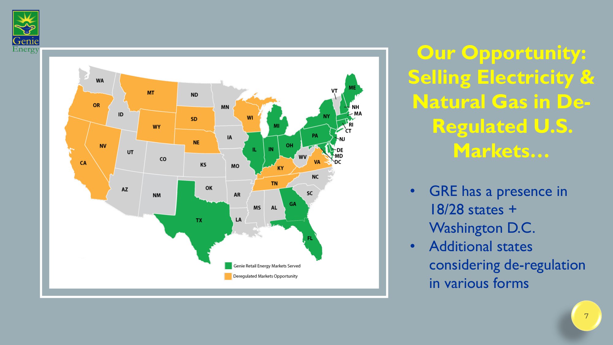 Our Opportunity: Selling Electricity & Natural Gas in De - Regulated U.S. Markets… • GRE has a presence in 18/28 states + Washington D.C. • Additional states considering de - regulation in various forms 7