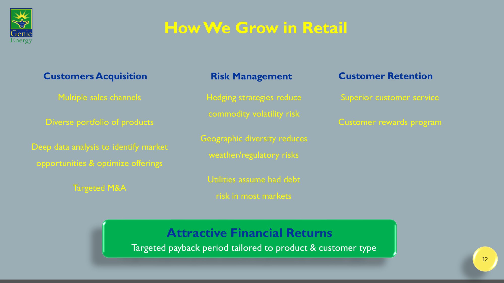 …Complemented by Inorganic Growth Retail Acquisitions – customer books or companies 01 Direct purchase & development of solar farms by GREW 02 General Partner for Sunlight Energy Investments - owned solar farms 03 Acquire new renewable technologies 04 11