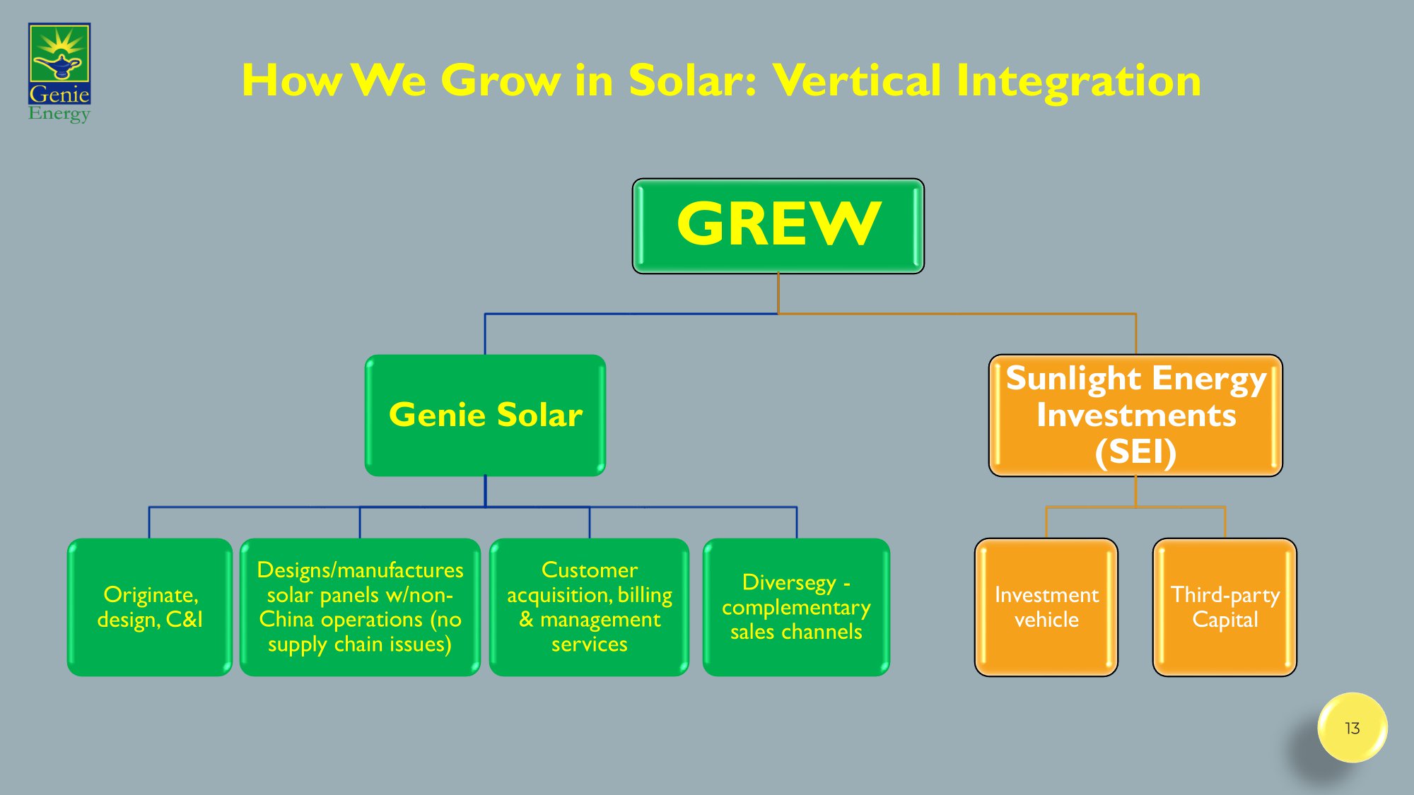 How We Grow in Solar: Vertical Integration 13 GREW Genie Solar Originate, design, C&I Designs/manufactures solar panels w/non - China operations (no supply chain issues) Customer acquisition, billing & management services Diversegy - complementary sales channels Sunlight Energy Investments (SEI) Investment vehicle Third - party Capital
