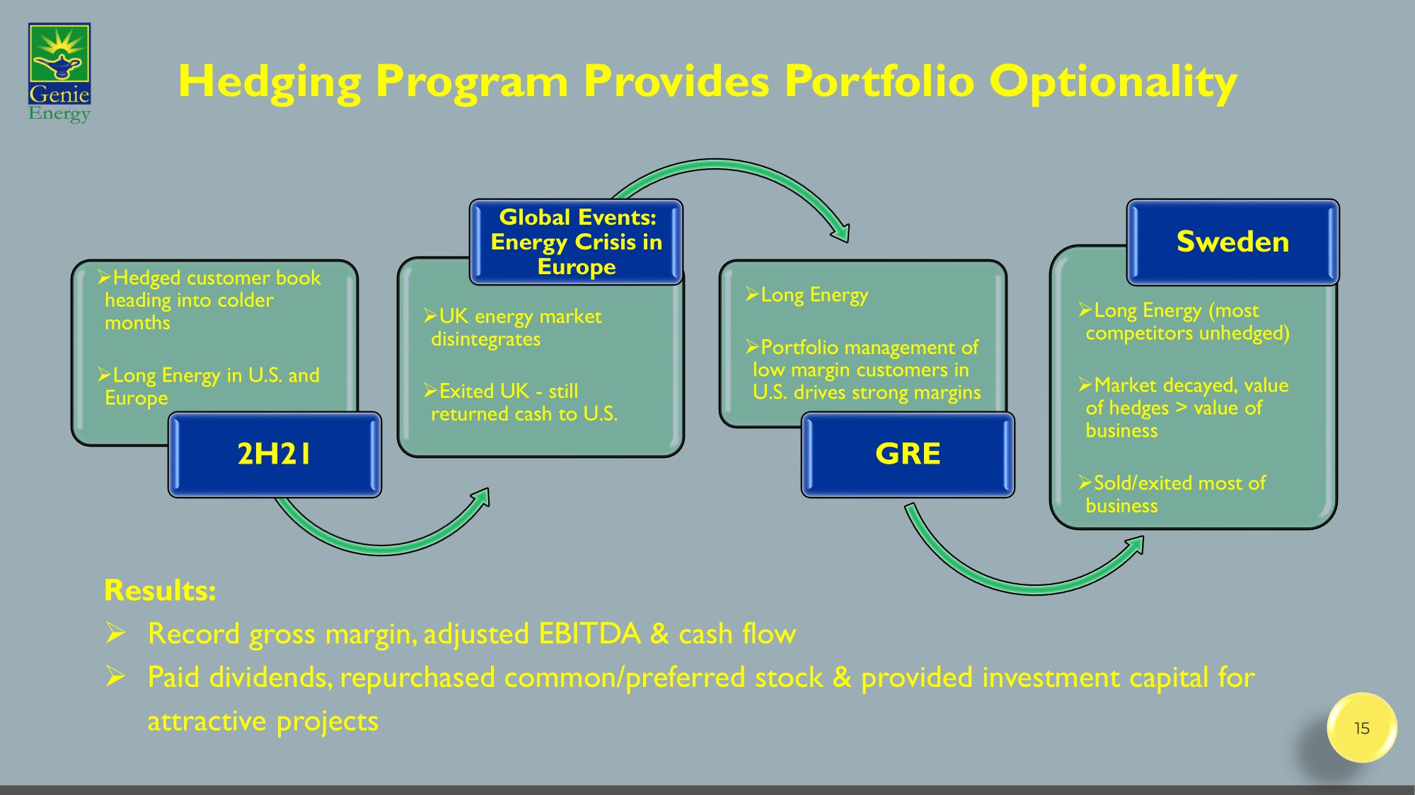 » Hedged customer book heading into colder months » Long Energy in U.S. and Europe 2H21 » UK energy market disintegrates » Exited UK - still returned cash to U.S. Global Events: Energy Crisis in Europe » Long Energy » Portfolio management of low margin customers in U.S. drives strong margins GRE » Long Energy (most competitors unhedged) » Market decayed, value of hedges > value of business » Sold/exited most of business Sweden Hedging Program Provides Portfolio Optionality Results: » Record gross margin, adjusted EBITDA & cash flow » Paid dividends, repurchased common/preferred stock & provided investment capital for attractive projects 15