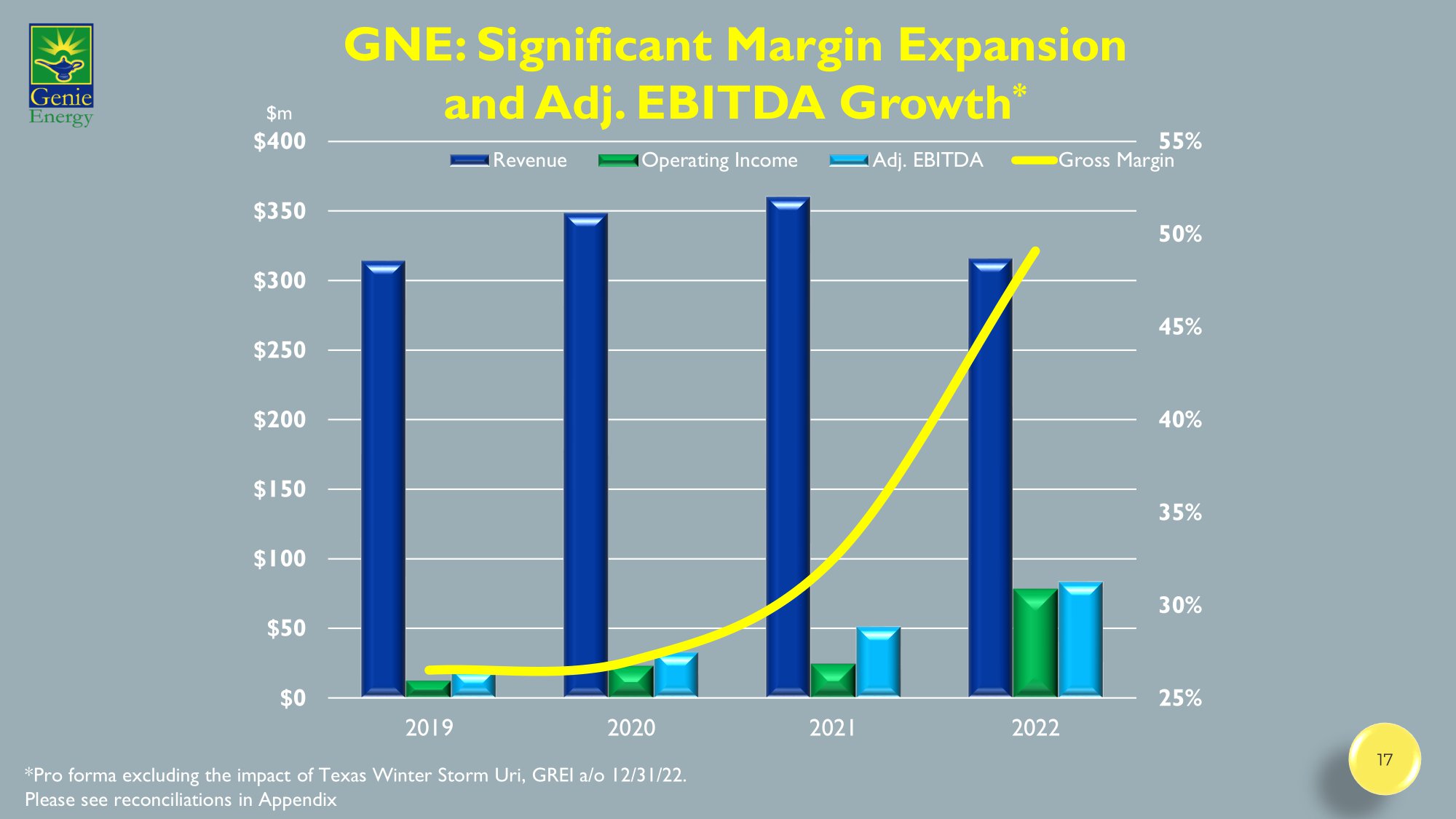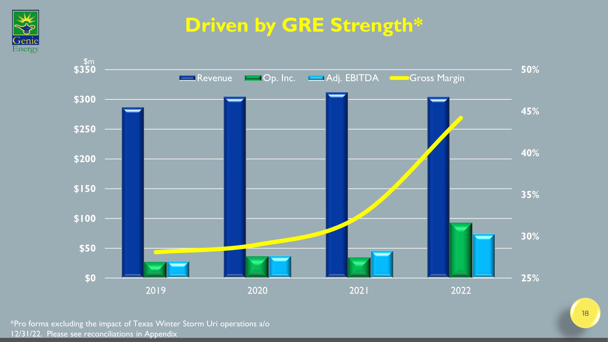 17 GNE: Significant Margin Expansion and Adj. EBITDA Growth * 25% 30% 35% 40% 45% 50% 55% $0 $50 $100 $150 $200 $250 $300 $350 $400 2019 2020 2021 2022 Revenue Operating Income Adj. EBITDA Gross Margin $m *Pro forma excluding the impact of Texas Winter Storm Uri, GREI a/o 12/31/22. Please see reconciliations in Appendix