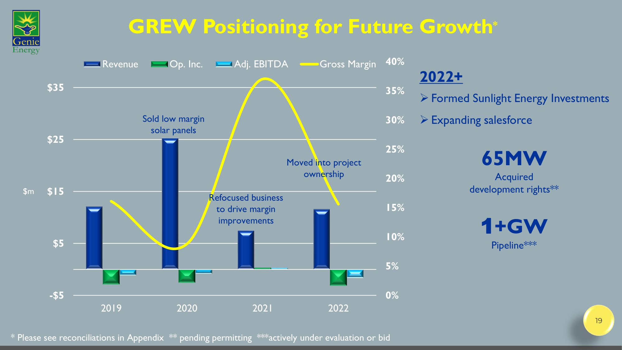 Driven by GRE Strength* 18 25% 30% 35% 40% 45% 50% $0 $50 $100 $150 $200 $250 $300 $350 2019 2020 2021 2022 Revenue Op. Inc. Adj. EBITDA Gross Margin $m *Pro forma excluding the impact of Texas Winter Storm Uri operations a/o 12/31/22. Please see reconciliations in Appendix BS0