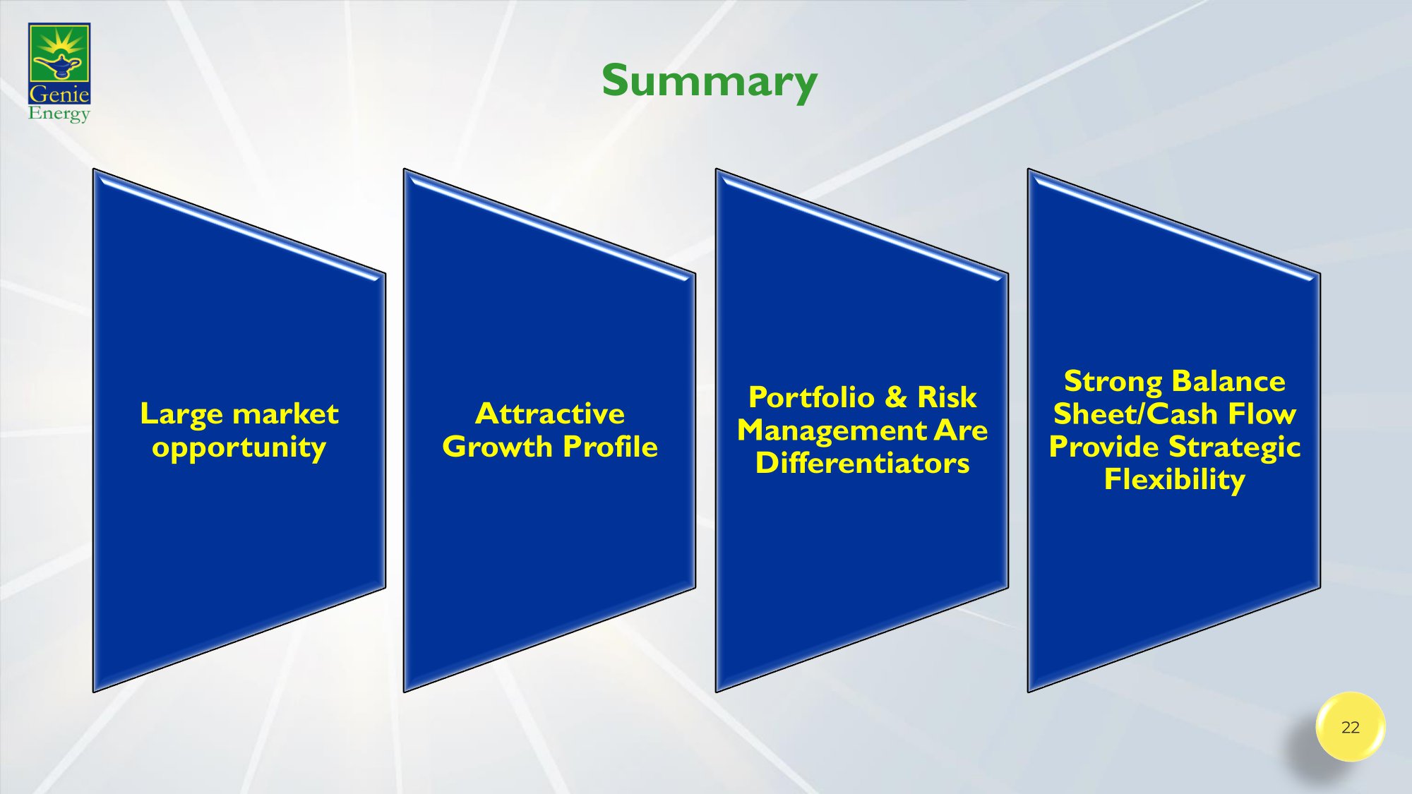 Capital Allocation Strategy Drives Shareholder Returns 21 Common stock dividend (currently $0.075/quarter) Common Stock Preferred Stock Opportunities for outsized growth potential (e.g. Solar) Select M&A Retail Customer acquisition New retail markets New retail products Internal Reinvestment Corporate Development Dividend Share repurchases