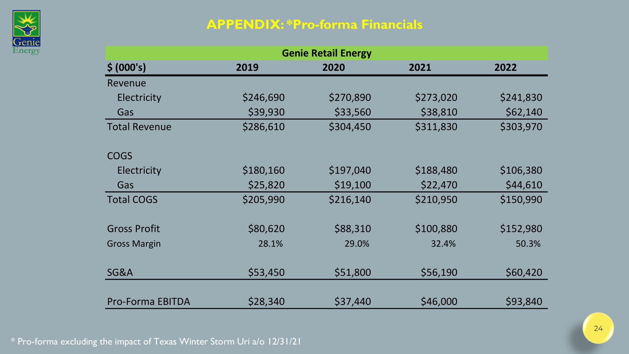 24 APPENDIX: *Pro - forma Financials * Pro - forma excluding the impact of Texas Winter Storm Uri a/o 12/31/21 $ (000's) 2019 2020 2021 2022 Revenue Electricity $246,690 $270,890 $273,020 $241,830 Gas $39,930 $33,560 $38,810 $62,140 Total Revenue $286,610 $304,450 $311,830 $303,970 COGS Electricity $180,160 $197,040 $188,480 $106,380 Gas $25,820 $19,100 $22,470 $44,610 Total COGS $205,990 $216,140 $210,950 $150,990 Gross Profit $80,620 $88,310 $100,880 $152,980 Gross Margin 28.1% 29.0% 32.4% 50.3% SG&A $53,450 $51,800 $56,190 $60,420 Pro-Forma EBITDA $28,340 $37,440 $46,000 $93,840 Genie Retail Energy BS0