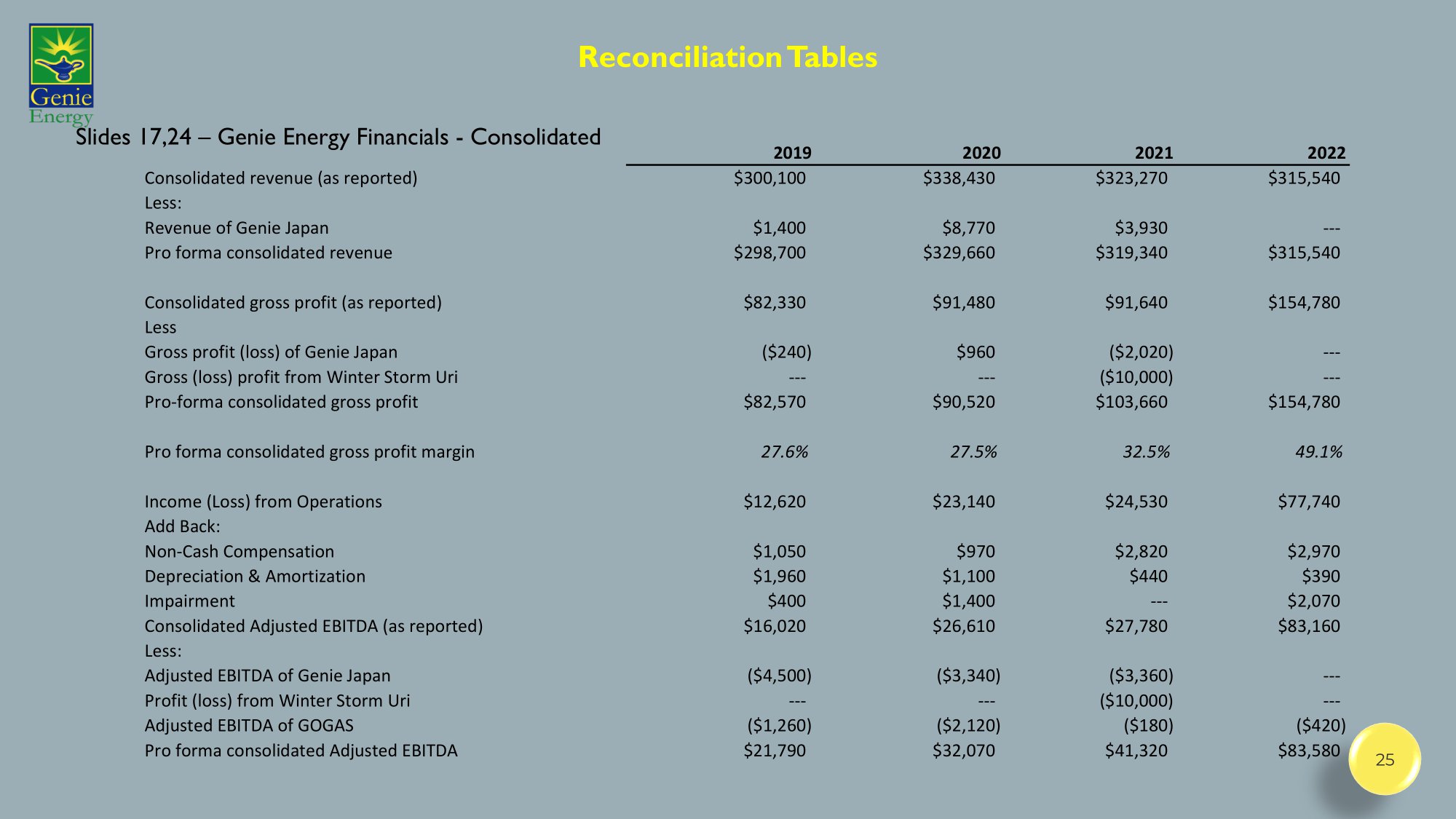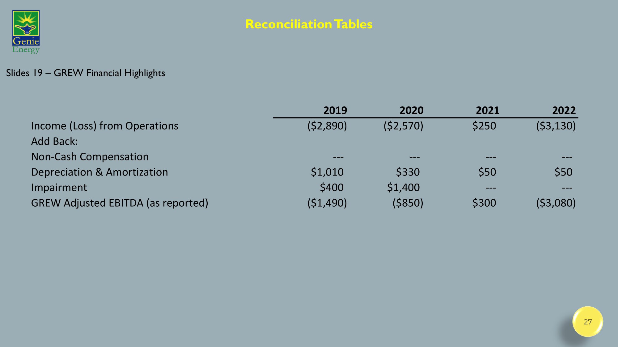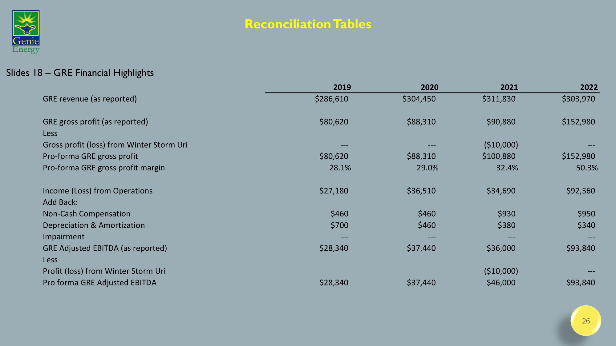 25 Reconciliation Tables Slides 17,24 – Genie Energy Financials - Consolidated 2019 2020 2021 2022 Consolidated revenue (as reported) $300,100 $338,430 $323,270 $315,540 Less: Revenue of Genie Japan $1,400 $8,770 $3,930 --- Pro forma consolidated revenue $298,700 $329,660 $319,340 $315,540 Consolidated gross profit (as reported) $82,330 $91,480 $91,640 $154,780 Less Gross profit (loss) of Genie Japan ($240) $960 ($2,020) --- Gross (loss) profit from Winter Storm Uri --- --- ($10,000) --- Pro-forma consolidated gross profit $82,570 $90,520 $103,660 $154,780 Pro forma consolidated gross profit margin 27.6% 27.5% 32.5% 49.1% Income (Loss) from Operations $12,620 $23,140 $24,530 $77,740 Add Back: Non-Cash Compensation $1,050 $970 $2,820 $2,970 Depreciation & Amortization $1,960 $1,100 $440 $390 Impairment $400 $1,400 --- $2,070 Consolidated Adjusted EBITDA (as reported) $16,020 $26,610 $27,780 $83,160 Less: Adjusted EBITDA of Genie Japan ($4,500) ($3,340) ($3,360) --- Profit (loss) from Winter Storm Uri --- --- ($10,000) --- Adjusted EBITDA of GOGAS ($1,260) ($2,120) ($180) ($420) Pro forma consolidated Adjusted EBITDA $21,790 $32,070 $41,320 $83,580 BS0