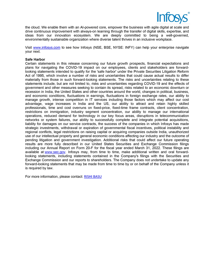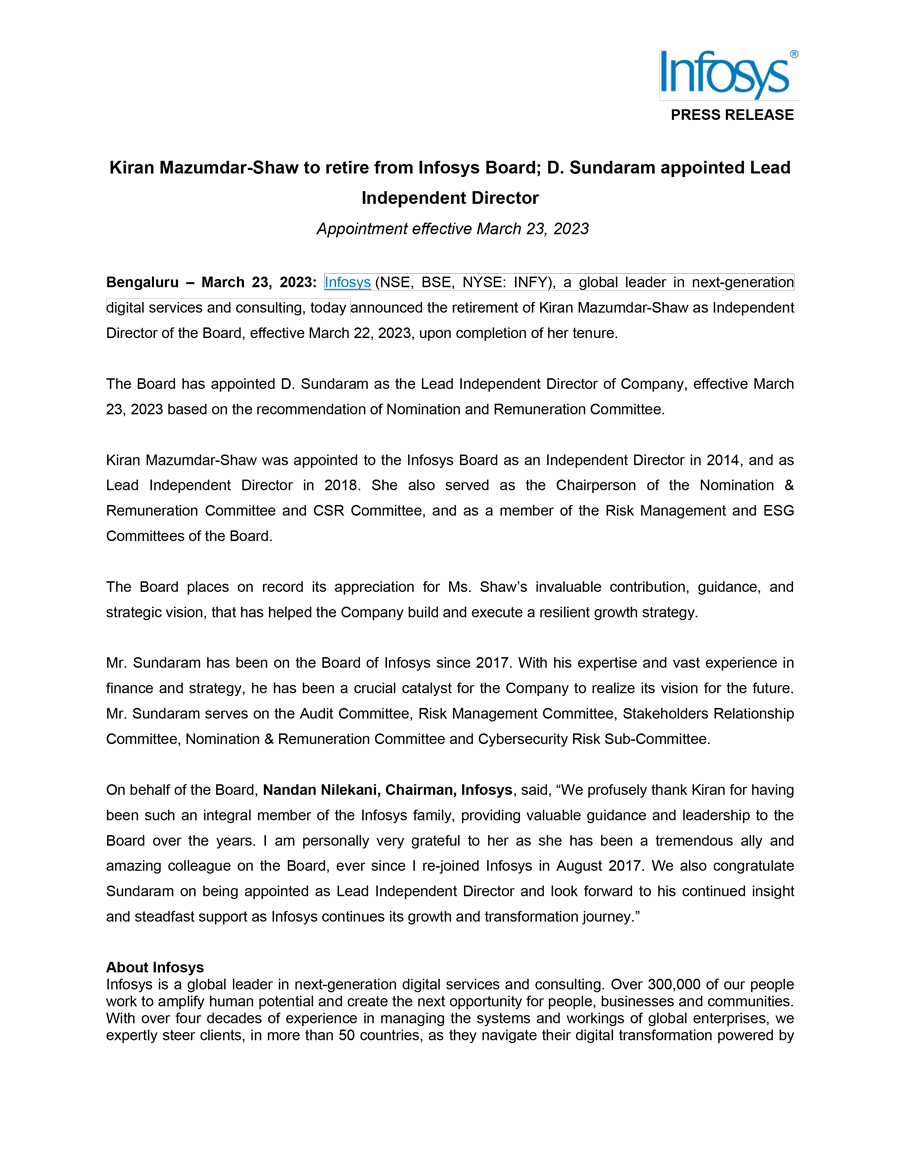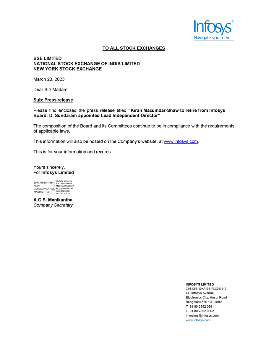 Infosys Limited, a company organized under the laws of the Republic of India ("Infosys", or the "Company"), hereby furnishes with the United States Securities and Exchange Commission this Report on Form 6-K regarding the intimation dated March 23, 2023, pertaining to retirement of Kiran Mazumdar-Shaw from Infosys Board and appointment of D. Sundaram as Lead Independent Director effective March 23, 2023.