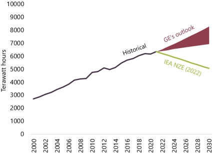Global gas power generation - Historical, IEA NZE and GE outlook