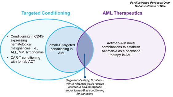 The market opportunity for Iomab-B and Actimab-A, as depicted in the diagram below, exists in AML and for cellular therapy conditioning in various blood cancers. We believe that Iomab-B and Actimab-A can fill the major unmet medical needs in r/r AML in a complementary fashion as they are utilized in different parts of the patient treatment journey. The incidence of AML is approximately 21,000 patients per year, with a prevalence of approximately 70,000 in the U.S., (approximately 27,500 new patients per year in Europe) and the disease has an outsized economic impact relative to its population size. Over 50% of patients diagnosed with AML will develop relapsed or refractory disease, with a median age of 68 years at diagnosis. Despite 10 new approved therapies since 2017, no significant advancements have been made toward a cure and there is a significant unmet need for better therapeutics, which provide the opportunity for Actimab-A. Actimab-A is a targeted radiotherapy for fit patients that has demonstrated an impressive improvement in survival in a proof-of-concept study and is poised for advanced development in collaboration with the NCI. Using Actimab-A in combination with chemotherapy or a targeted therapy, we have the potential opportunity to treat both newly diagnosed or r/r AML patients, with the potential addressable population comparable to the prevalence of patients with AML.