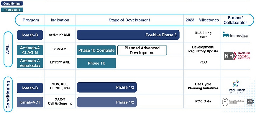 On October 31, 2022, we announced topline results from the pivotal Phase 3 Study of Iomab-B in Elderly Relapsed or Refractory AML or SIERRA trial, which demonstrated that Iomab-B met the primary endpoint of durable Complete Remission (“dCR”) with a high degree of statistical significance (p<0.0001). On February 18, 2023, we announced full trial results, demonstrating unprecedented access, improved outcomes and better safety and tolerability with double 1-year and median overall survival (“OS”) compared to control arm patients receiving Iomab-B at the 2023 Tandem Meetings aka the Transplantation & Cellular Therapy Meetings of the American Society for Transplantation and Cellular Therapy (“ASTCT”) and the Center for International Blood & Marrow Transplant Research (“CIBMTR”). We believe these results provide the opportunity to establish Iomab-B as a new standard of care, and if approved, we intend to commercialize the product in the United States (“U.S.”).