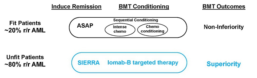 The ASAP approach is limited to only FIT patients as the UNFIT patients treated in SIERRA could not tolerate ASAP’s highly toxic sequential conditioning approach. Sequential conditioning is not novel as a similar trial to ASAP was conducted by the UK National Cancer Research Institute in 2019, which did not show any benefit from this approach in high-risk AML and MDS patients (Craddock et al. Augmented Reduced Intensity Regimen Does Not Improve Postallogeneic Transplant Outcomes in Acute Myeloid Leukemia. J Clin Oncol. 2021). The SIERRA trial results therefore can change the paradigm in transplant because non-transplantable patients in routine clinical practice can benefit from a transplant with Iomab-B and have superior outcomes. While both approaches in these trials support increased access to BMT, only Iomab-B is applicable to the unfit patients who comprise approximately 80%of r/r AML patients and can potentially expand the market for transplant.
