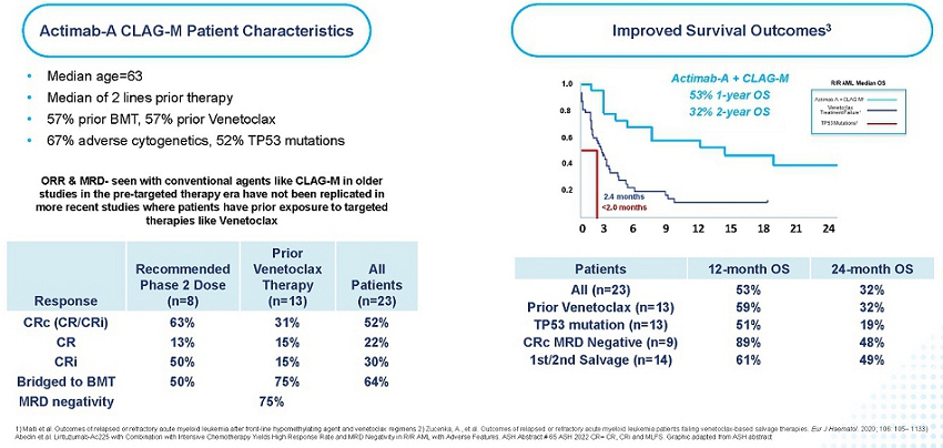 On December 10, 2022, we shared the Phase 1 results from the Actimab-A CLAG-M combination trial at the American Society of Hematology (“ASH”) Annual Meeting & Exposition that showed high response rates and minimal residual disease (“MRD”) negativity, translating to a meaningful survival benefit of 53%and 32%at one and two years in patients who are typically expected to live two to four months. At the same meeting, we shared Phase 1 data showing that the combination of Actimab-A + venetoclax was well-tolerated with responses, including a Complete Remission (“CR”) and a partial response in early dose escalation cohorts. We believe the promise of these results paved the way for the NCI Cooperative Research and Development Agreement (“CRADA”), announced on February 6, 2023, to develop Actimab-A for the treatment of patients with AML and other hematologic malignancies.