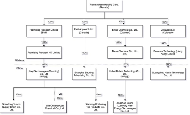 Planet Green Holdings Corp. (the “Planet Green”), headquartered in Flushing, NY, is not an operating company in the PRC but a Nevada holding company with its operations conducted through its subsidiaries in the PRC, U.S., Hong Kong and Canada (the “Subsidiaries”) and through contractual arrangements with its variable interest entity, Jilin Chuanyuan (the “VIE”), which is a company incorporated in the PRC. Planet Green is engaged in a number of diverse business activities, including consumer products, chemical products, and online advertising and mobile game. The VIE is consolidated for accounting purpose only and Planet Green does not own any equity interest in the VIE. Investors may never directly hold equity interests in the VIE. The VIE structure is used to provide investors with exposure to foreign investment in China-based companies where Chinese law prohibits or limits direct foreign investment in the operating companies. However, our contractual arrangements with the VIE are not equivalent of an investment in the VIE. Investors of our securities thus are not purchasing equity interest in the VIE and their subsidiaries in China but instead are purchasing equity interest in a Nevada holding company. Such VIE arrangement is not identical to owning such entities directly, and investors will own shares in a holding company with contracts with the VIE and will not have any equity ownership of such VIE itself. The VIE arrangement may not be as effective as direct ownership in providing us with control over the VIE. Direct ownership would allow us, for example, to directly or indirectly exercise our rights as a shareholder to effect changes in the boards of directors, which, in turn, could affect changes, subject to any applicable fiduciary obligations at the management level. However, under the VIE arrangement, as a legal matter, if the VIE or its shareholders fail to perform their respective obligations under the VIE arrangement, we may have to incur substantial costs and expend significant resources to enforce those arrangements and resort to litigation or arbitration and rely on legal remedies under PRC laws. These remedies may include seeking specific performance or injunctive relief and claiming damages, any of which may not be effective. In the event we are unable to enforce these VIE Agreements or we experience significant delays or other obstacles in the process of enforcing the VIE arrangement, we may lose control over the assets owned by the VIE.