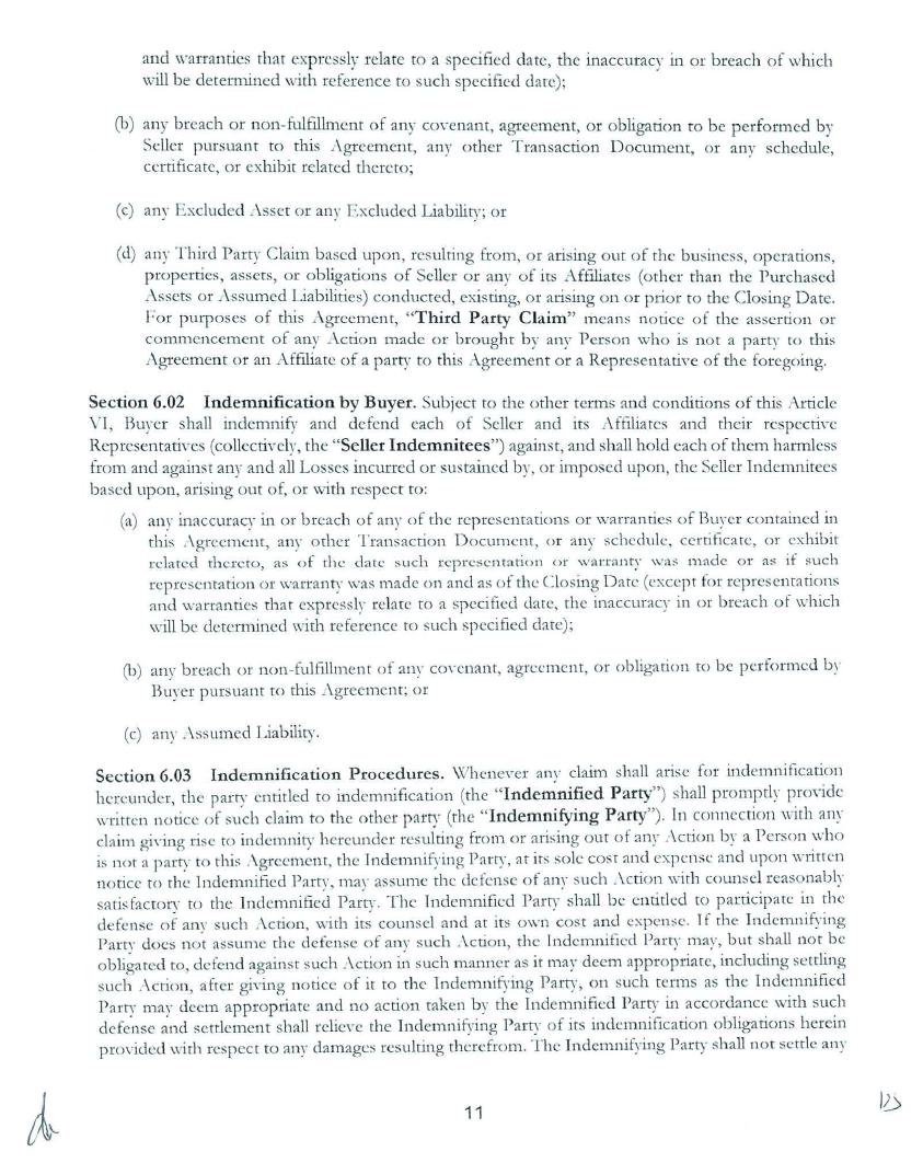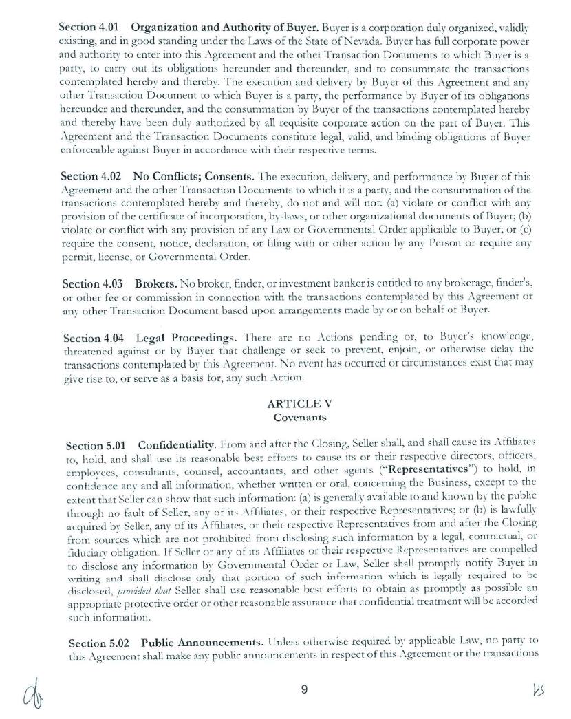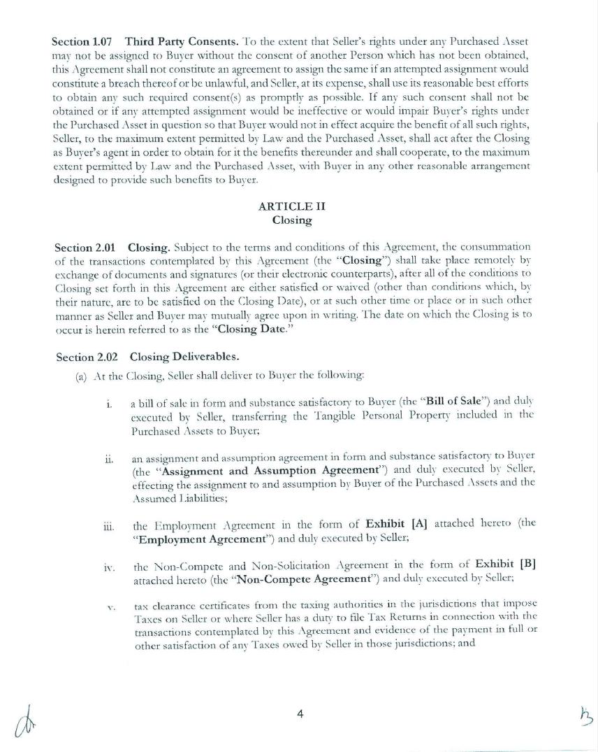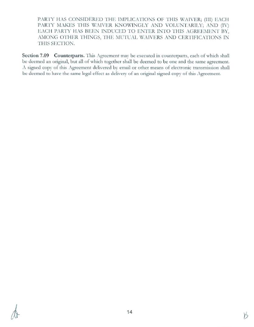 Section 9.07 Counterparts. This Agreement may be executed in counterparts, each of which shall be deemed an original, but all of which together shall be deemed to be one and the same agreement. A signed copy of this Agreement delivered by facsimile, e-mail or other means of electronic transmission shall be deemed to have the same legal effect as delivery of an original signed copy of this Agreement.