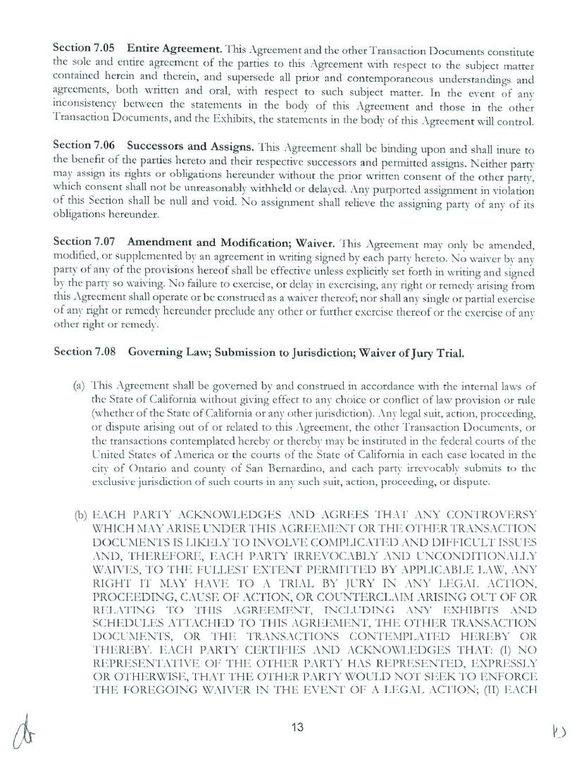 Section 9.08 Entire Agreement; Amendments; Severability. This Agreement, including all exhibits and schedules hereto, as amended from time to time in accordance with the terms of this Agreement, contains the entire agreement between the parties relative to the subject matters hereof. This Agreement or the Articles of Organization may only be amended or modified by writing executed and delivered by Members owning not less than seventy-five percent (75%) of the Membership Interests. If any provision of this Agreement or the application thereof to any person or circumstance shall be invalid or unenforceable to any extent, the remainder of this Agreement and the application of such provisions to other persons or circumstances shall not be affected thereby, and the intent of this Agreement shall be enforced to the greatest extent permitted by law. The designations of Members and Manager as used herein shall include singular, plural, masculine, feminine or neuter as required by context.