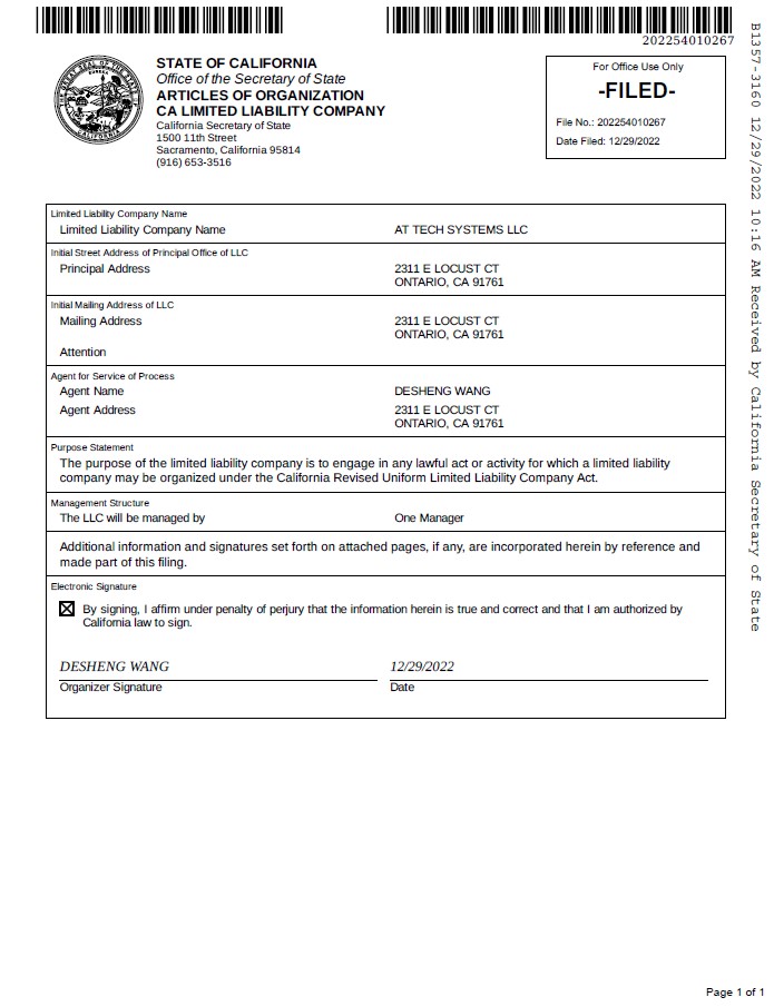 AT TECH SYSTEMS LLC, a California limited liability company | |