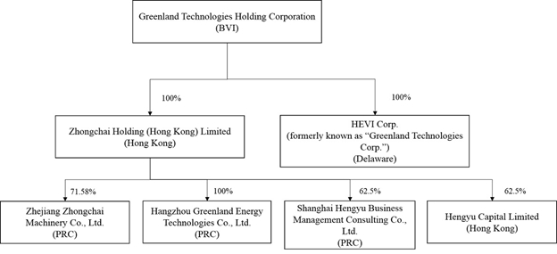 HEVI Corp. (“HEVI”), formerly known as Greenland Technologies Corp. prior to May 2022, was incorporated on January 14, 2020 under the laws of the State of Delaware. HEVI is a wholly-owned subsidiary of Greenland and promotes sales of sustainable alternative products for the heavy industrial equipment industry, including electric industrial vehicles, in the North American market.