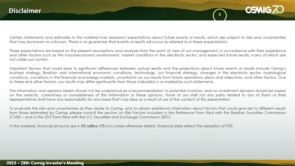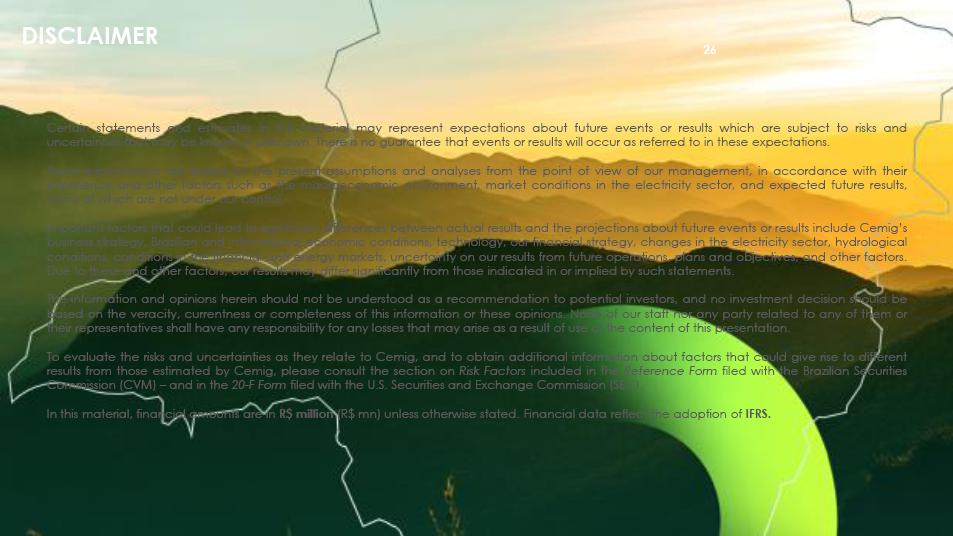 This report contains statements about expected future events and financial results that are forward-looking and subject to risks and uncertainties. Actual results could differ materially from those predicted in such forward-looking statements. Factors which may cause actual results to differ materially from those discussed herein include those risk factors set forth in our most recent Annual Report on Form 20-F filed with the Securities and Exchange Commission. CEMIG undertakes no obligation to revise these forward-looking statements to reflect events or circumstances after the date hereof, and claims the protection of the safe harbor for forward-looking statements contained in the Private Securities Litigation Reform Act of 1995.